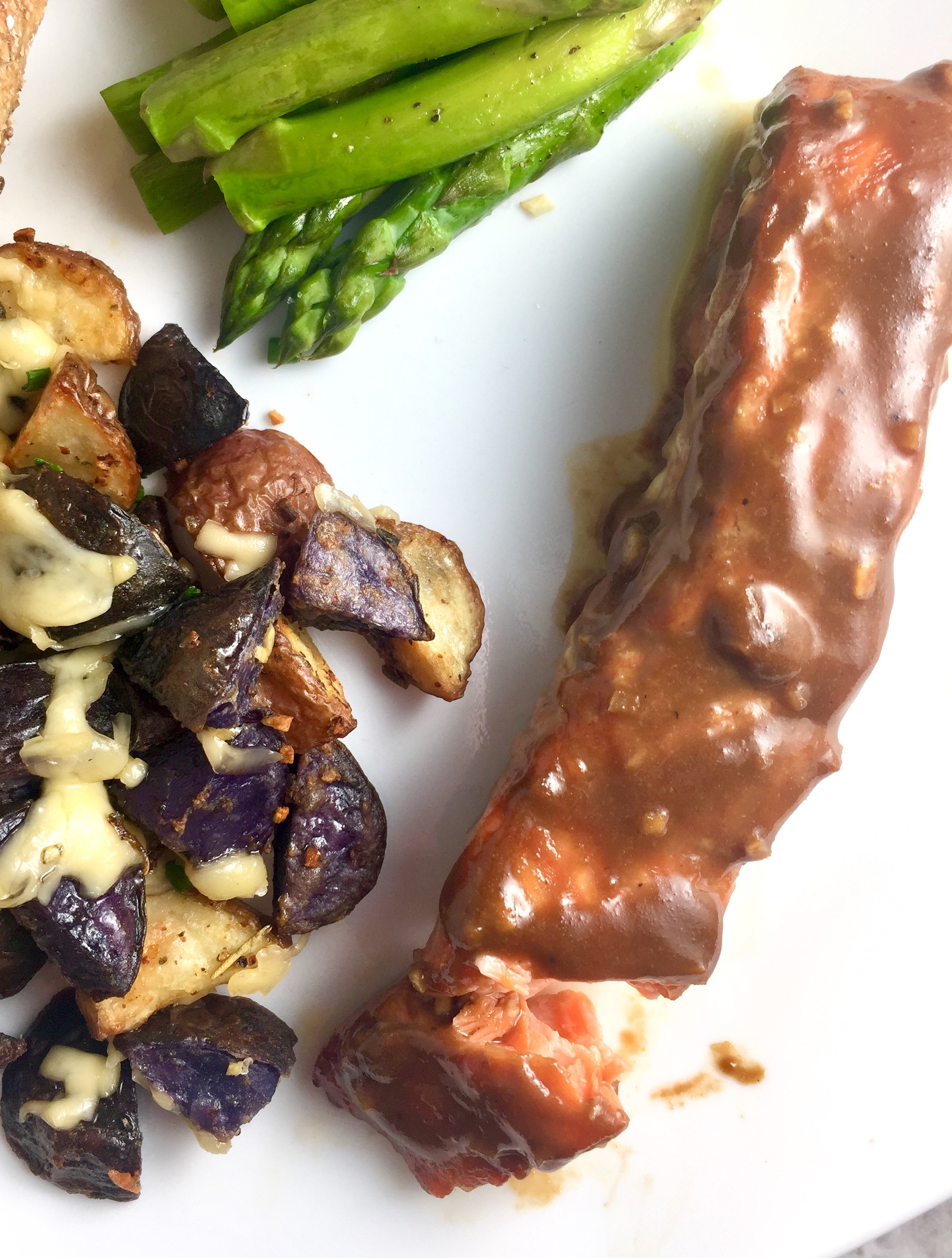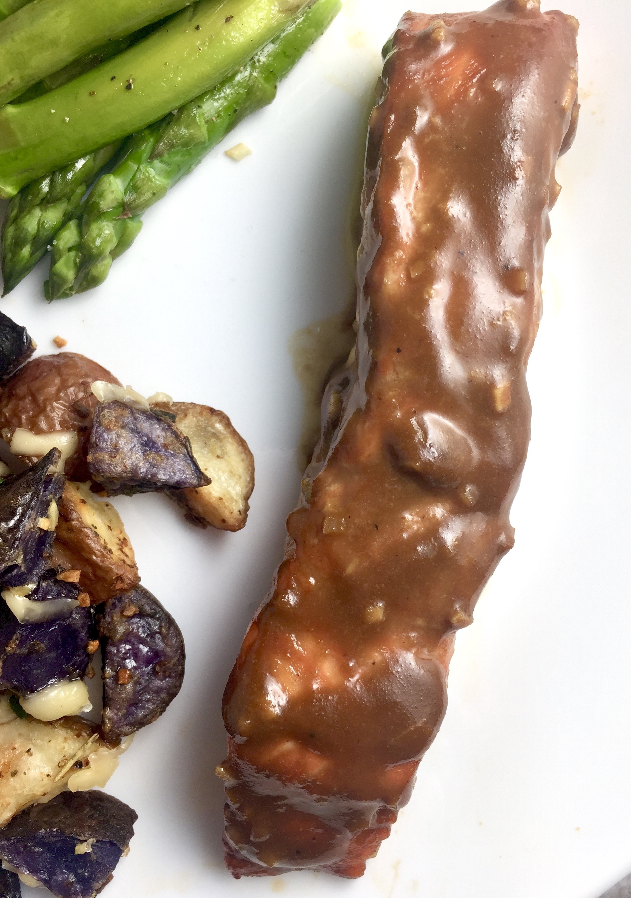 - Combine maple syrup, balsamic vinegar, dijon, and garlic in a baggy. (Press until incorporated.) Skin salmon and cut into 2 filets if necessary, then add to baggy. Squeeze out air, seal, and marinate in refrigerator at least 2 hours (or overnight).