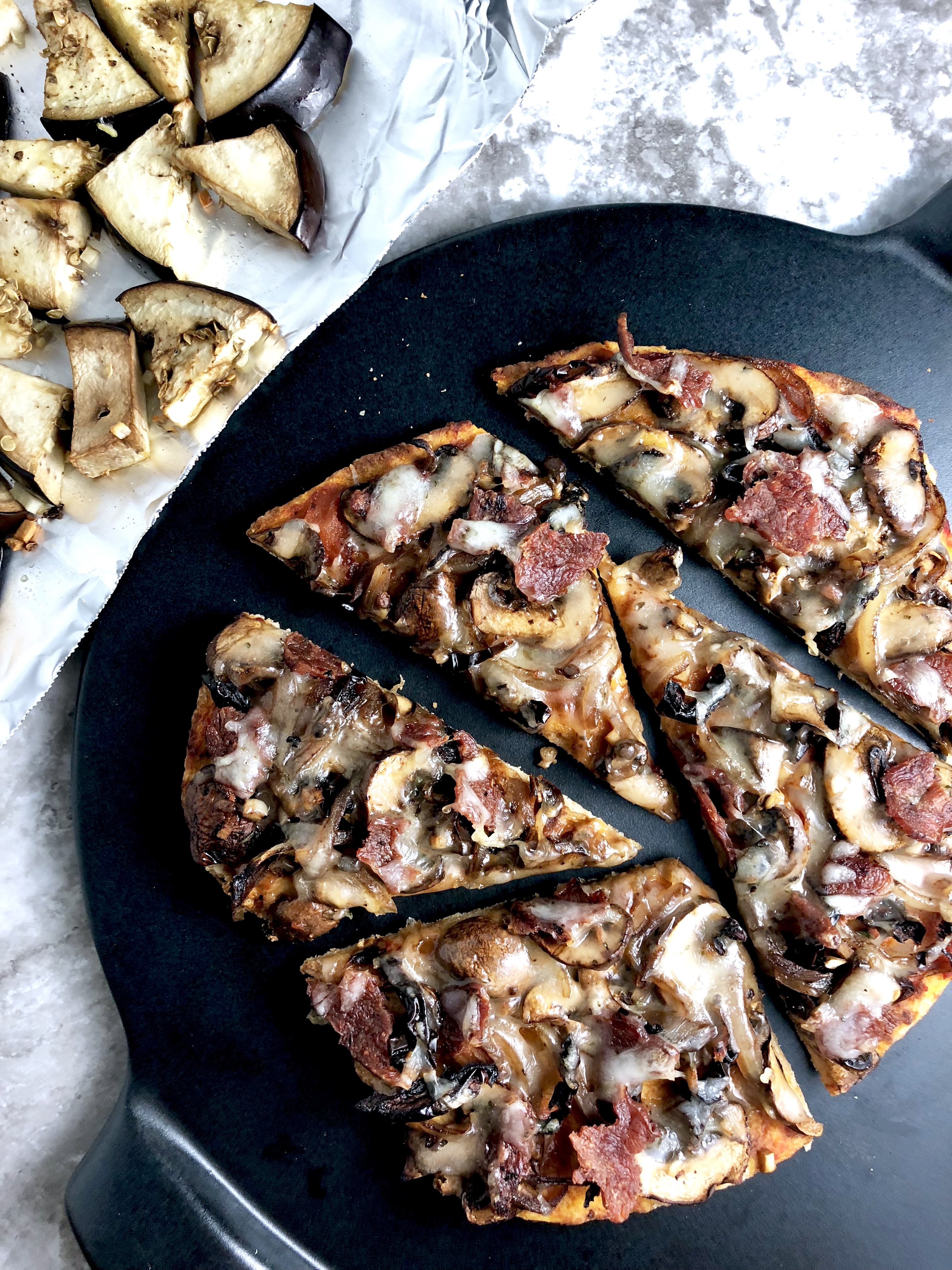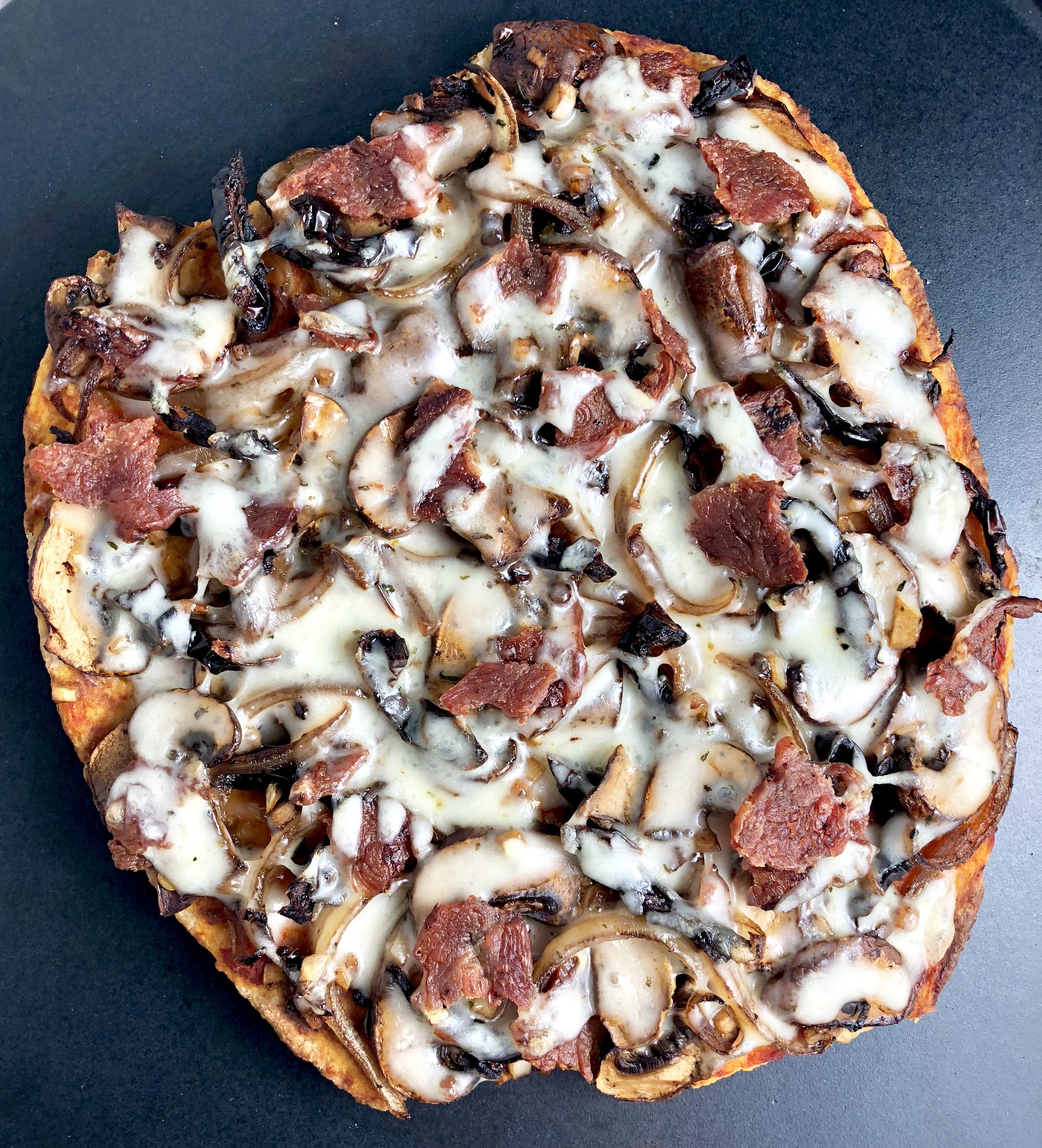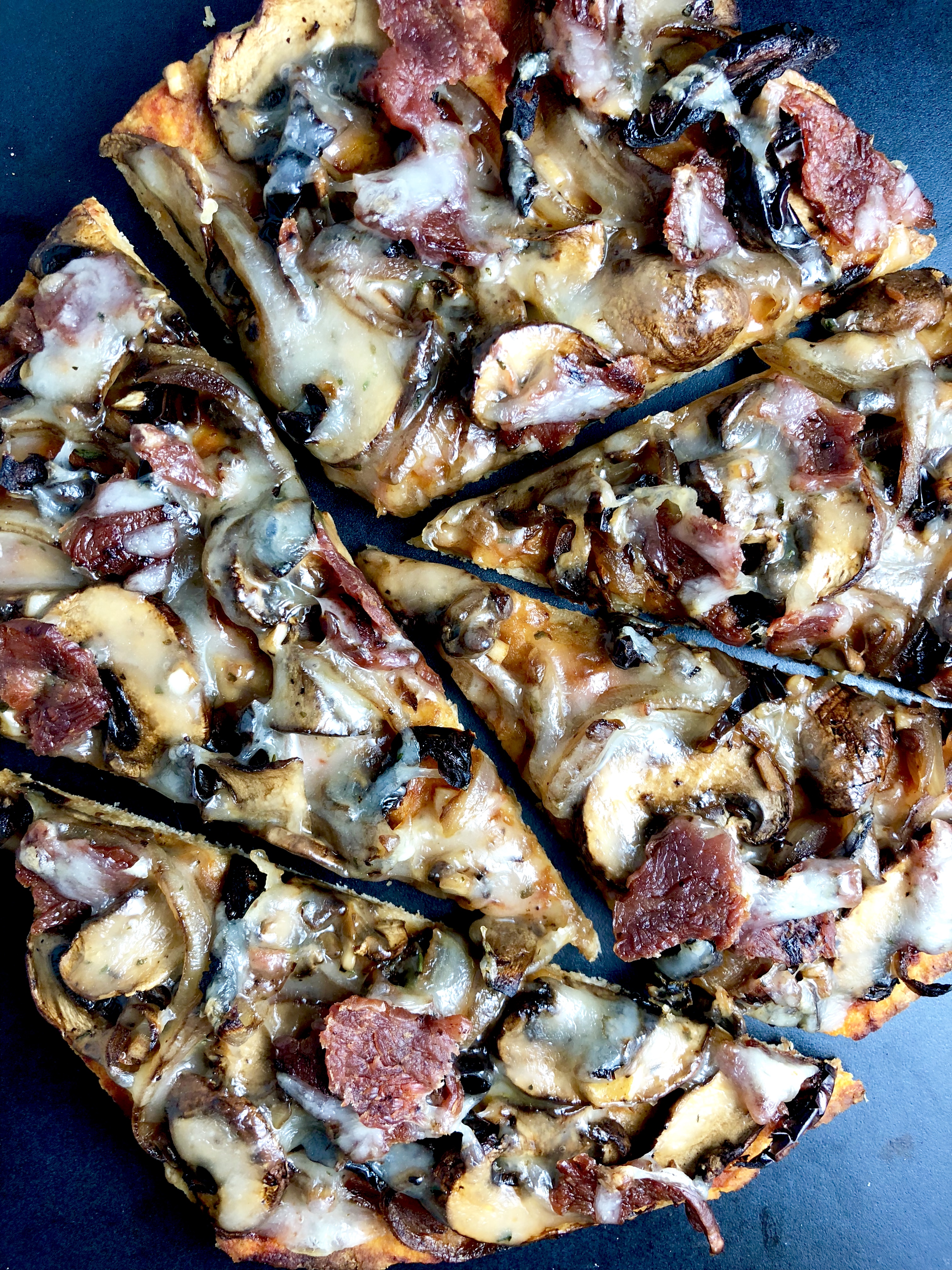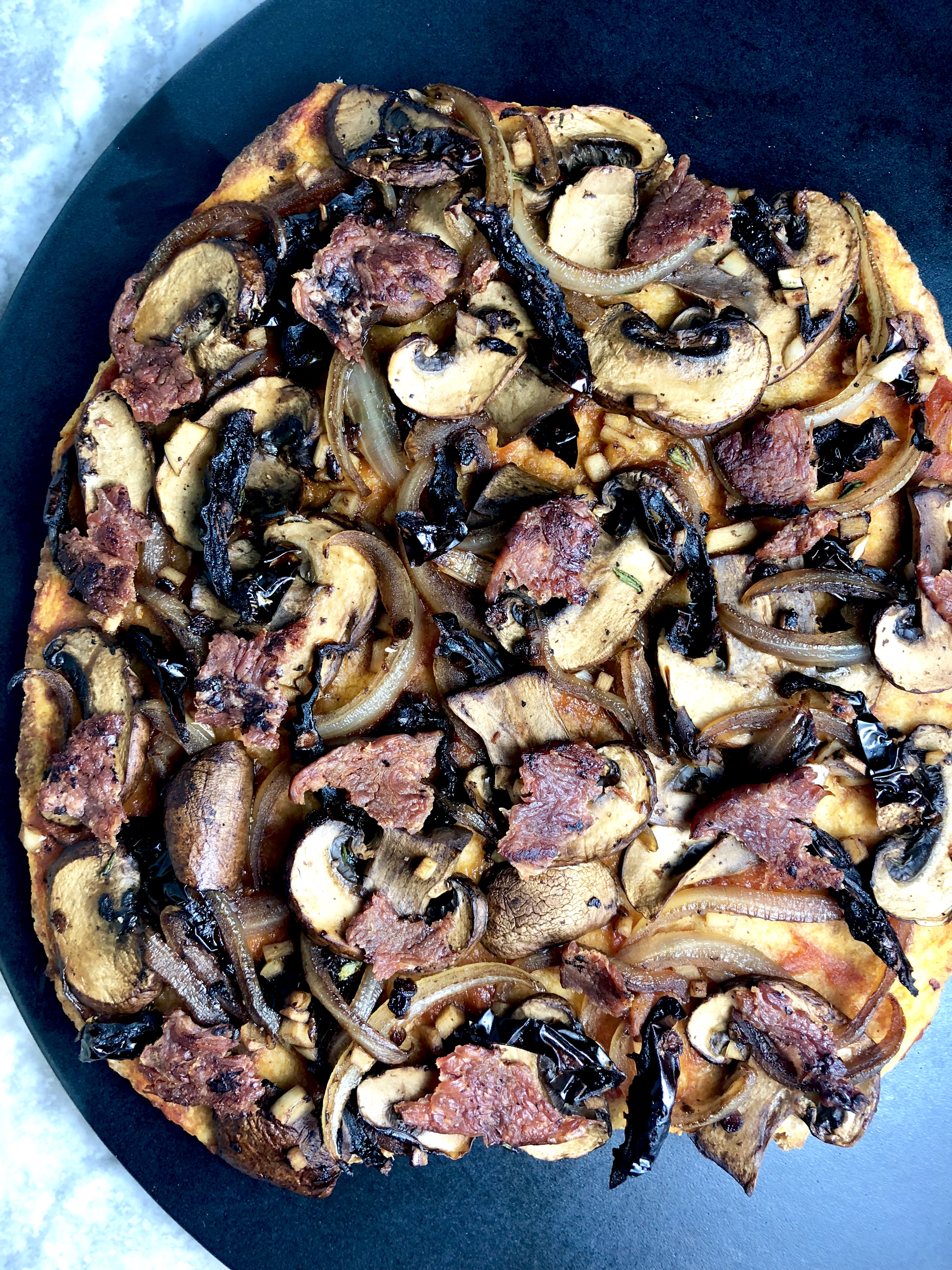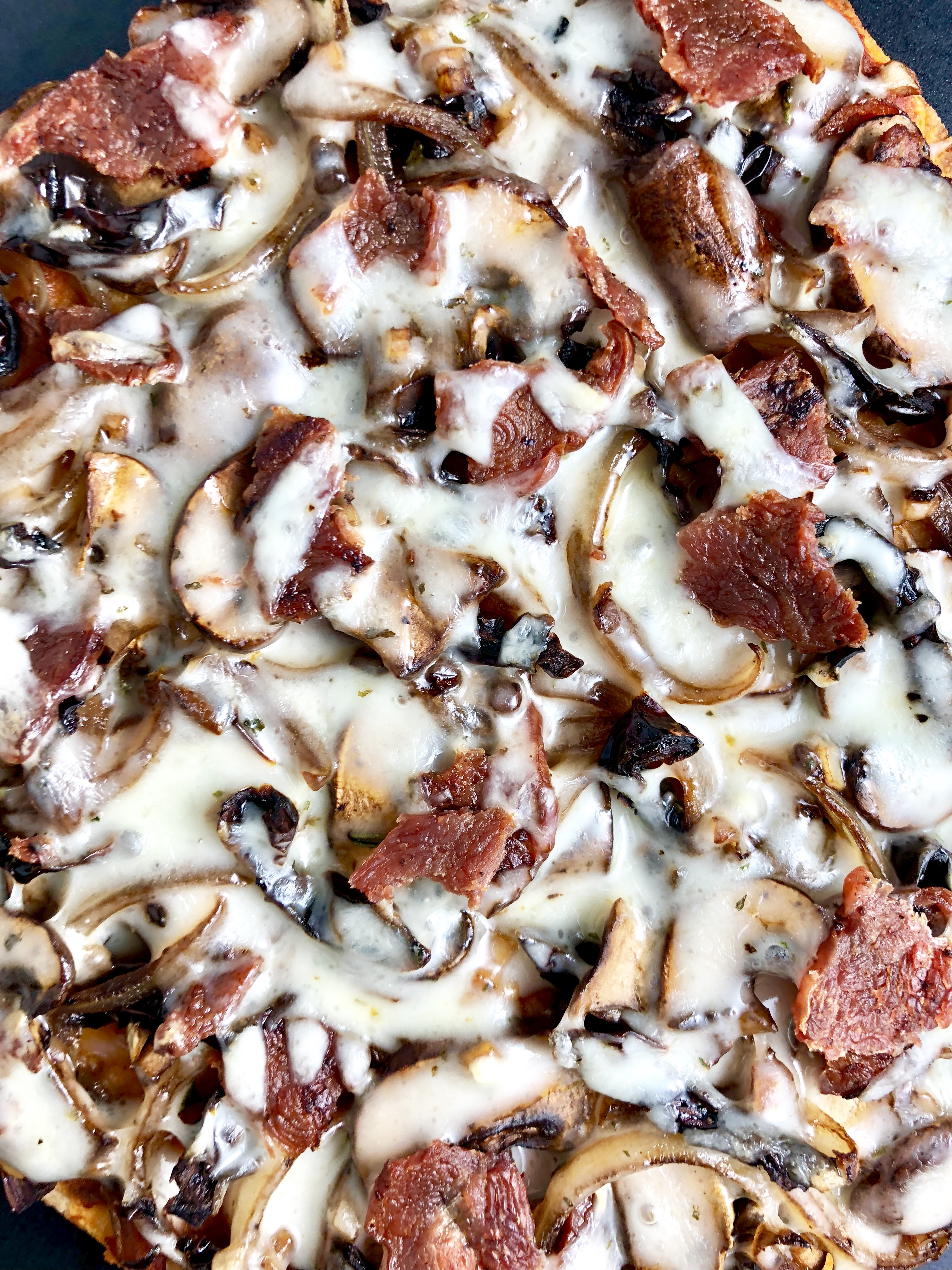 Meaty cremini mushrooms, caramelized onions, garlic, flavorful sun-dried tomatoes, and fresh thyme tossed in rich balsamic vinegar; light marinara; crispy bacon; and melty garlicky herbed cheese atop a crisp whole grain homemade crust or naan. Aka the pizza of your DREAMS.