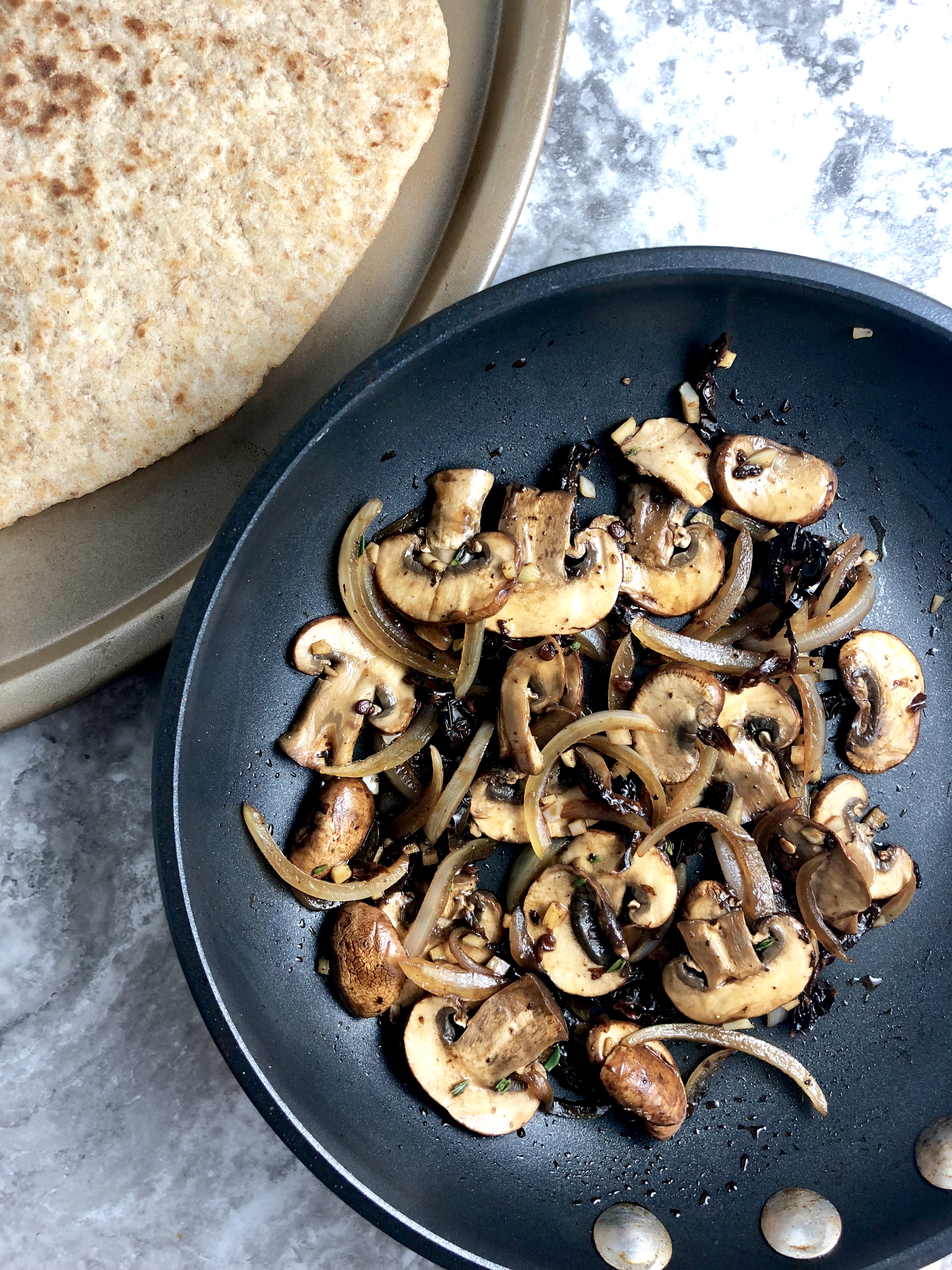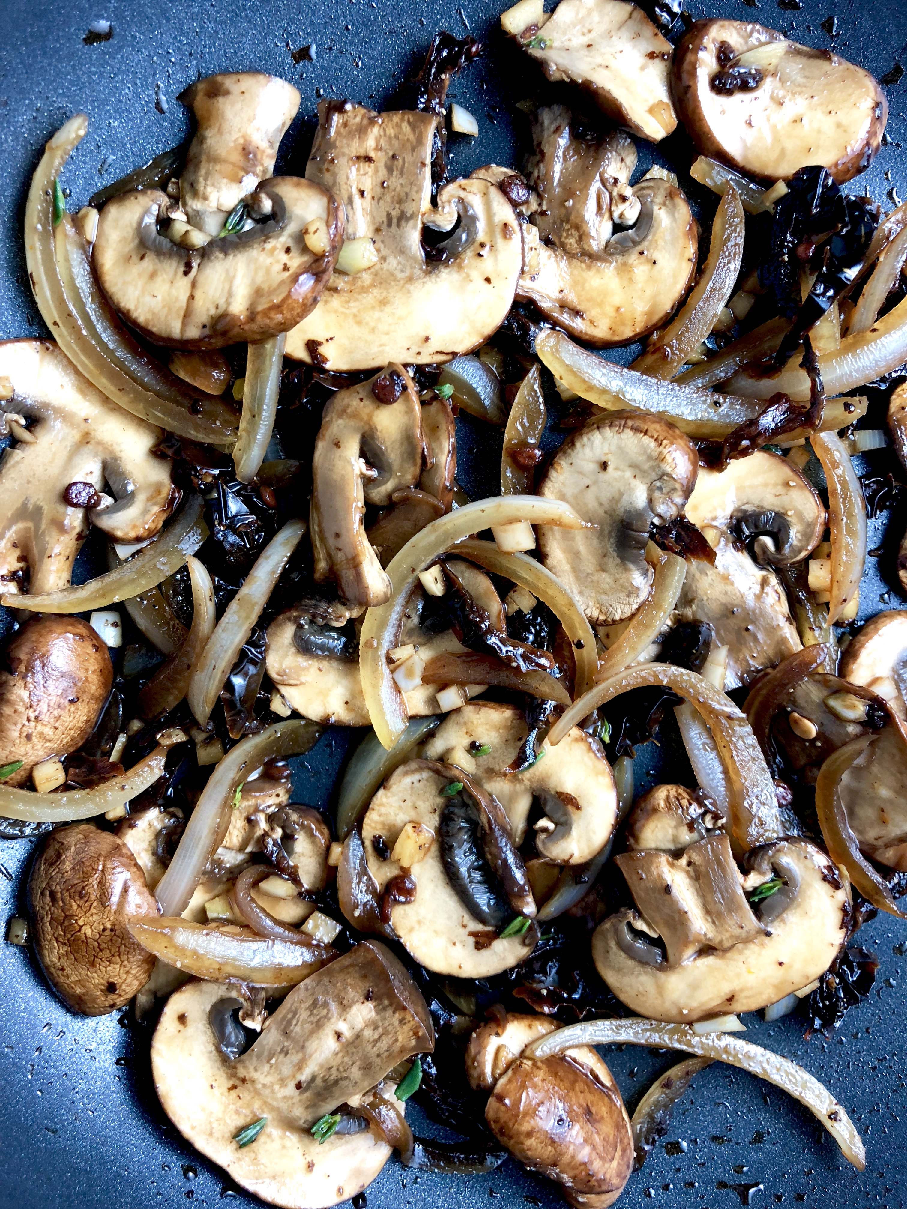 - Add mushrooms and onions to the same skillet with a splash of liquid to deglaze* (keeping liquid to a minimum to avoid a soggy crust later). Sauté over medium a few minutes, until tender, then stir in the garlic, sun-dried tomatoes, and thyme for another 1-2 minutes. Finally, stir in balsamic vinegar.