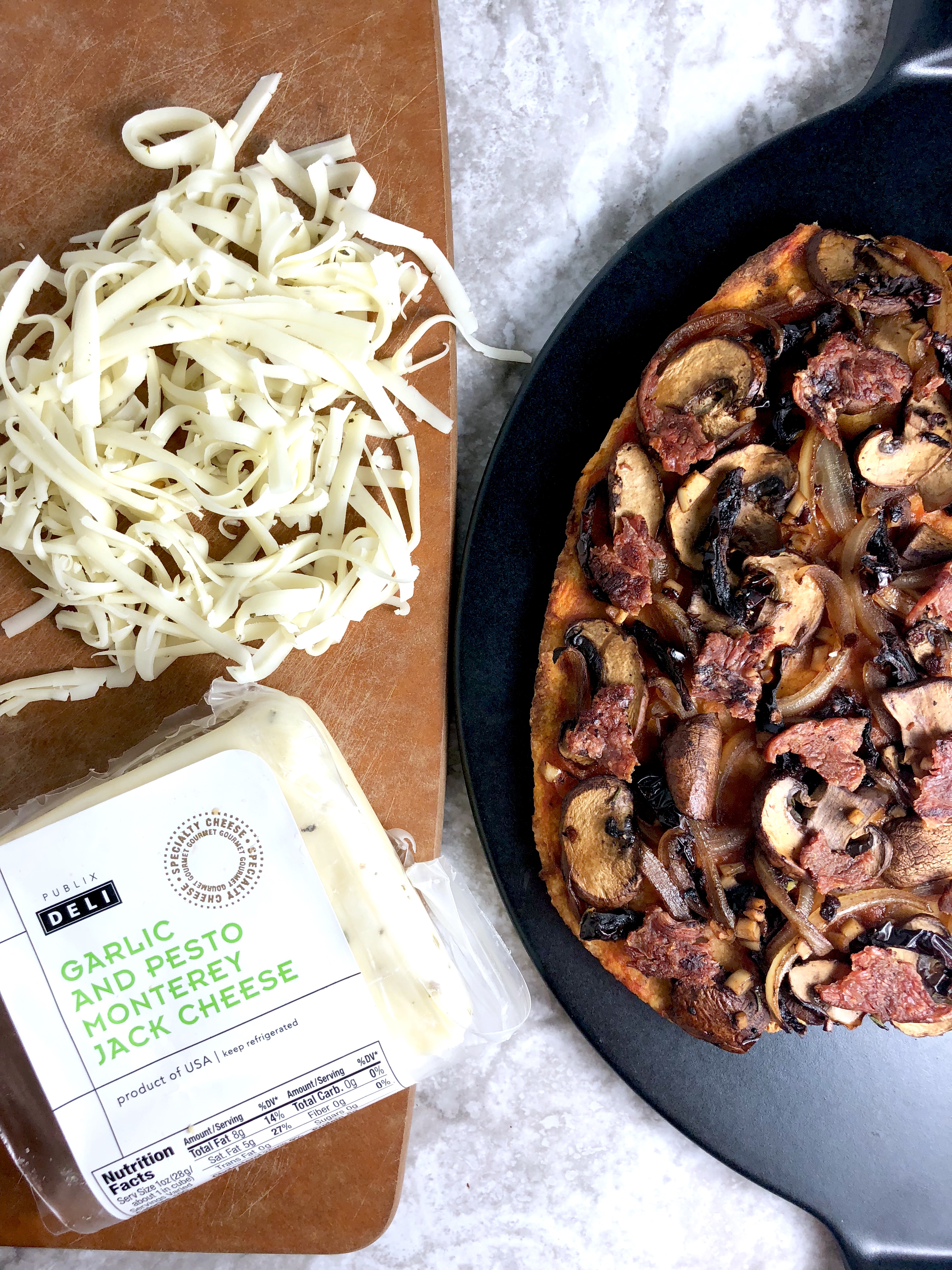 The cheese I used here was a magical blend of Monterey jack, garlic, and basil. But anything from (smoked) mozzarella to provolone to fontina to gruyere to gouda would come out beautifully.