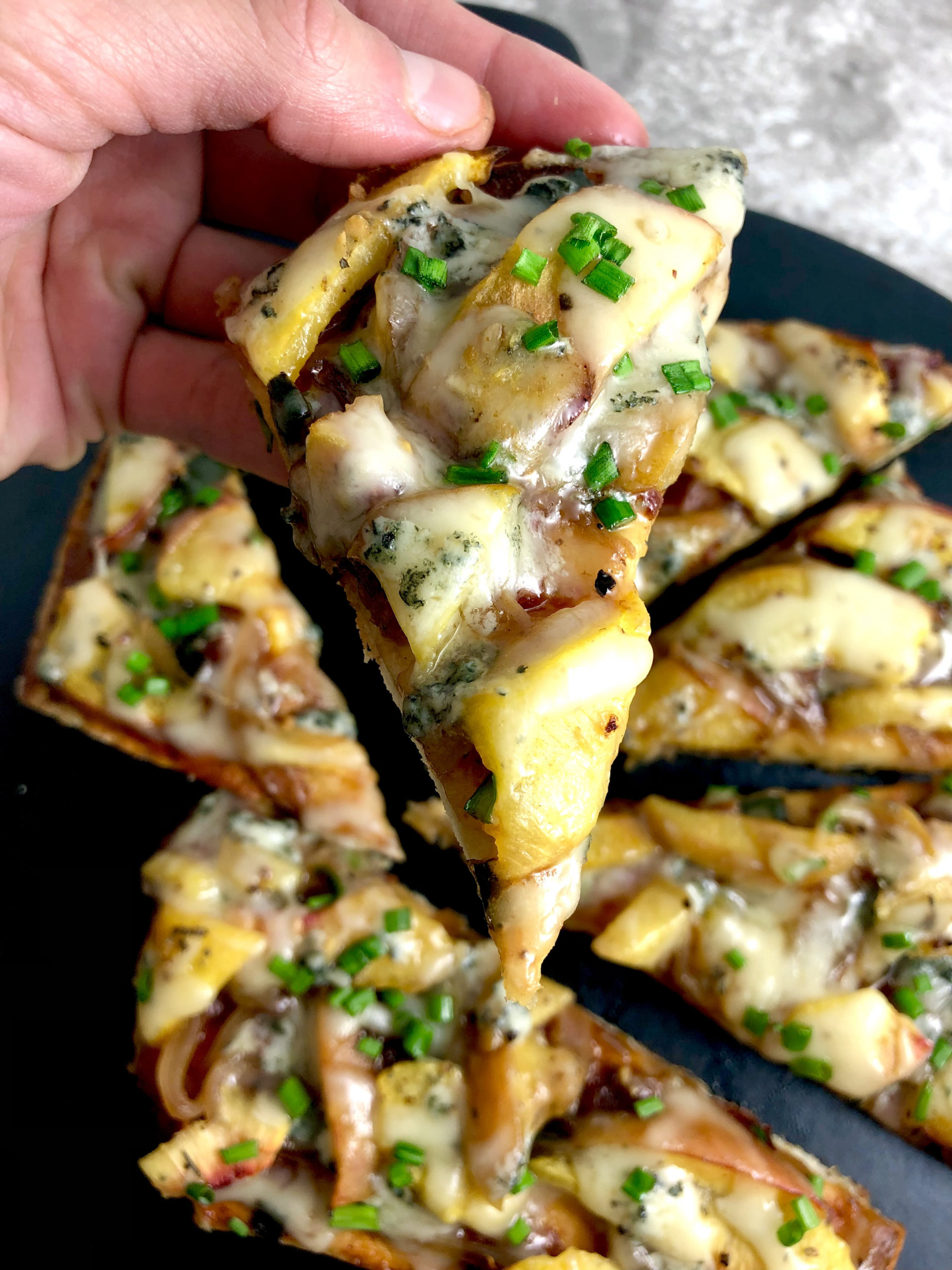 For the crust I use garlic naan, which is hearty enough to remain super crisp on the bottom and chewy in the middle while holding all the yummy toppings. If using pizza dough to make a thinner crust, just keep the sauce light, onions without extra juices, and peaches extra thin.