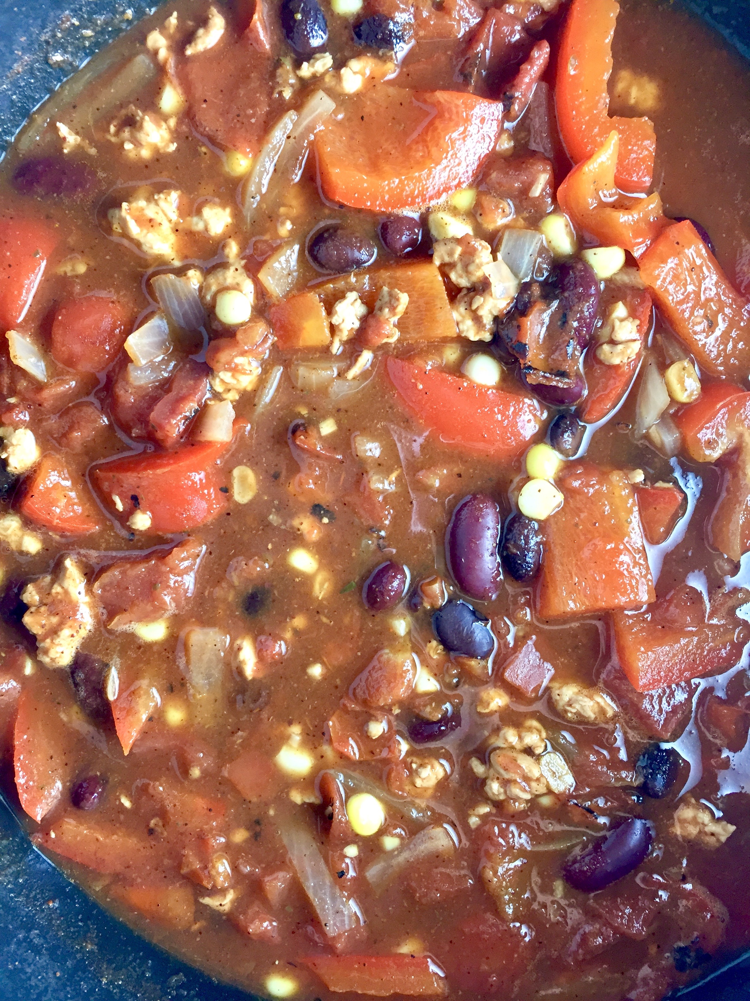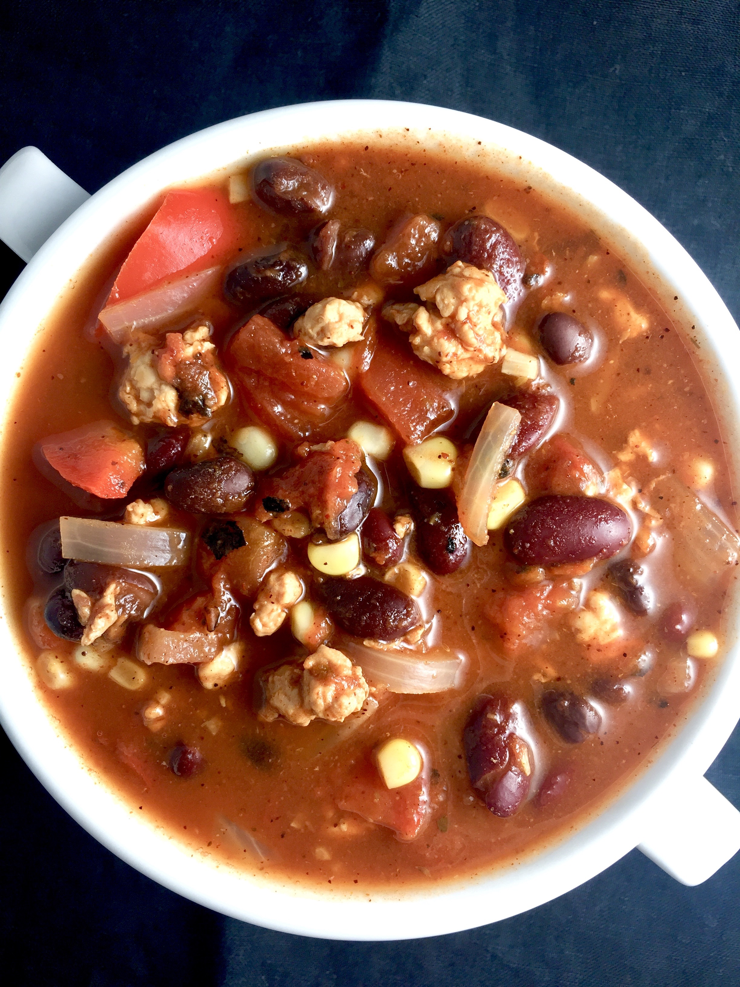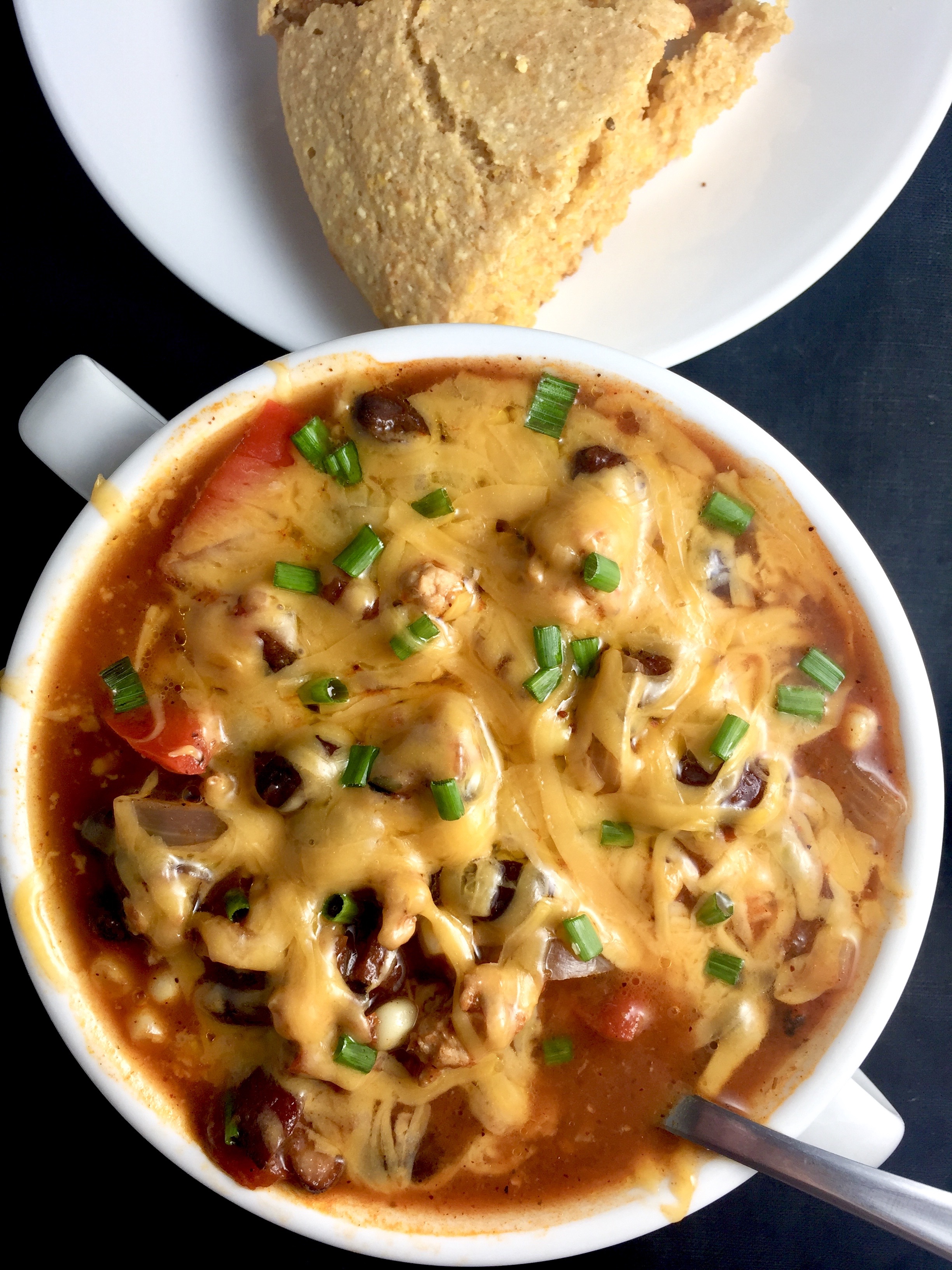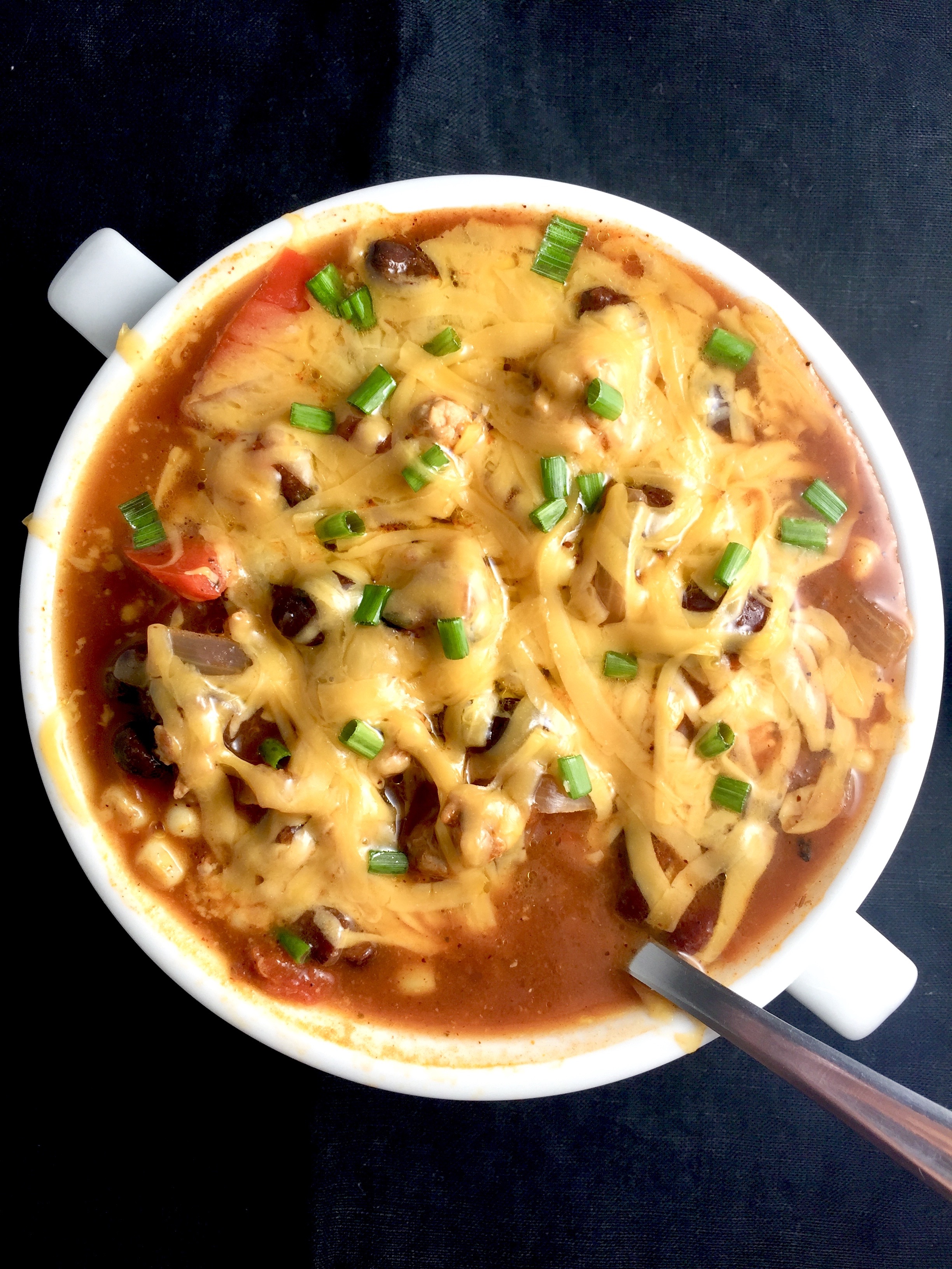 The flavor is not hot but wonderfully spicy, thanks to the melding of several awesome spices and an extra punch from BBQ sauce. A medley of textures comes from hearty beans, tender bell pepper, onion, and corn, plump tomatoes, and ground chicken breast–which is super lean but unbelievably tender! And that melty cheese just brings it all together…can never go wrong there. 😉