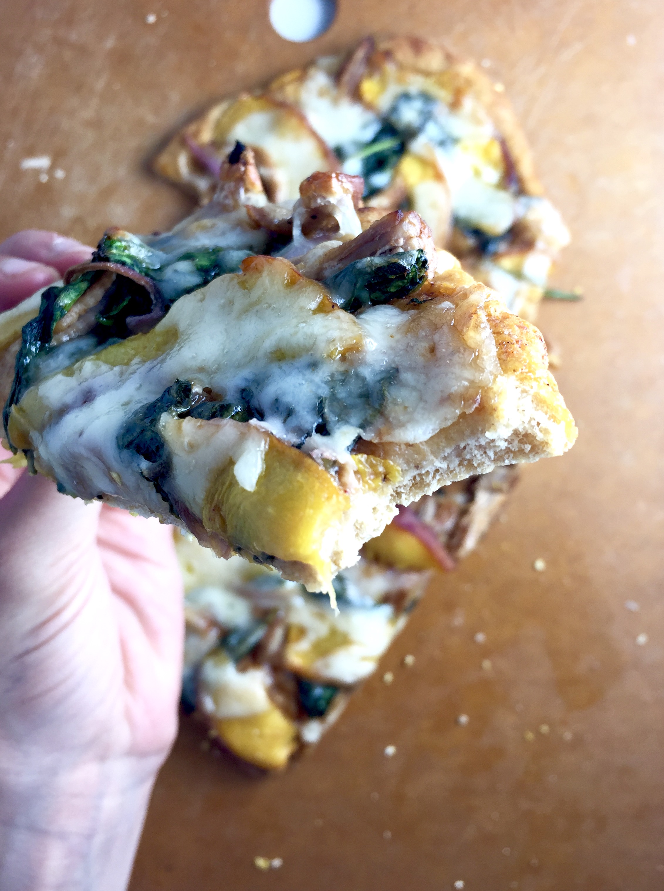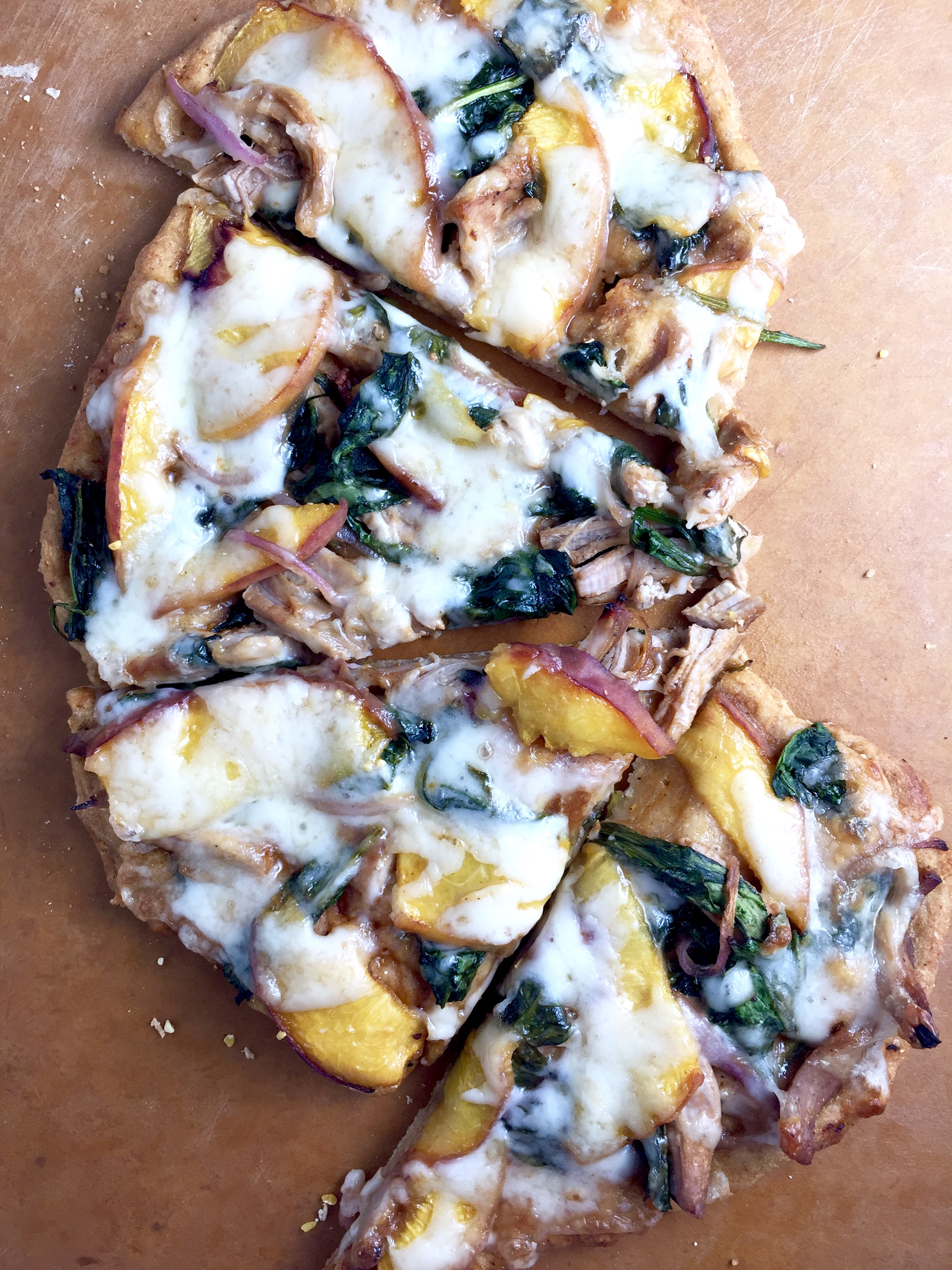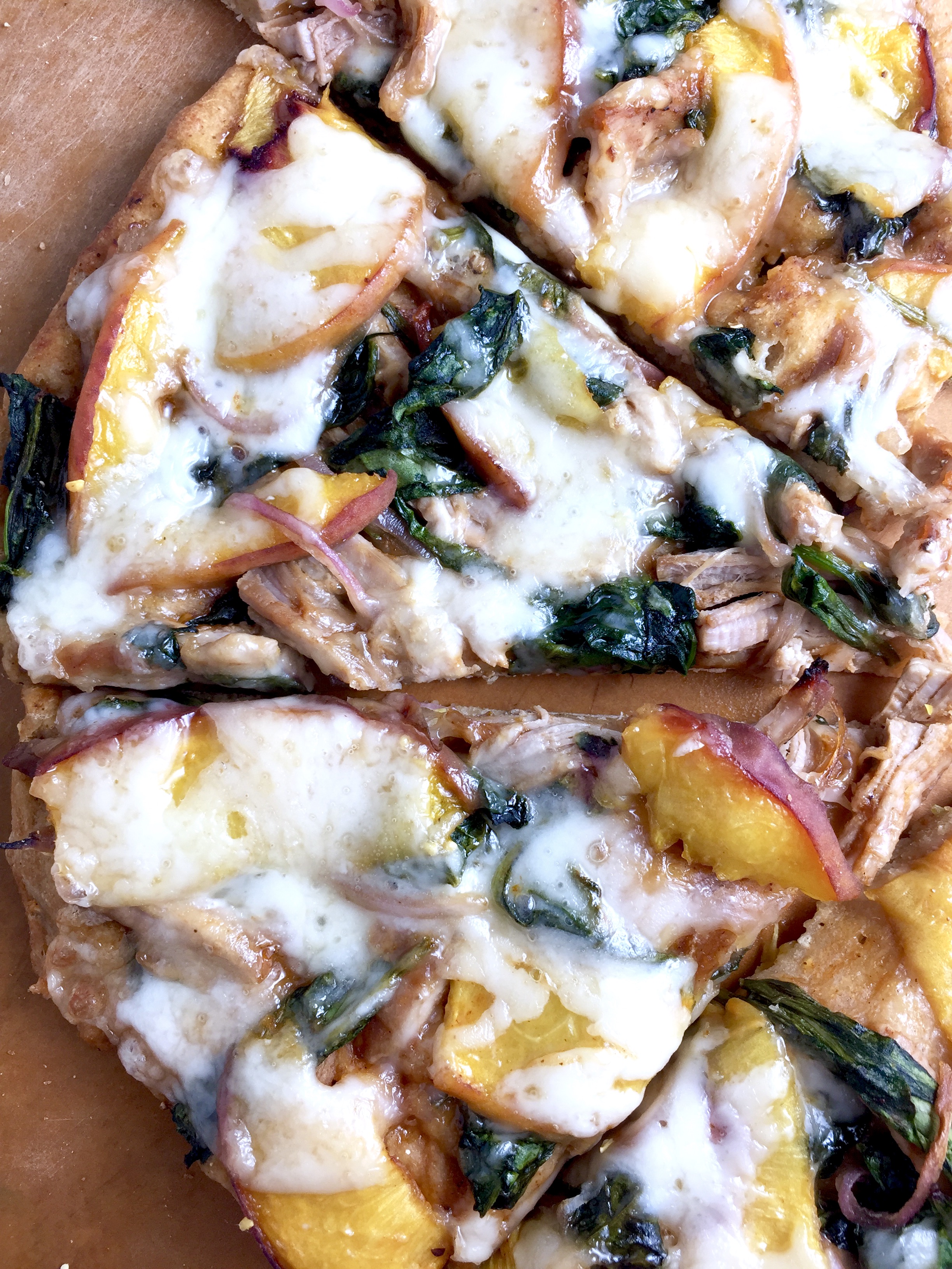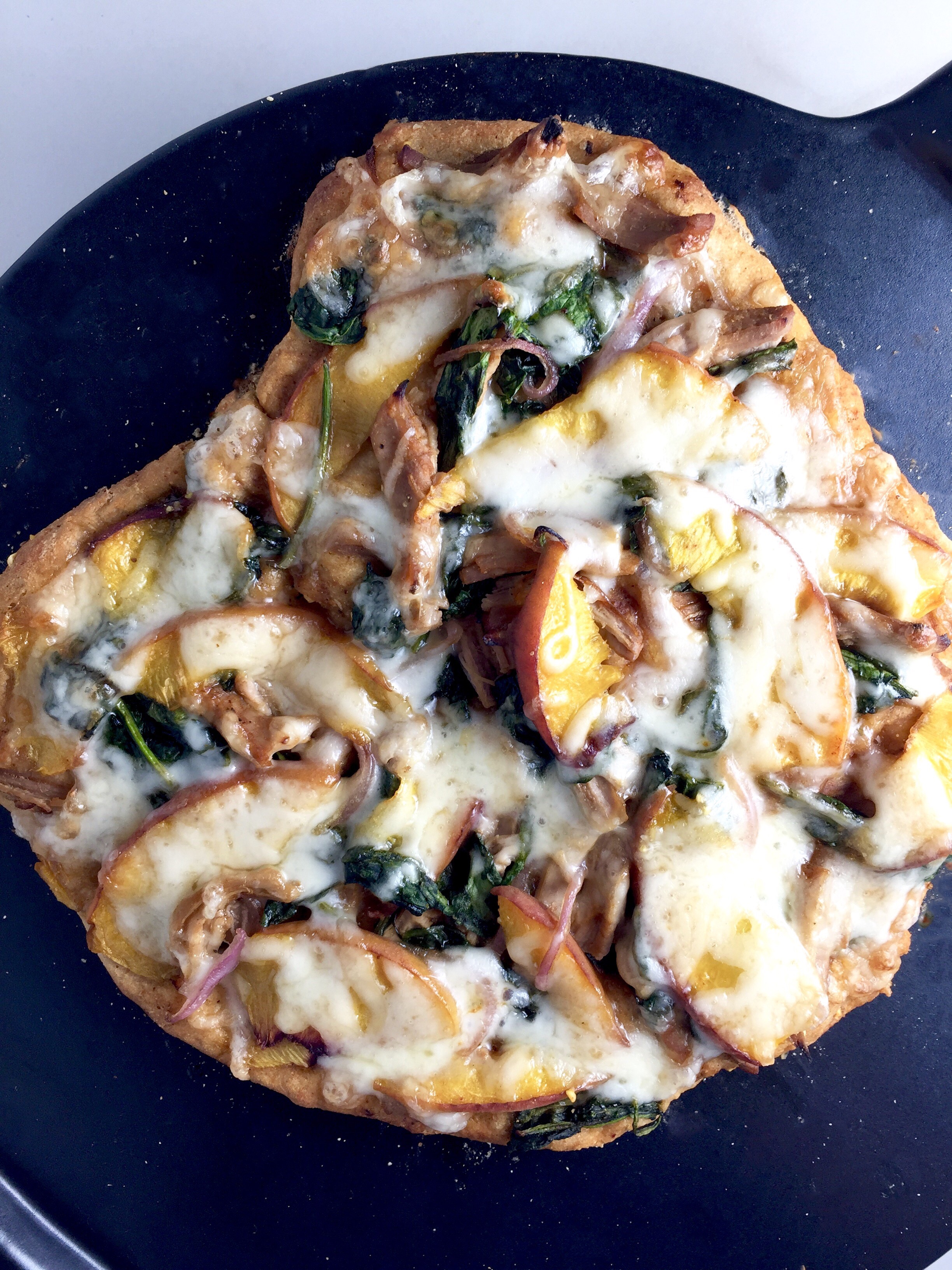 Never get bored with your pizza! The ultimate late-summer combo featuring spicy BBQ sauce, lean pulled pork, roasty sweet peaches and onion, spinach, and melty smoked mozzarella and fontina. All baked atop homemade whole wheat dough for the perfect crisp and chew.