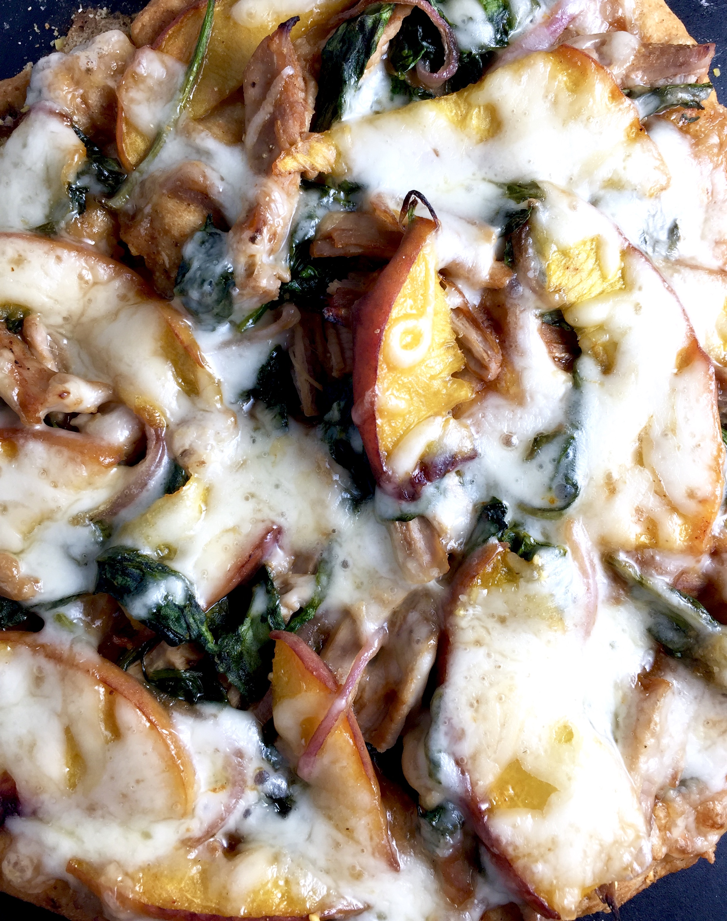 - Top with BBQ sauce, pulled pork, spinach (withOUT excess liquid), onion, and peach. If using, slide onto a hot pizza stone or {holey} pizza pan (see notes below). Bake at 475º about 10 minutes. Remove, add cheese, and bake 6-9 minutes longer, or until crispy. Slice and enjoy! Return slices to oven if necessary to crisp up further.