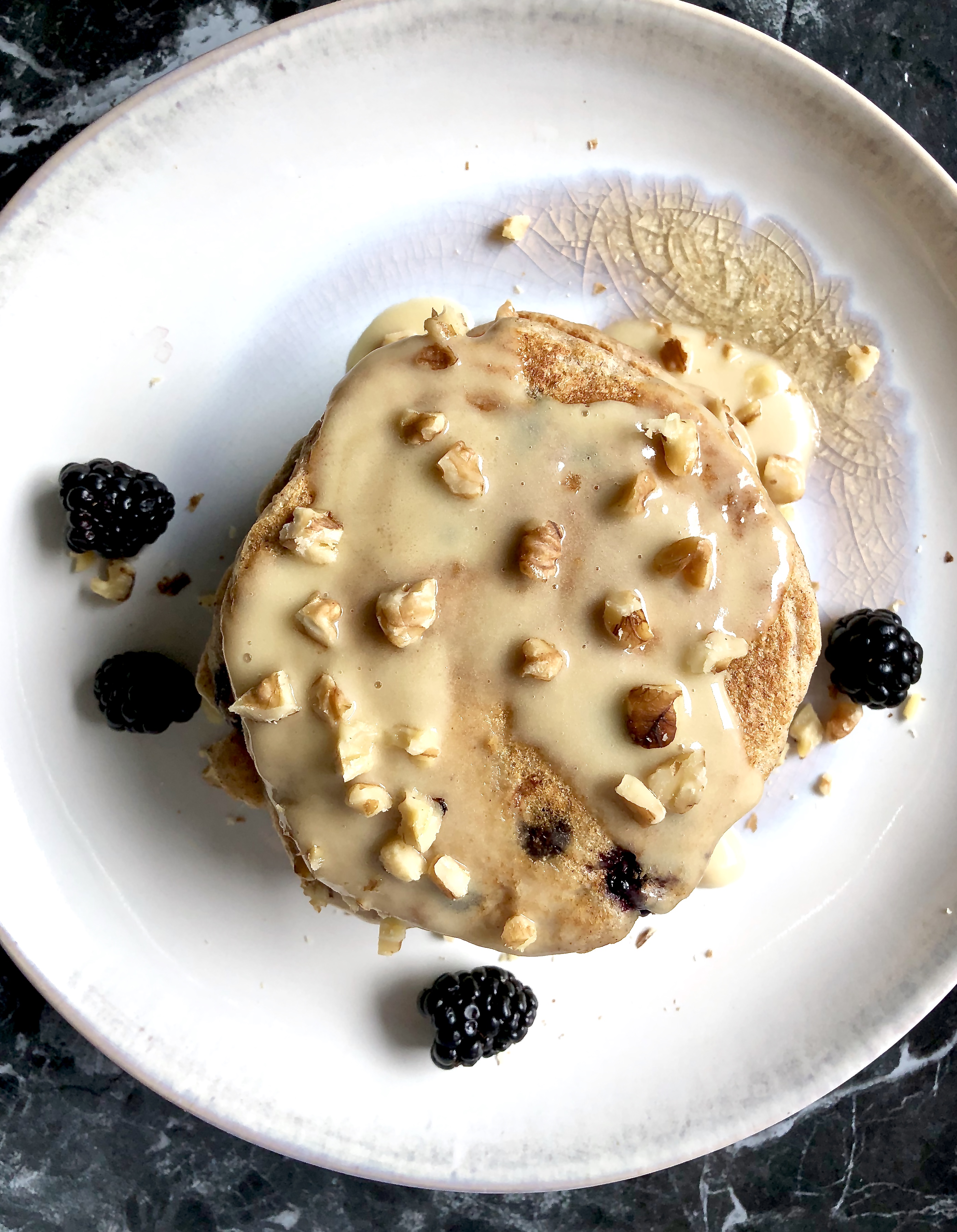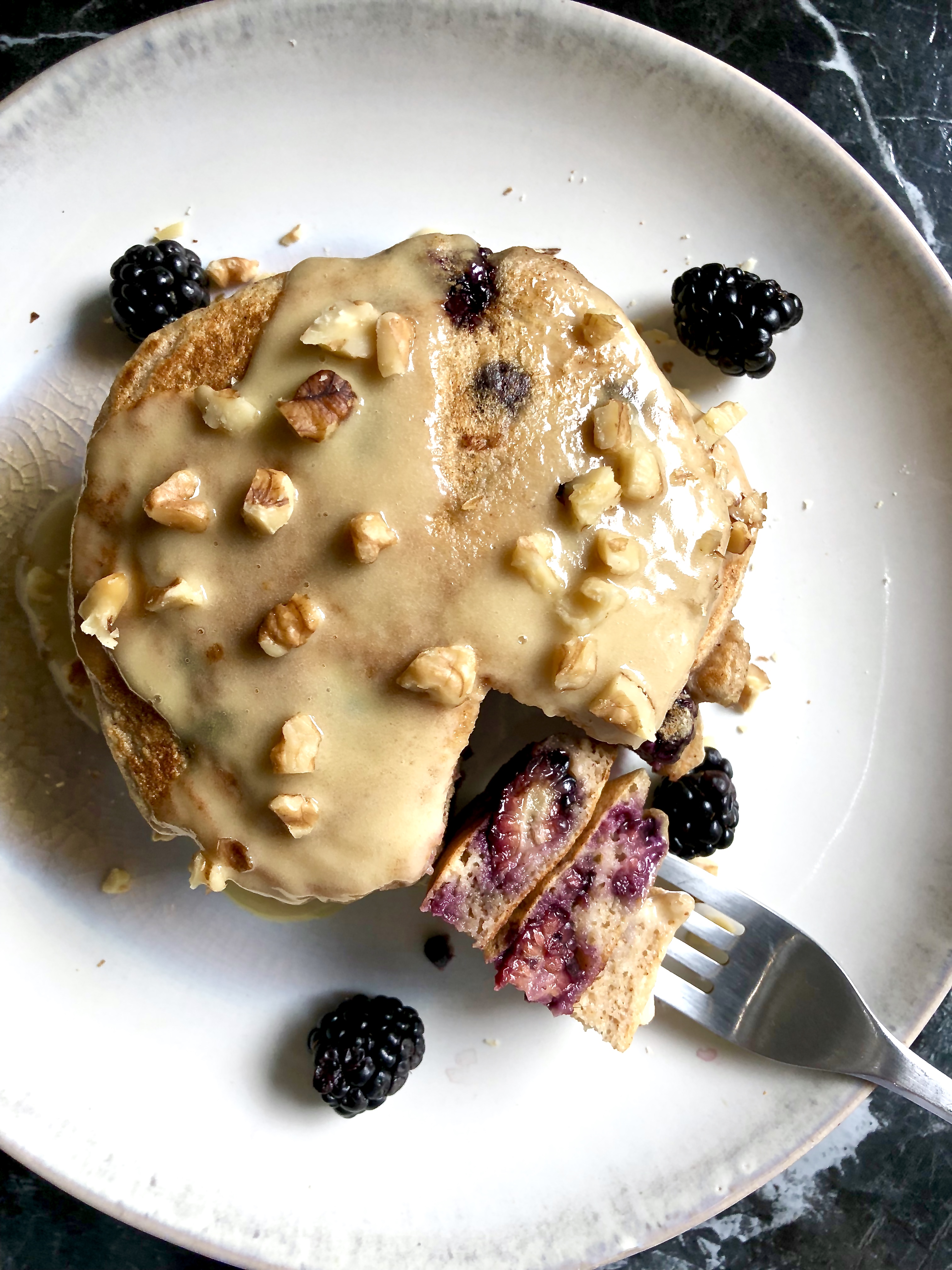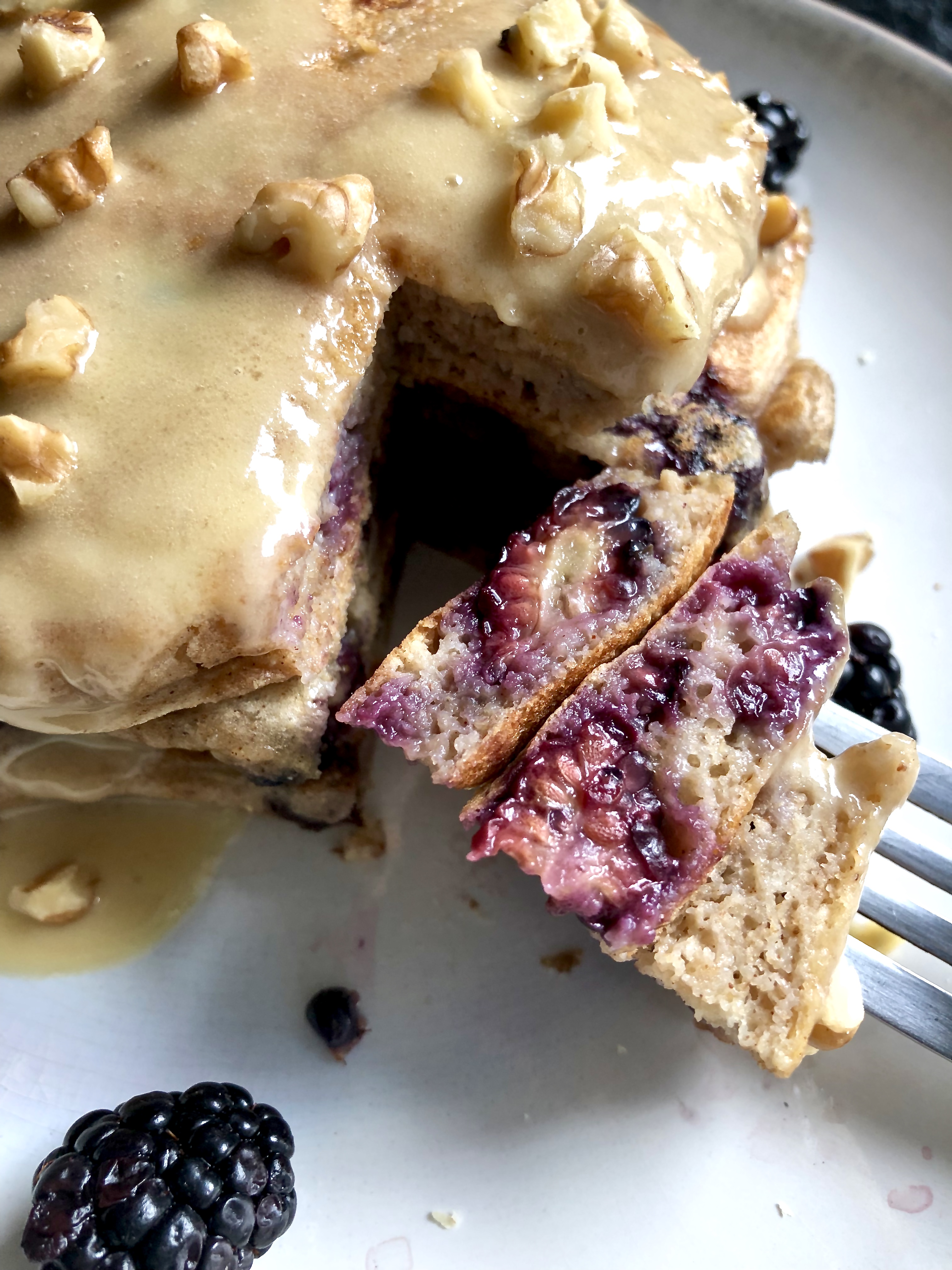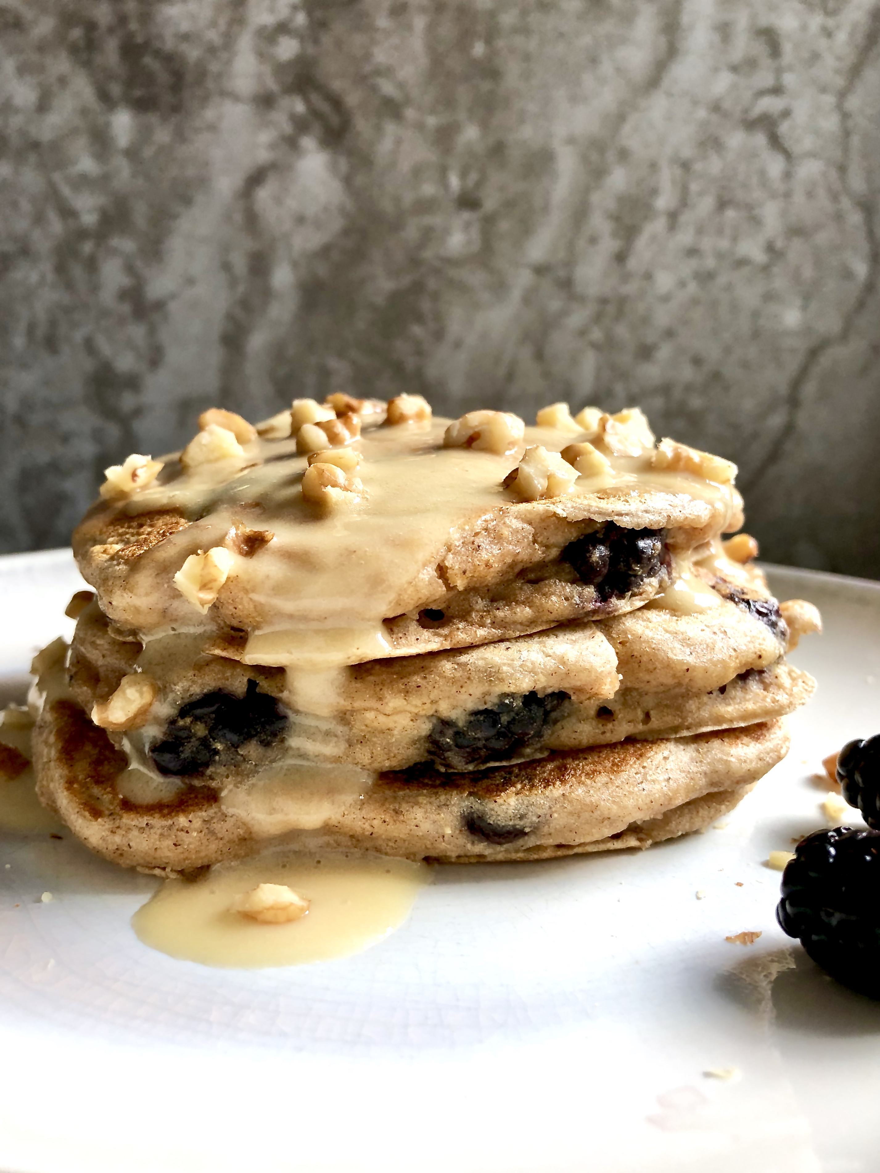 Ultra soft and voluminous, healthy whole grain buttermilk pancakes with juicy summer blackberries and dark chocolate chips. Topped with a dreamy (instant!) vanilla maple mascarpone glaze and toasted walnuts. Pure indulgence that’s balanced and unbelievably simple to make.