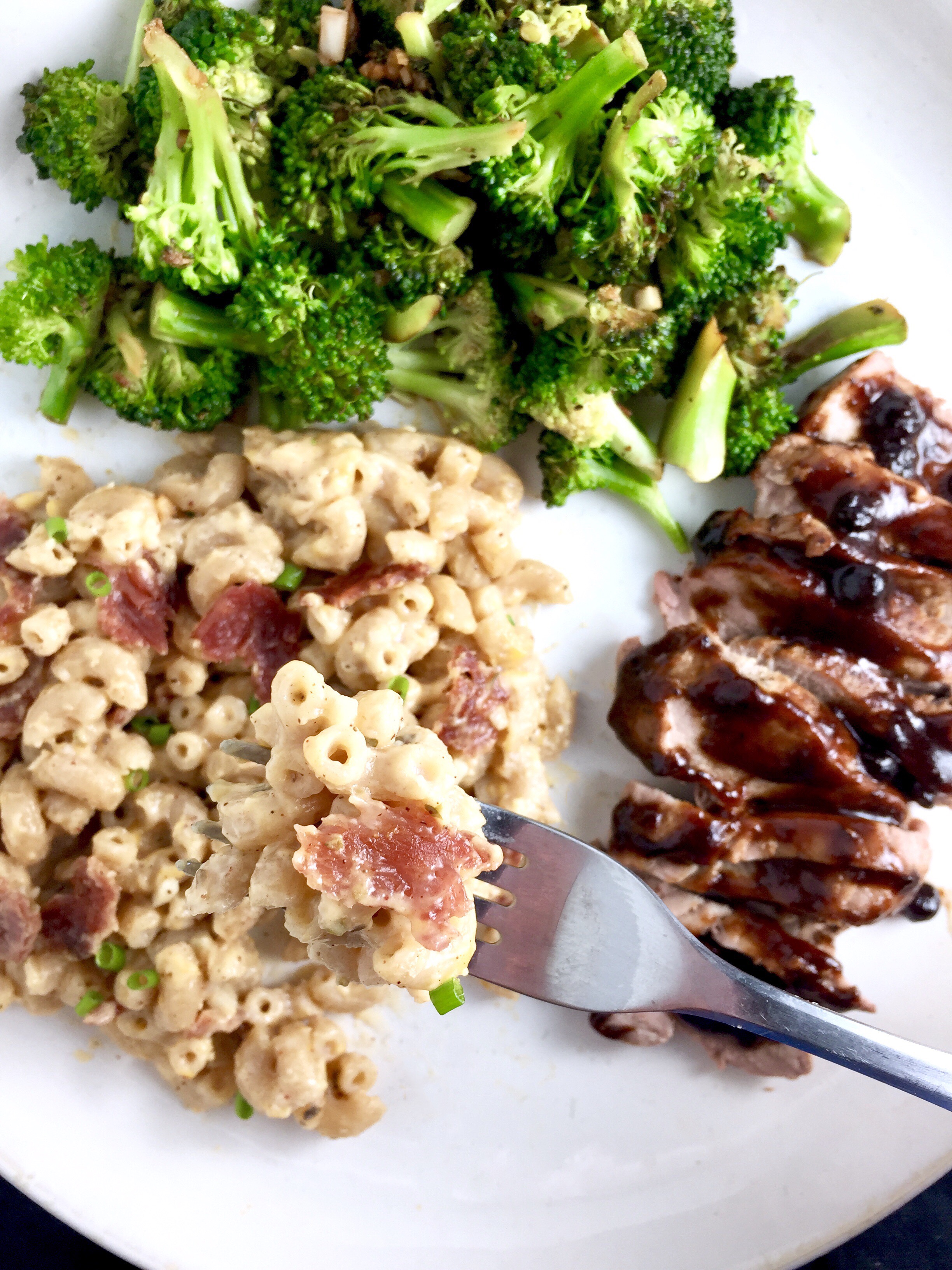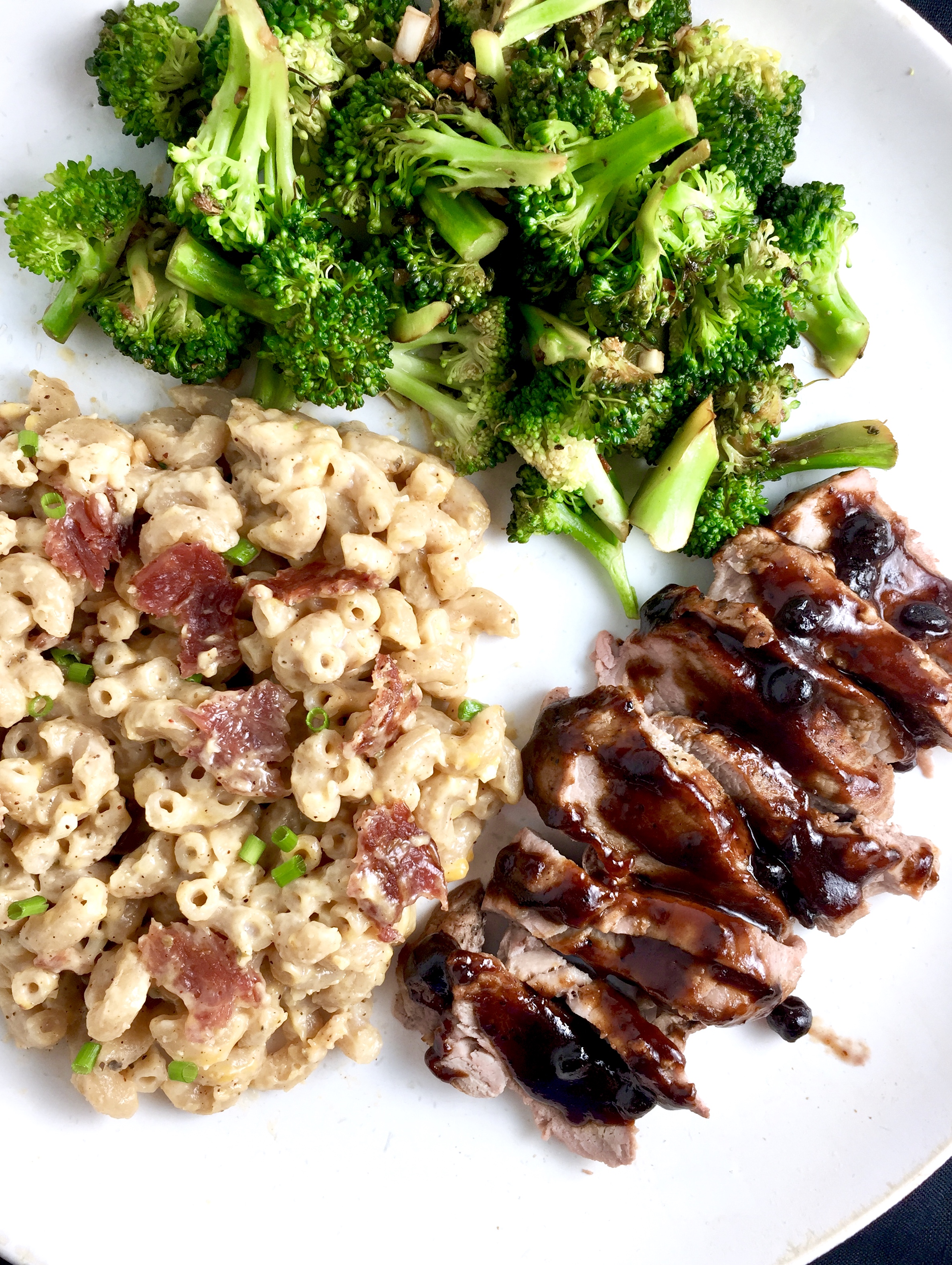 (pictured: bacon mak n’ cheese and sautéed broccoli with garlic and lemon)