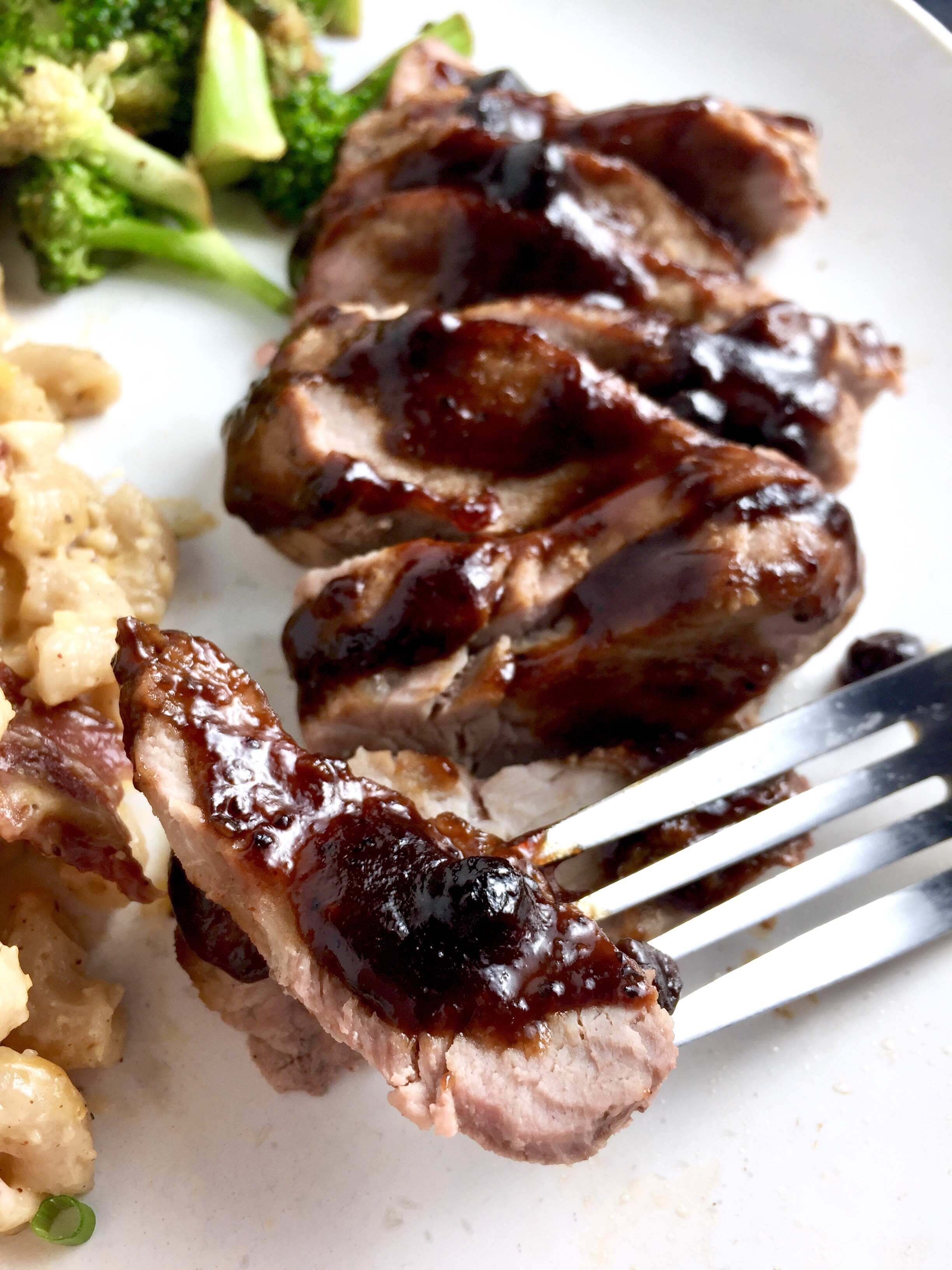 - Slice the pork cross-wise (against the grain). If any juices run out, pour the juices back into your skillet and mix with the sauce. Divide pork between plates, and spoon the glaze over top.