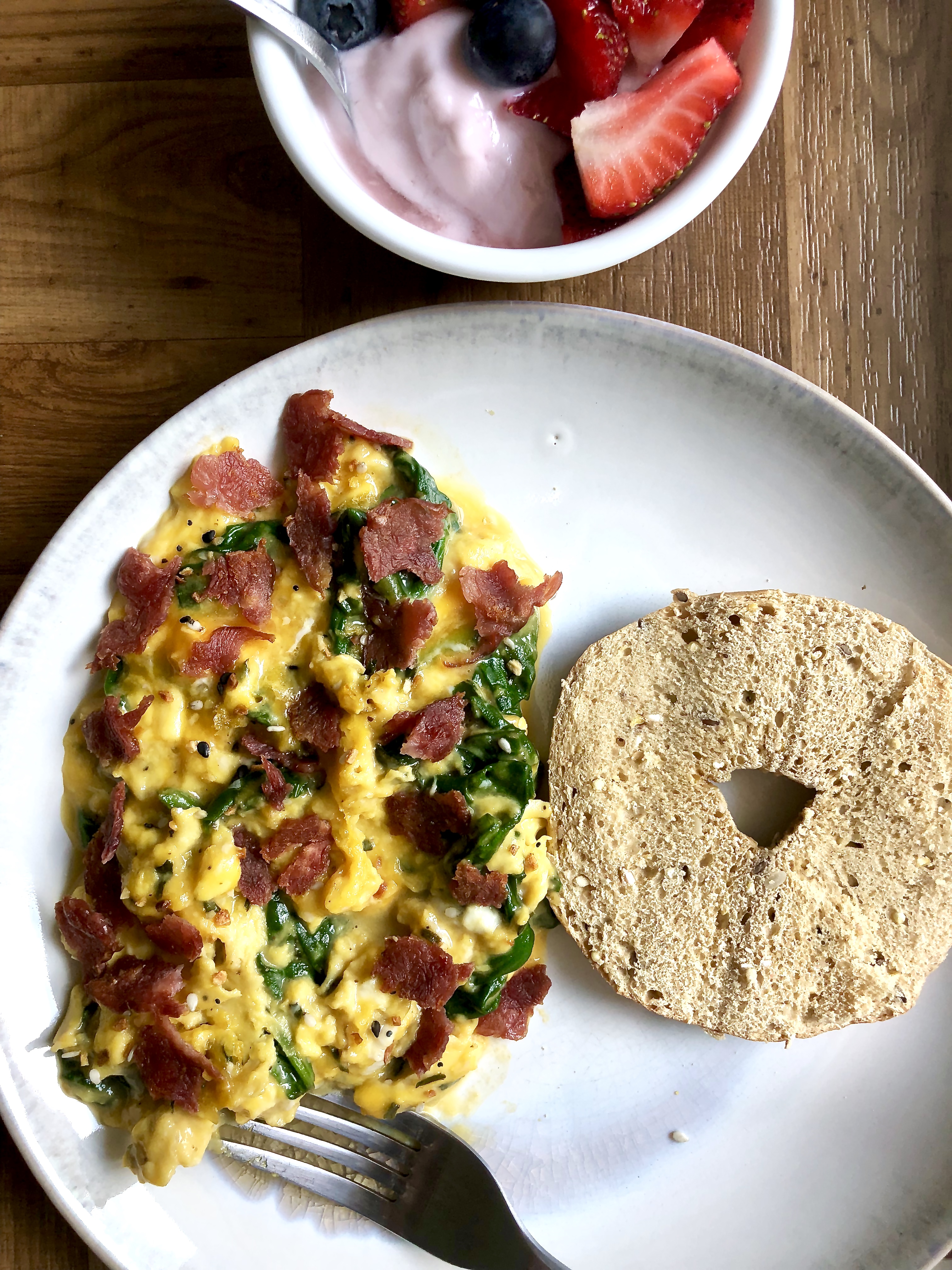 Nutrition information includes eggs, spinach, cheese, and 1 slice Applegate turkey bacon.