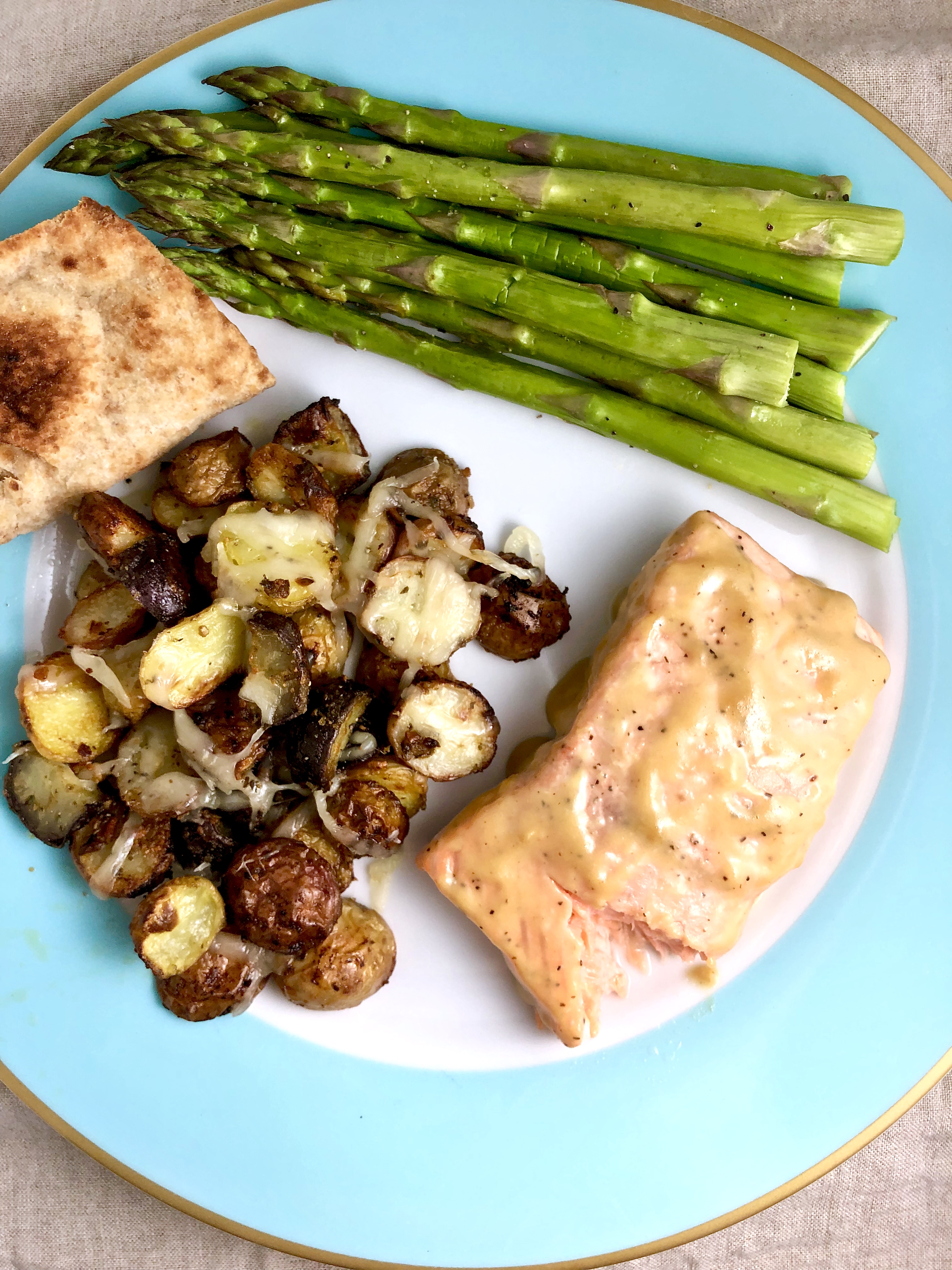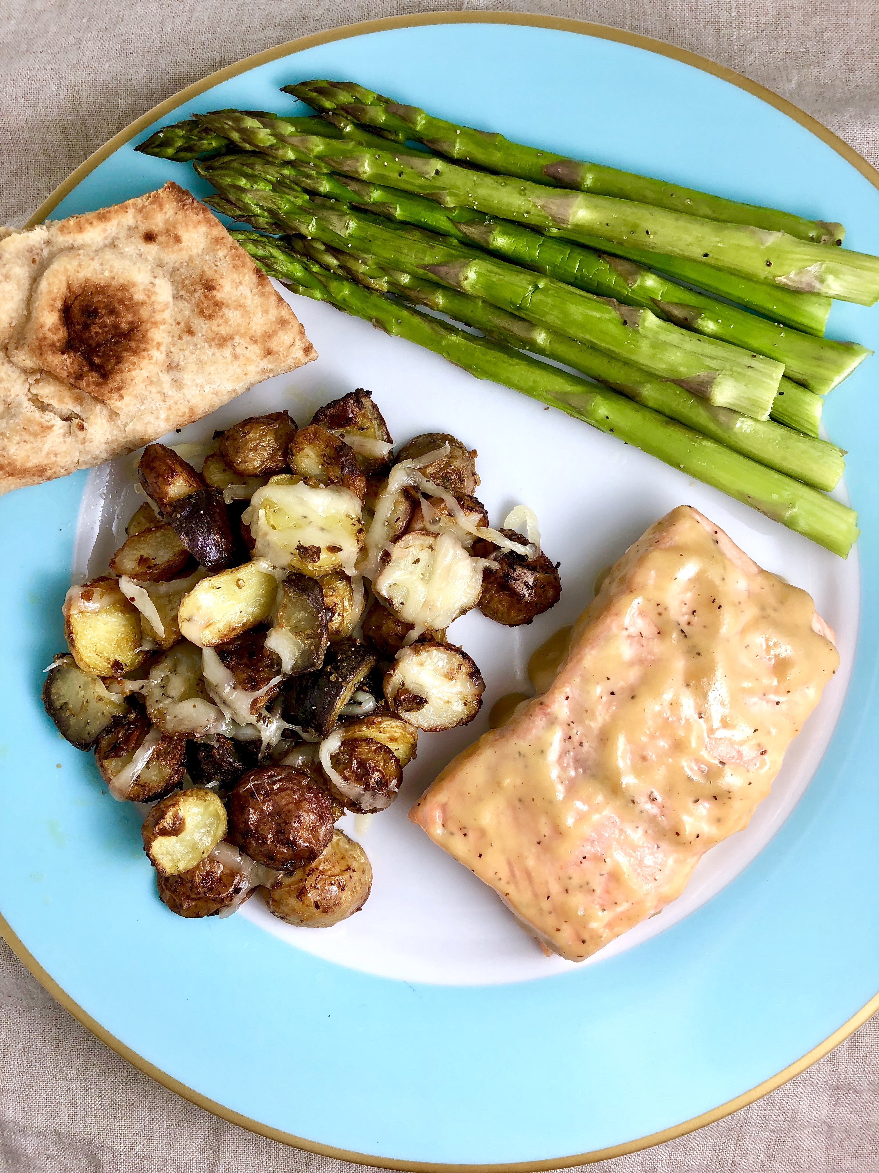 Here I’ve paired it with pesto roasted baby potatoes with melted mozzarella, lemon roasted asparagus, and toasted whole grain naan.