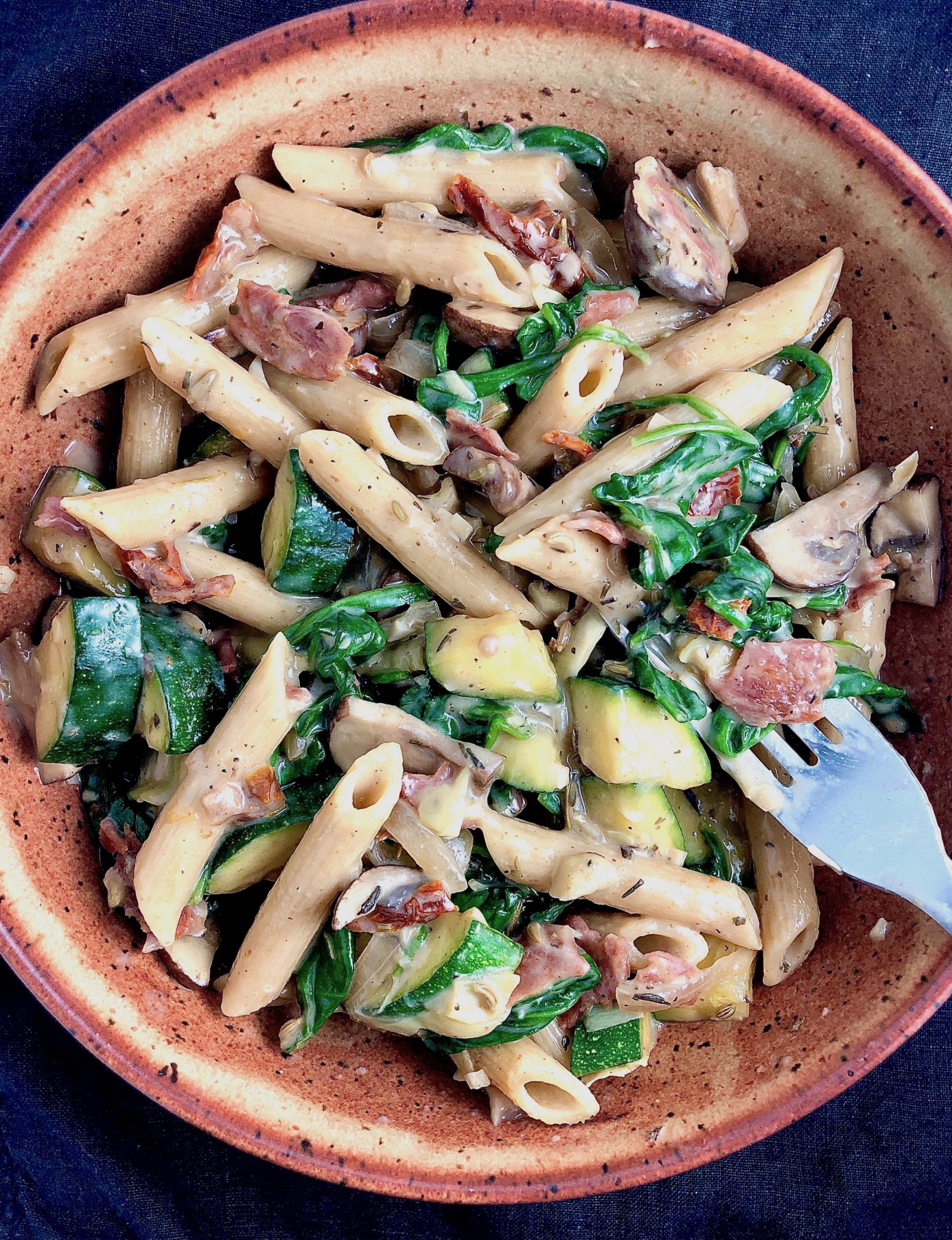 The dreamiest, most flavorful rich and creamy whole grain penne loaded with hearty mushrooms, spinach, melty smoked gouda, garlic, herbs de Provence, artichoke and sun-dried tomatoes, and crisp bacon. Loaded with veggies and lightened up, no heavy cream required! Hands-down my all-time favorite creamy pasta.