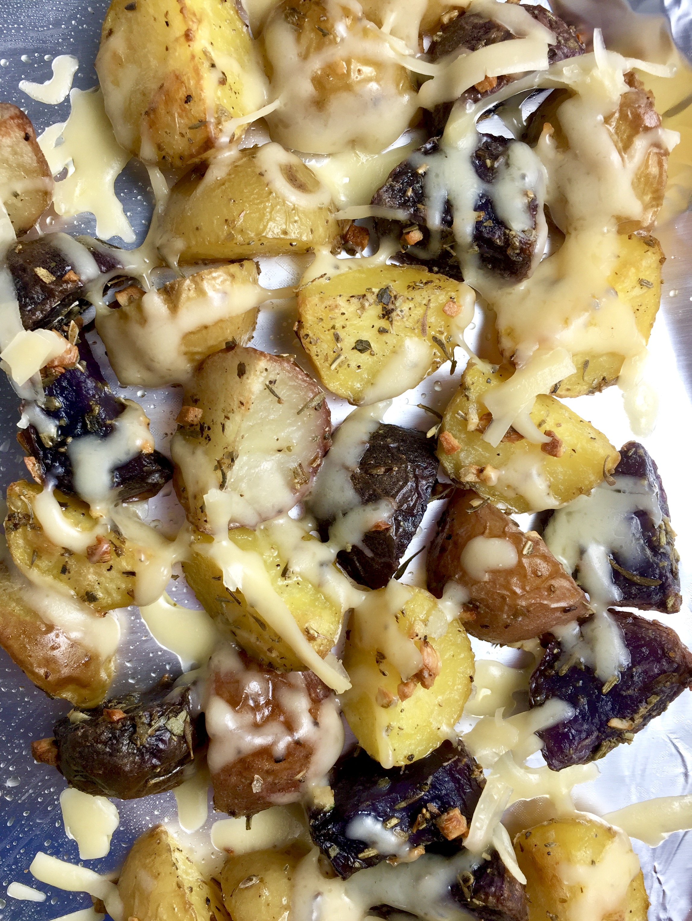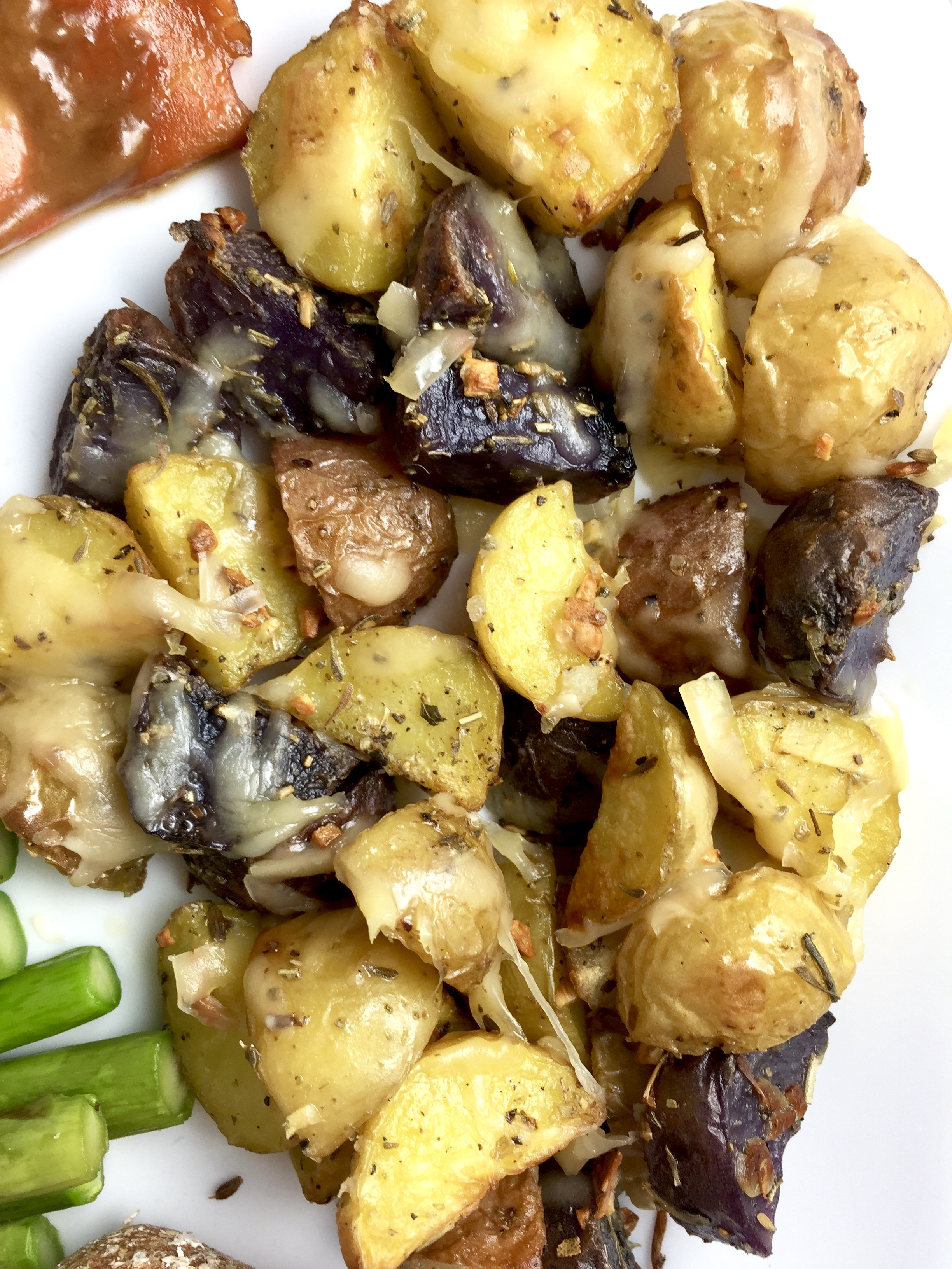 Simple golden or mixed baby potatoes are tossed with ultra-flavorful herbs de Provence, dijon, fresh garlic, and olive oil (garlic-infused if you have any!), then roasted to crispy perfection. Topped off with melty smoked gouda, these are really hard to beat.