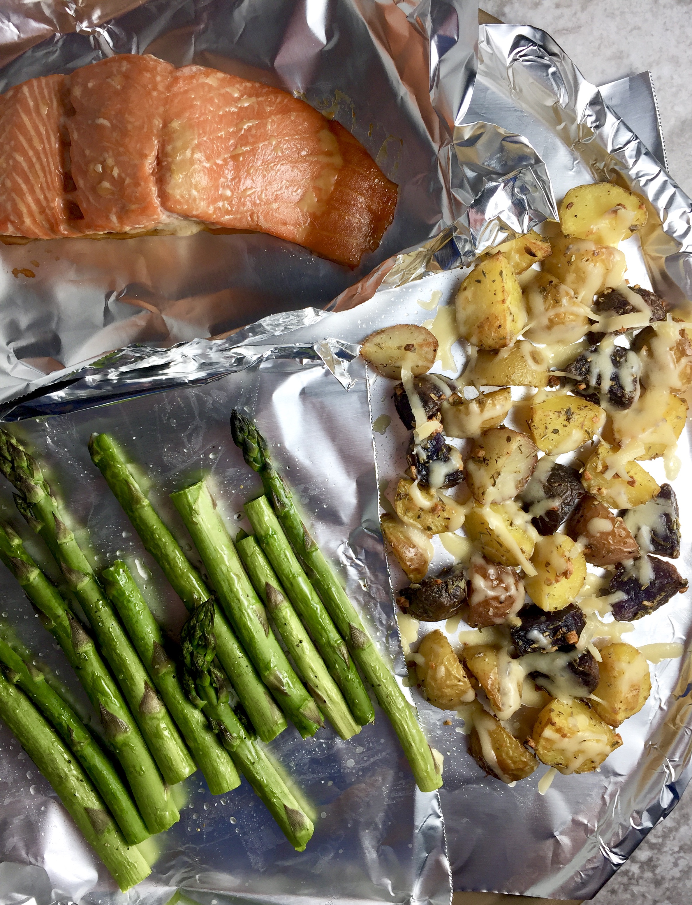 Pictured is this Maple Bourbon Salmon and asparagus tossed with EVOO, salt, pepper, and fresh lemon juice. One-pan roasted dinner for the win!