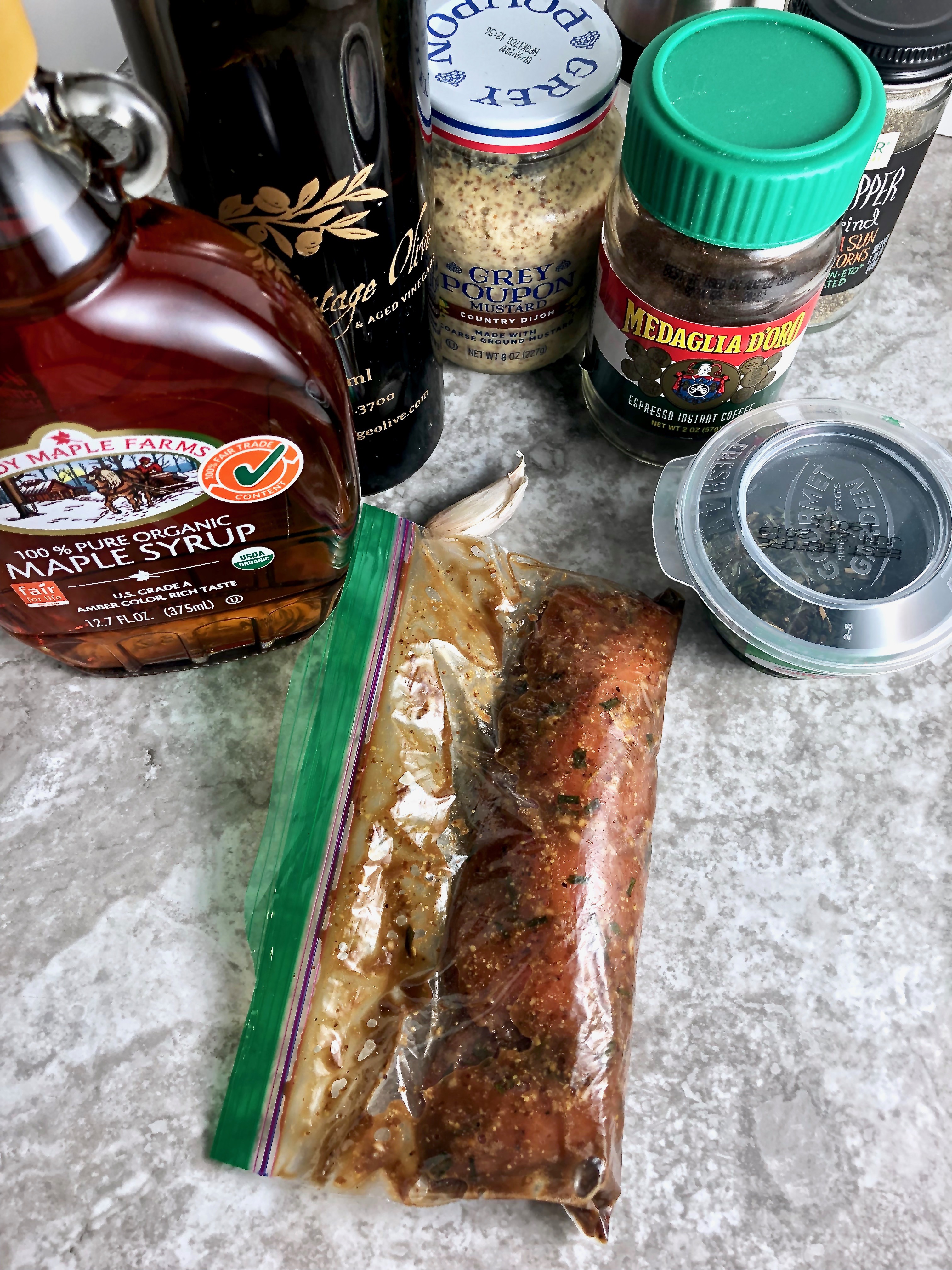 - Add Dijon, balsamic, maple, espresso, garlic, chives, a generous pinch sea salt and black pepper to a baggy and massage to mix. Add salmon filets, making sure to completely coat in the marinade. Tightly seal and refrigerate 1-3 hours.