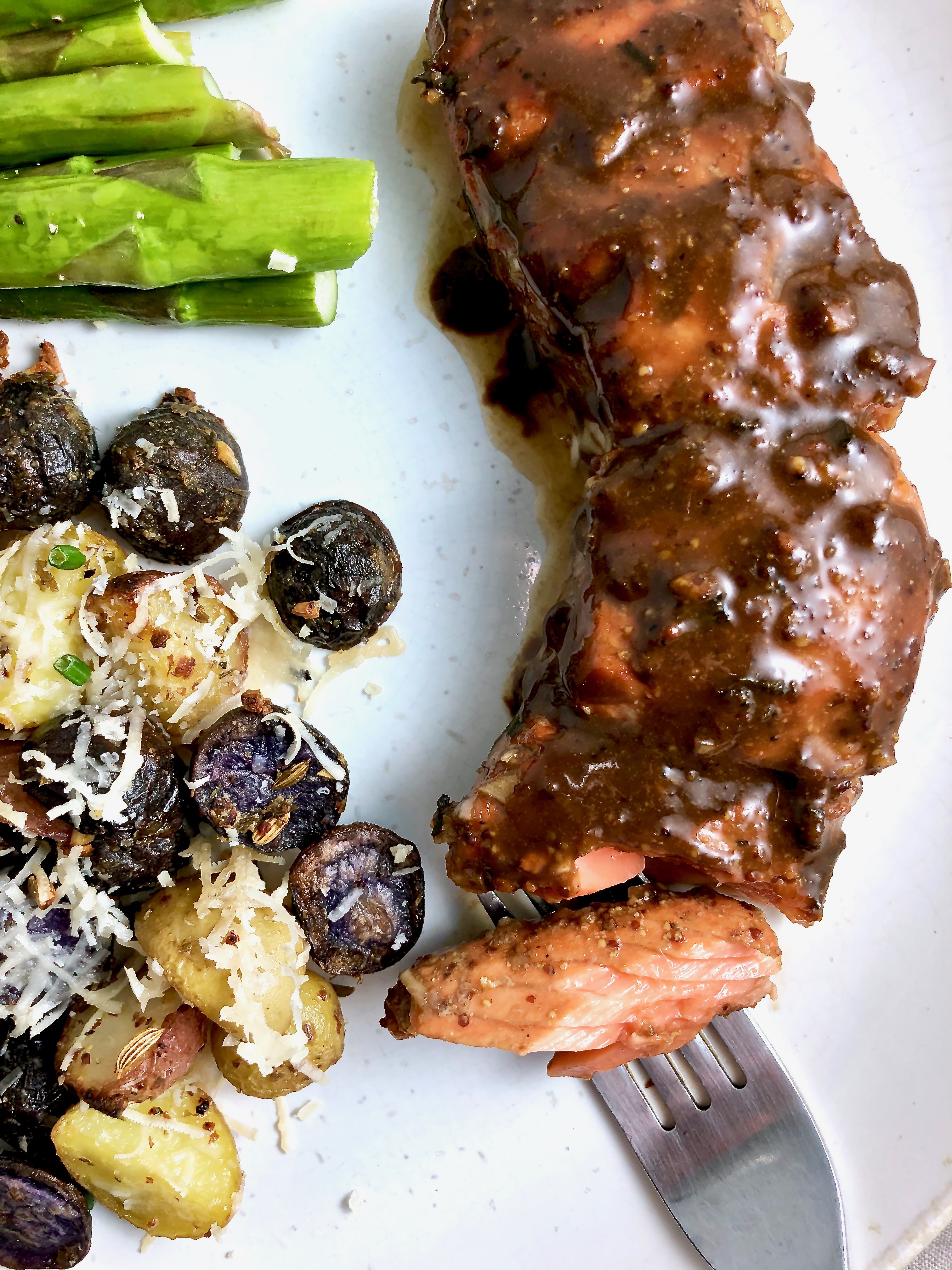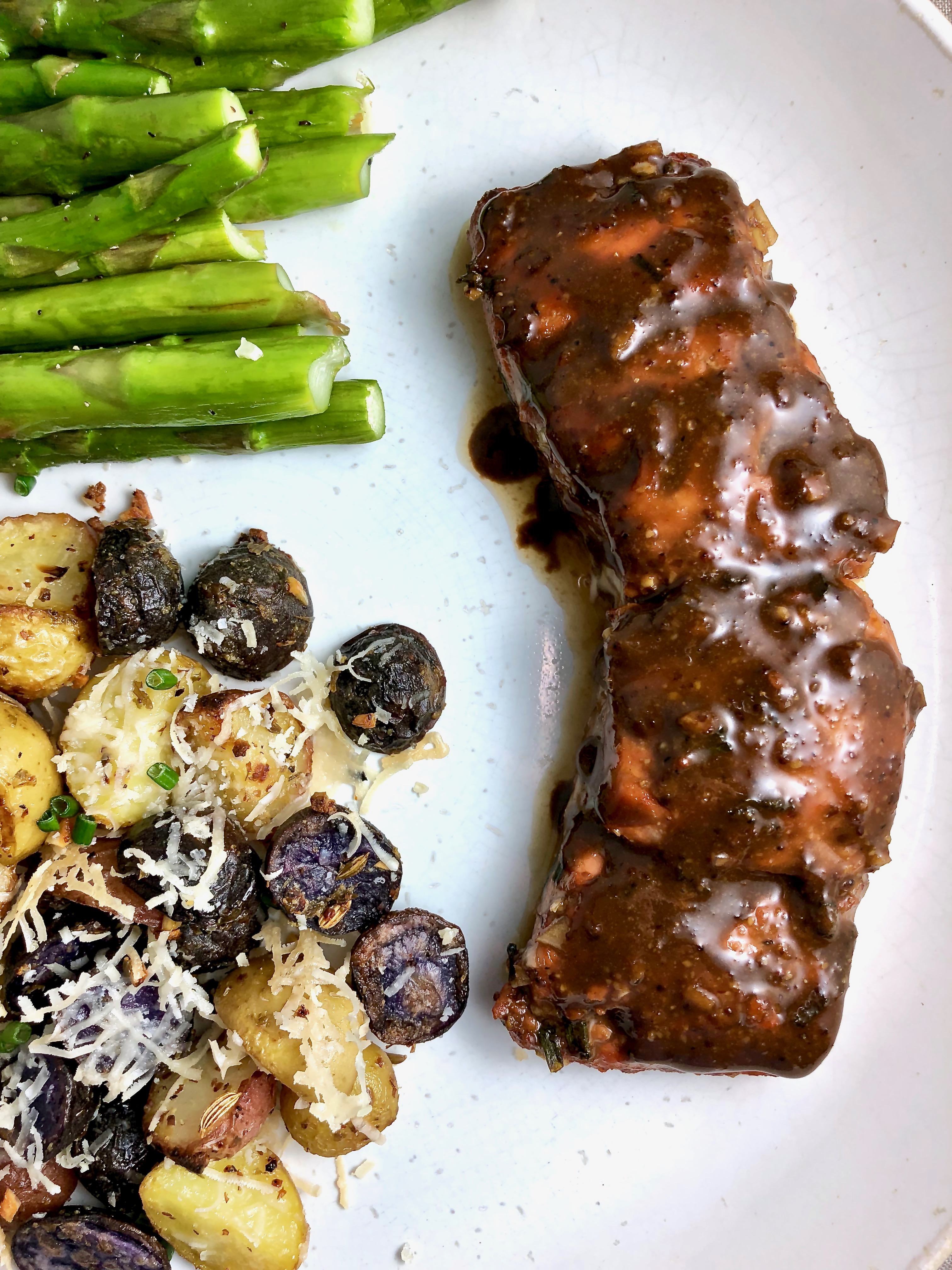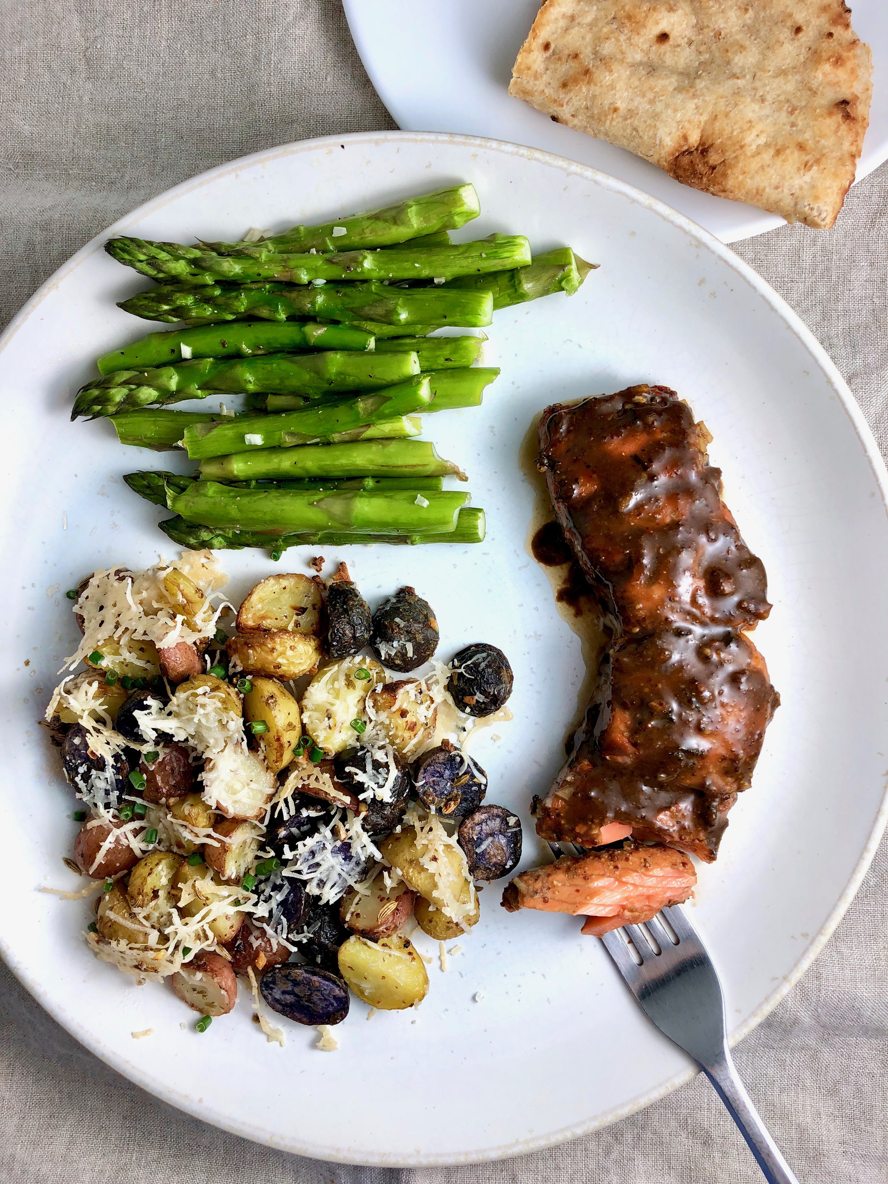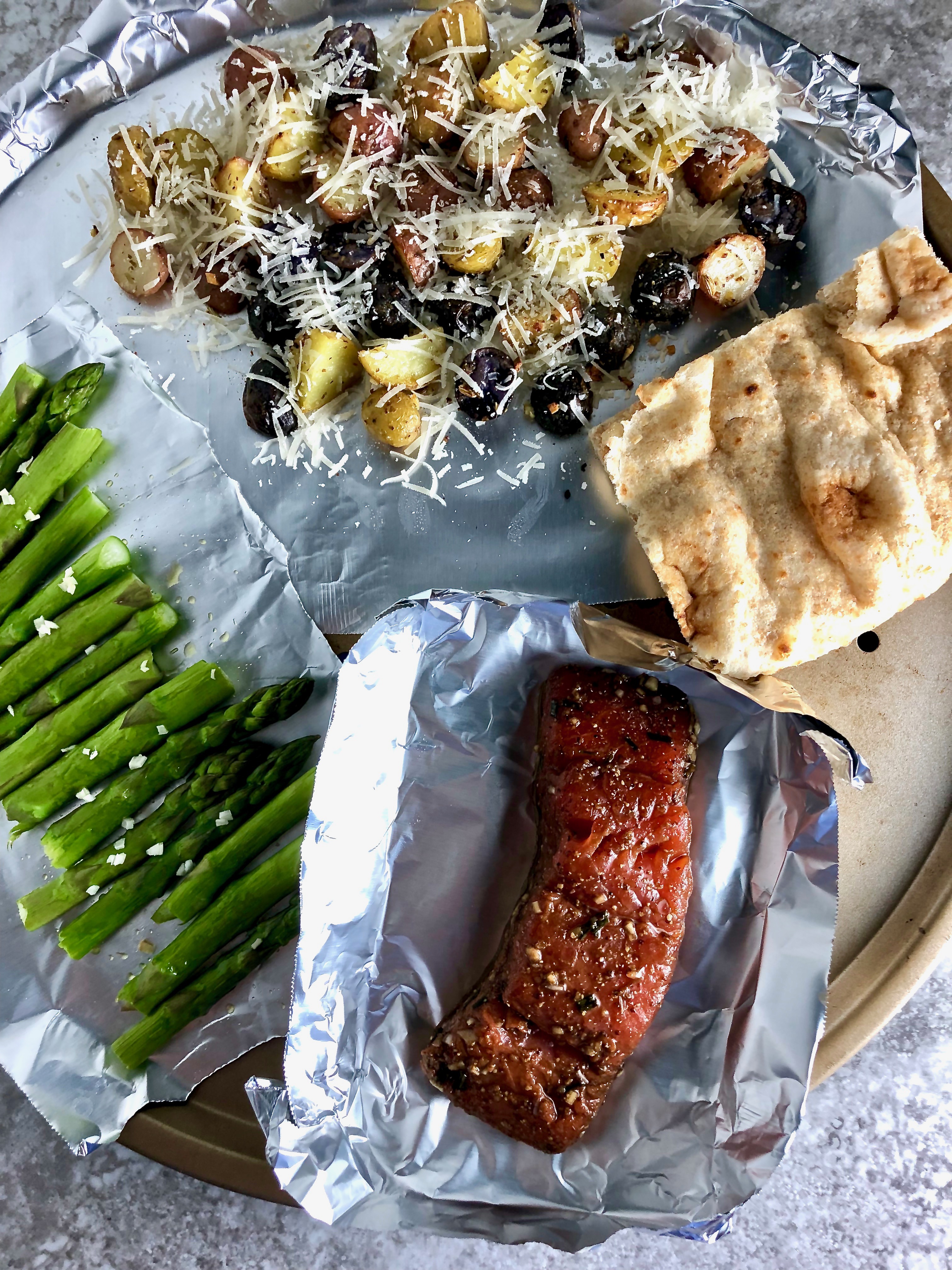 - Garlic roasted asparagus: 3 oz asparagus, halved. Toss with a little olive oil, fresh minced garlic. Roast at 400º about 10 minutes. (Add them when you put the parmesan on the potatoes and with the salmon. Return the asparagus to the oven after removing the salmon and potatoes if necessary, until they’re crisp-tender.) Toss with sea salt, pepper, lemon juice, infused olive oil if desired.
