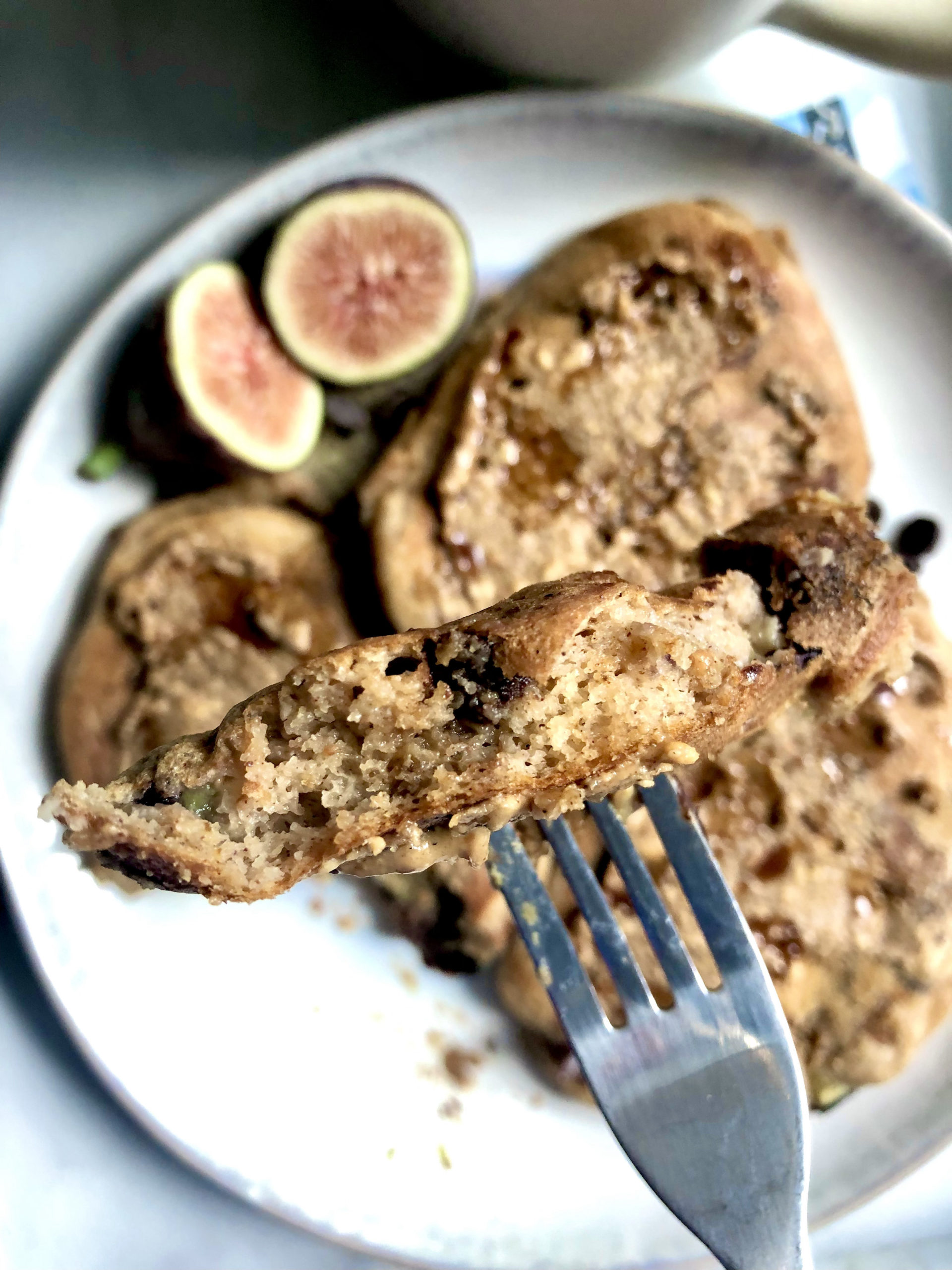 Figs work their magic in these thick and hearty, chai-spiced, dark chocolate-studded buttermilk pancakes. The chopped fresh figs have just the right level of moisture, and they retain that chewy texture to complement the soft cakes perfectly.