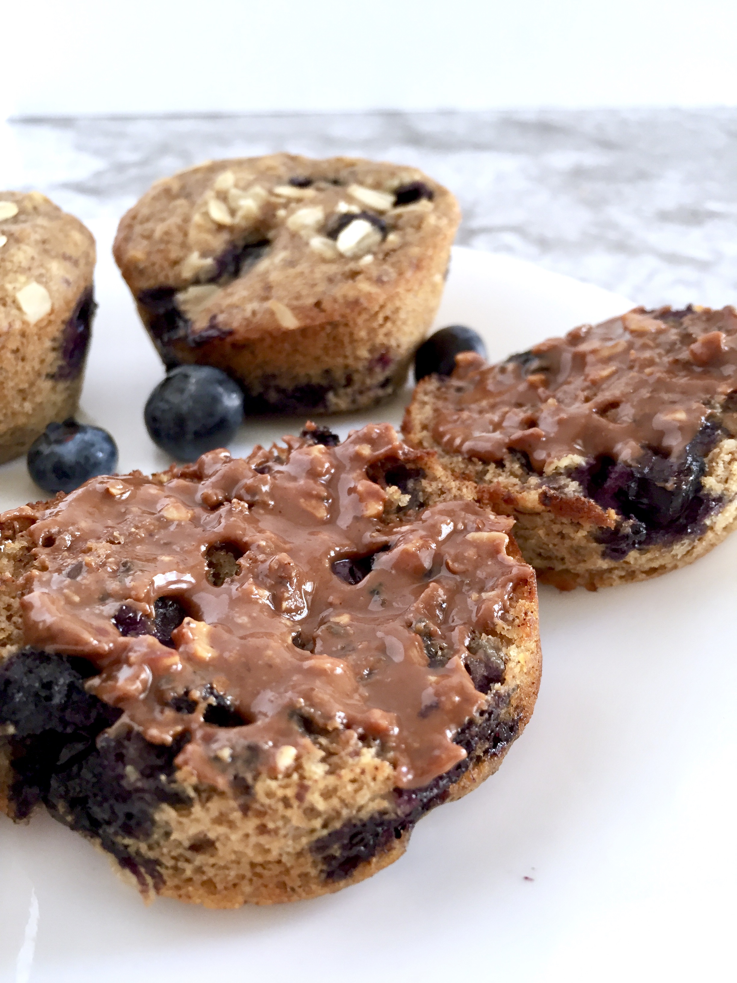 These muffins are wonderful as they are, but my favorite way to enjoy them is toasted then slathered with nut butter (like Wild Friends Chocolate Almond Butter, one of my new obsessions). Just slice your muffin, toast in the toaster oven a couple minutes, dollop on some chocolate almond butter and watch it get all melty and irresistible… OMG the soft inside + toasty exterior + drippy chocolate nut love + blueberry muffin aroma will change your life.