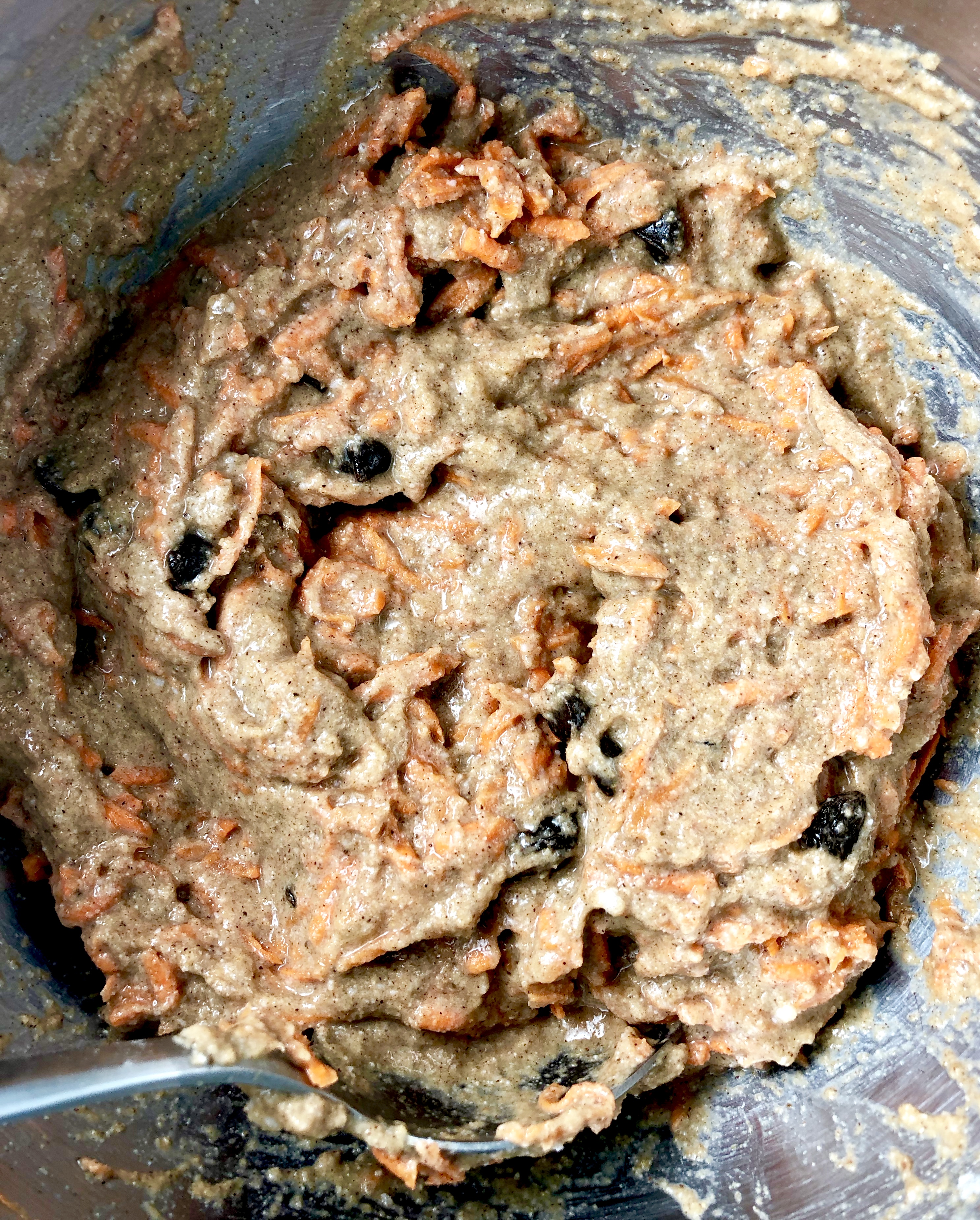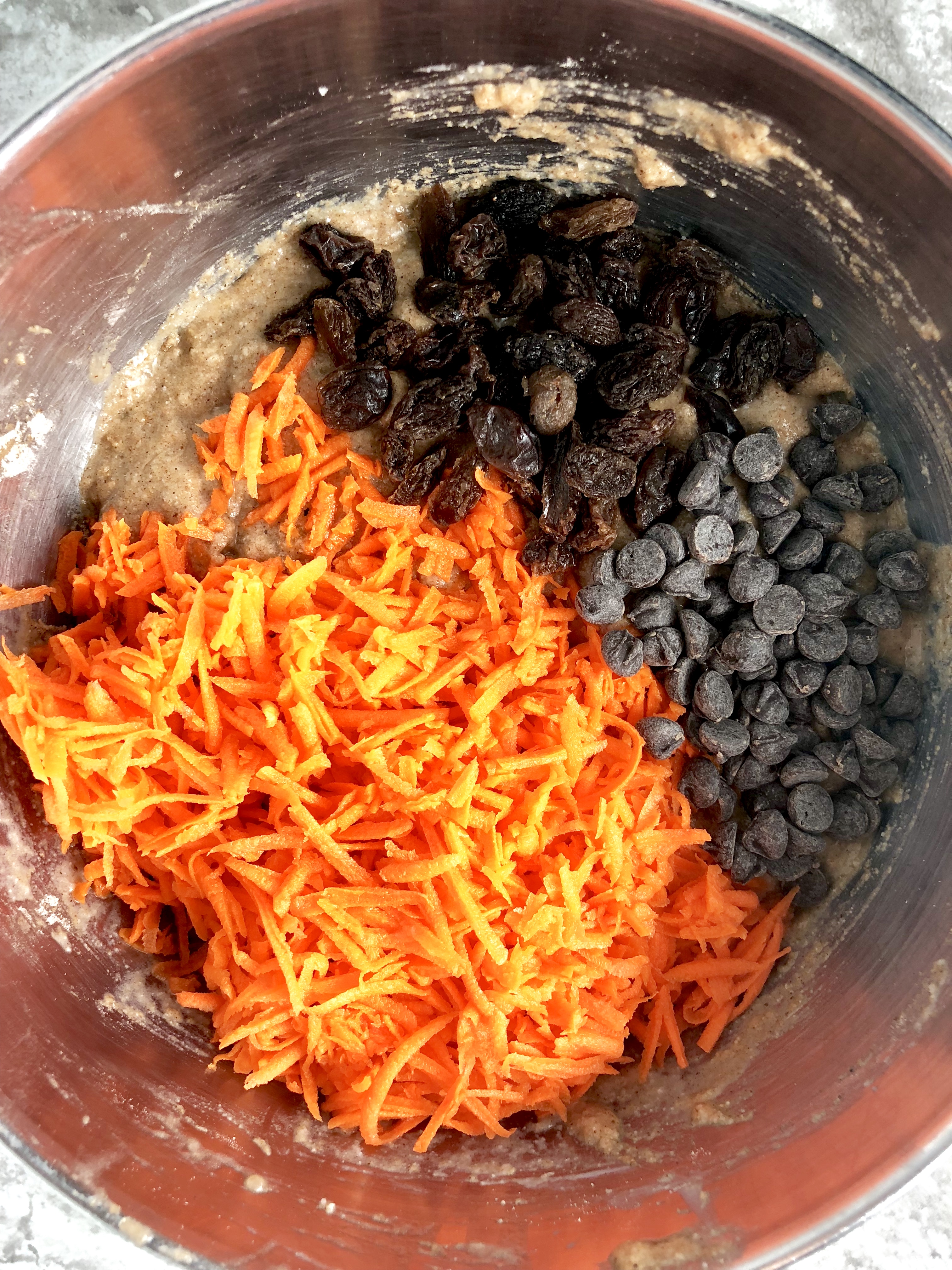 - Fold carrots, raisins, chocolate chips, or other mix-ins of choice into the batter until incorporated.
