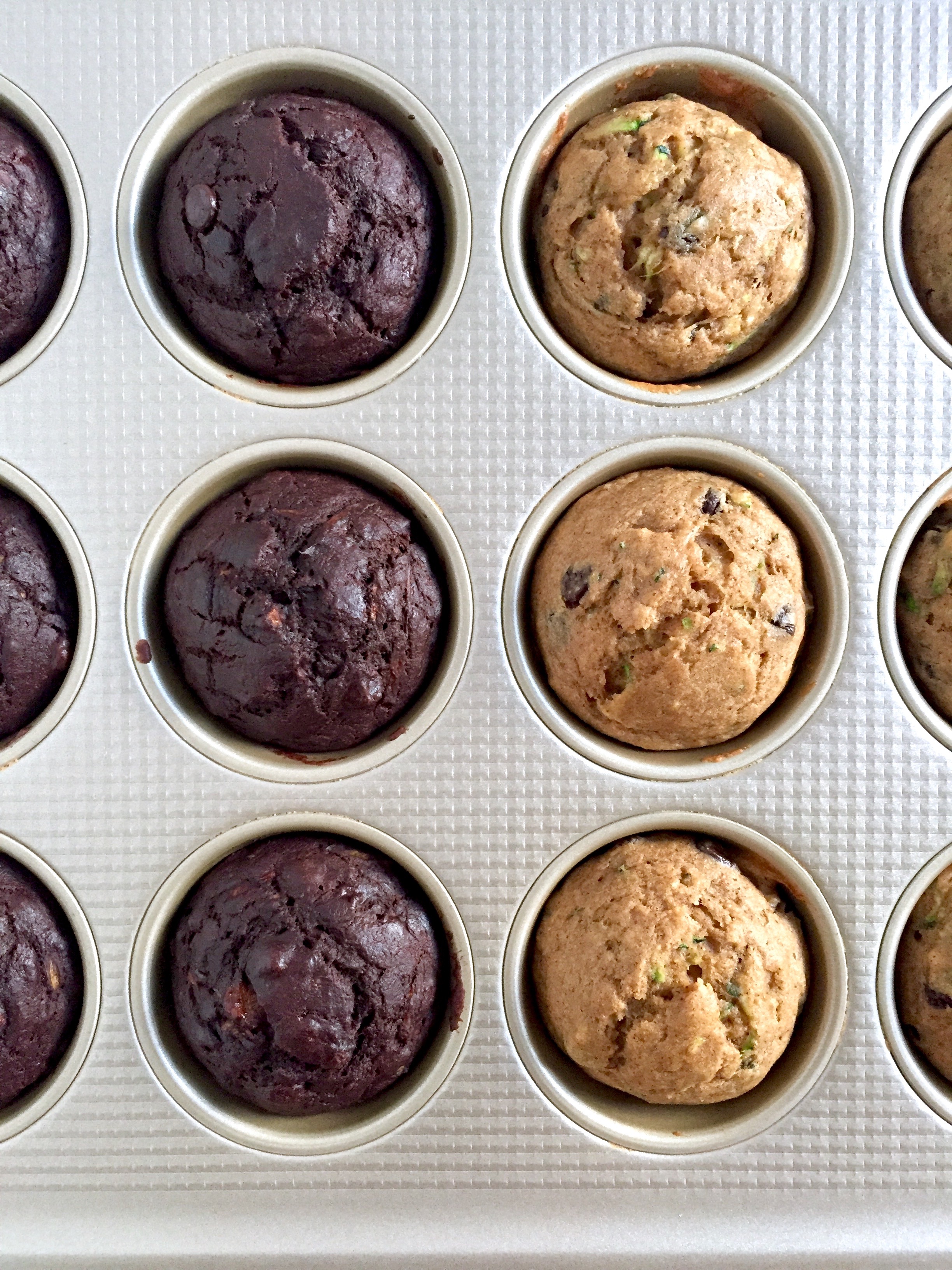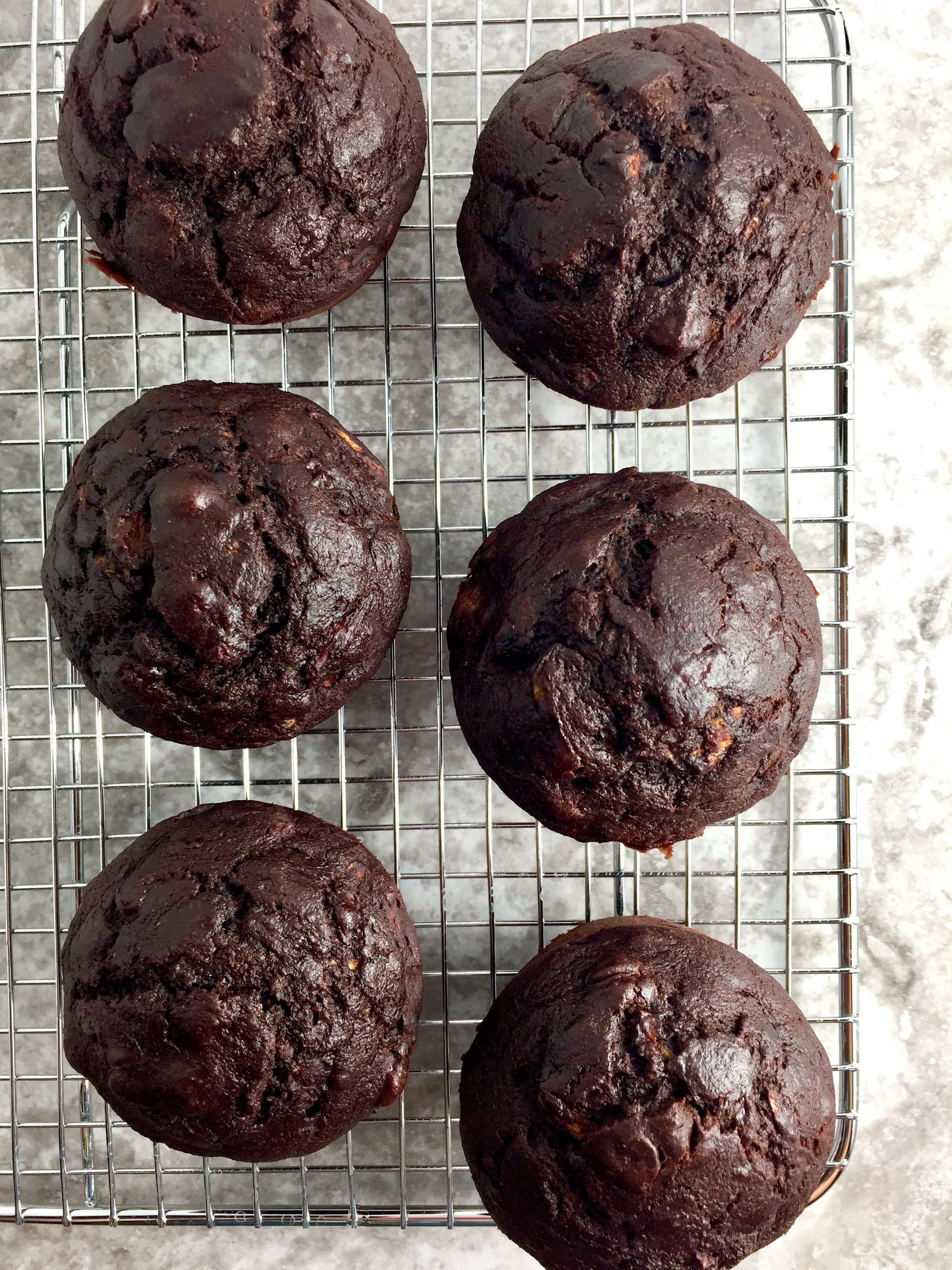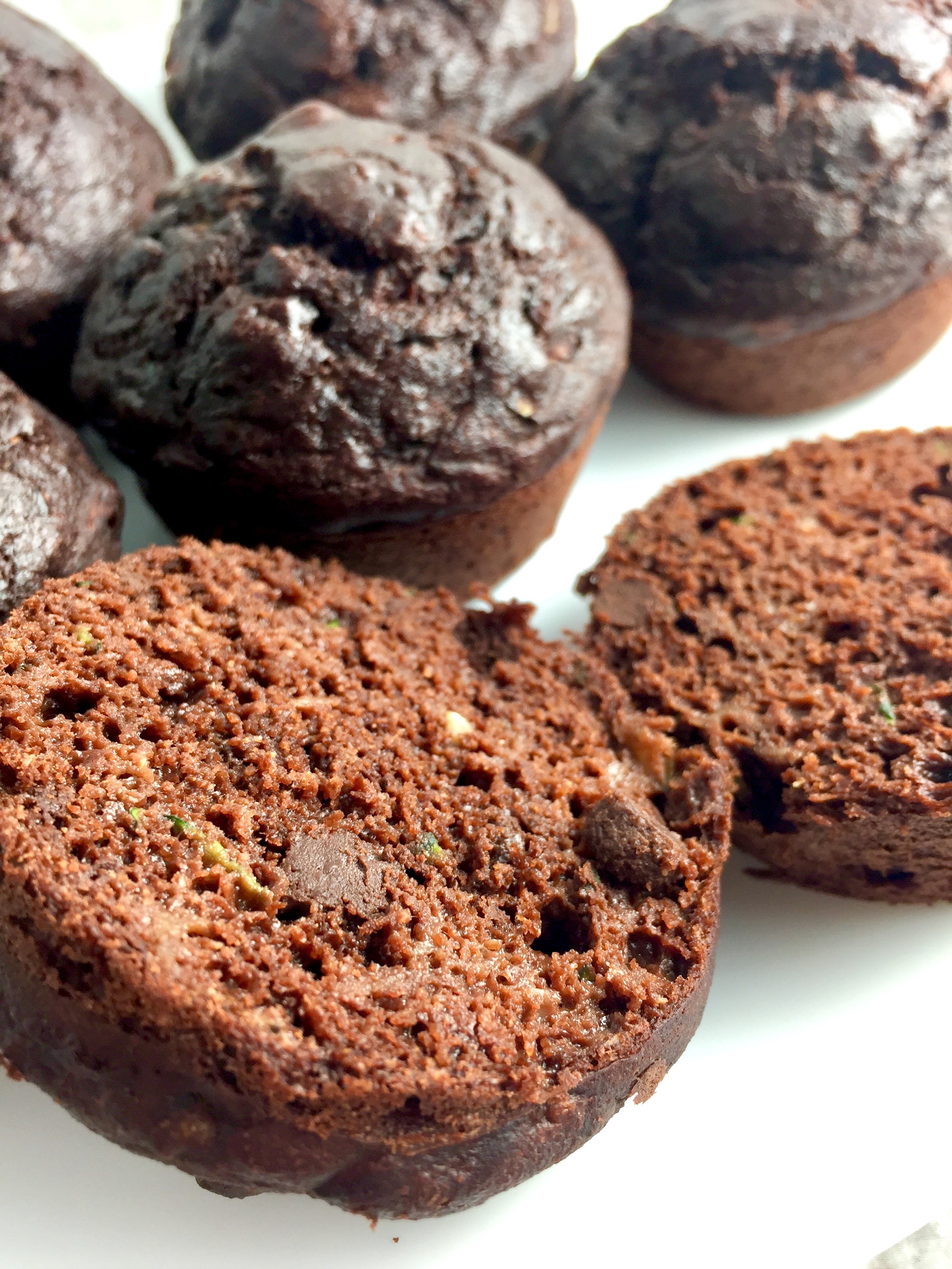 I started experimenting in the summer when zucchini was actually in season, but (thanks to those things above) I just last week got around to perfecting the recipe. And the final result is OUT-OF-THIS-WORLD good. Perfectly soft, moist and spongy, with rich dark chocolatey flavor, hints of banana, and just the right amount of sweetness. If adding a vegetable to baked goods makes you uneasy, not to worry! The zucchini does nothing to the flavor, but works wonders on the texture, keeping the muffins moist and making them EXTRA fluffy.