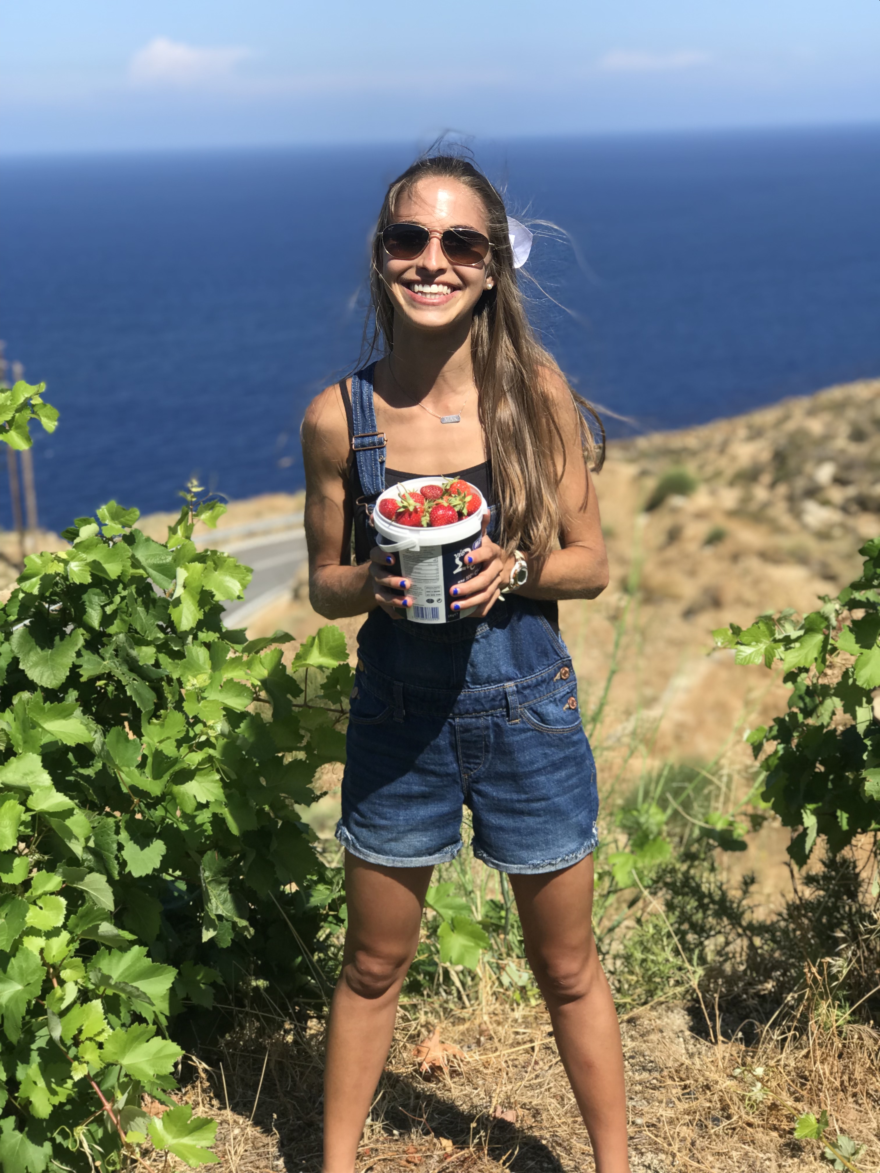 We first headed out on our trek to the goat and strawberry farm, about a 20 minute walk (turned 10 minutes with the help of Thea’s personal shuttle service) and just off the road. We spent time in the refreshing morning air and life-giving sunshine picking beautiful plump strawberries from the ground, then took them home to contribute to dessert later on. I don’t know if the overalls had anything to do with it, but this experience really cemented my feeling of immersion in the simple Ikarian lifestyle. We were living in the present, and nothing else seemed to matter.