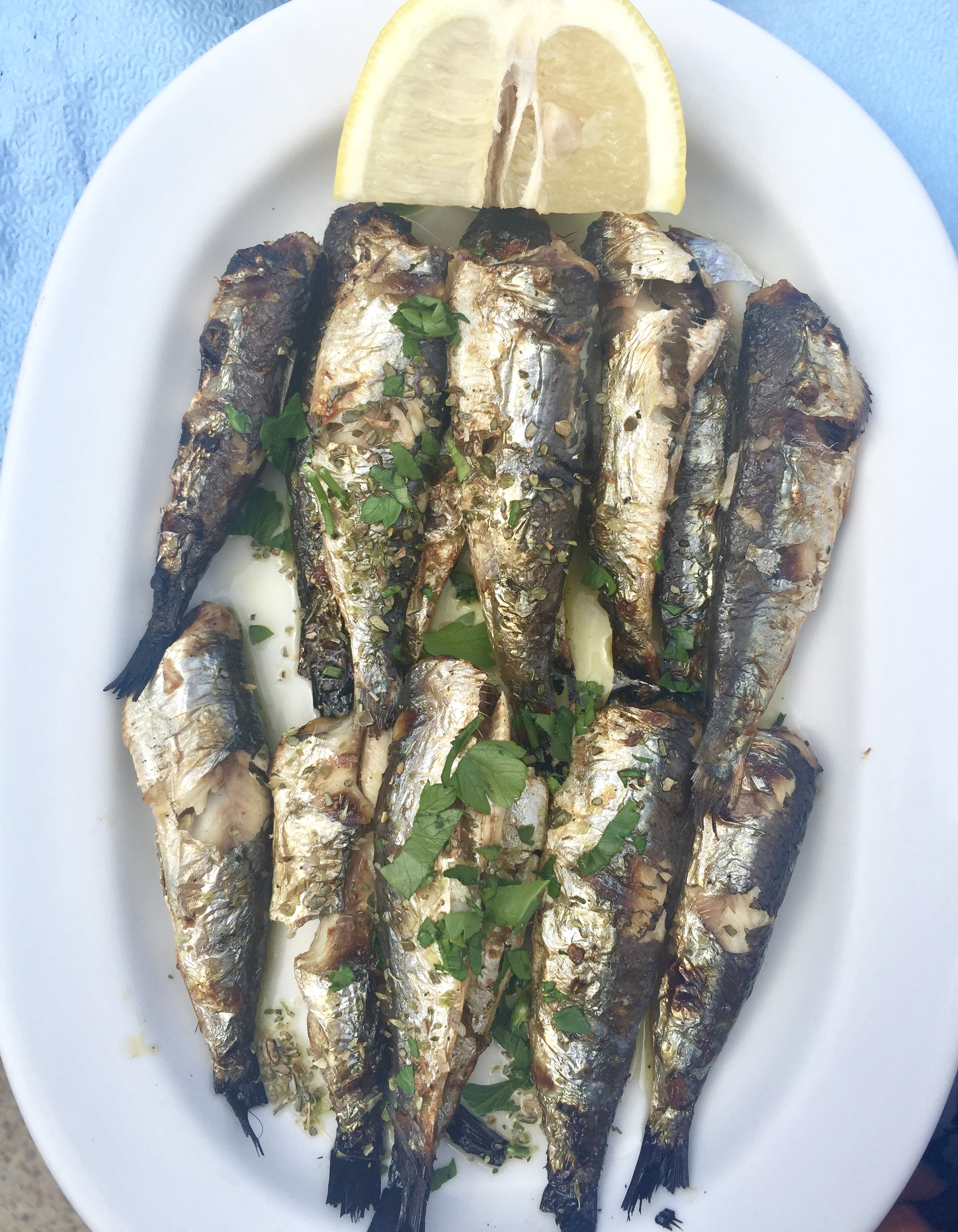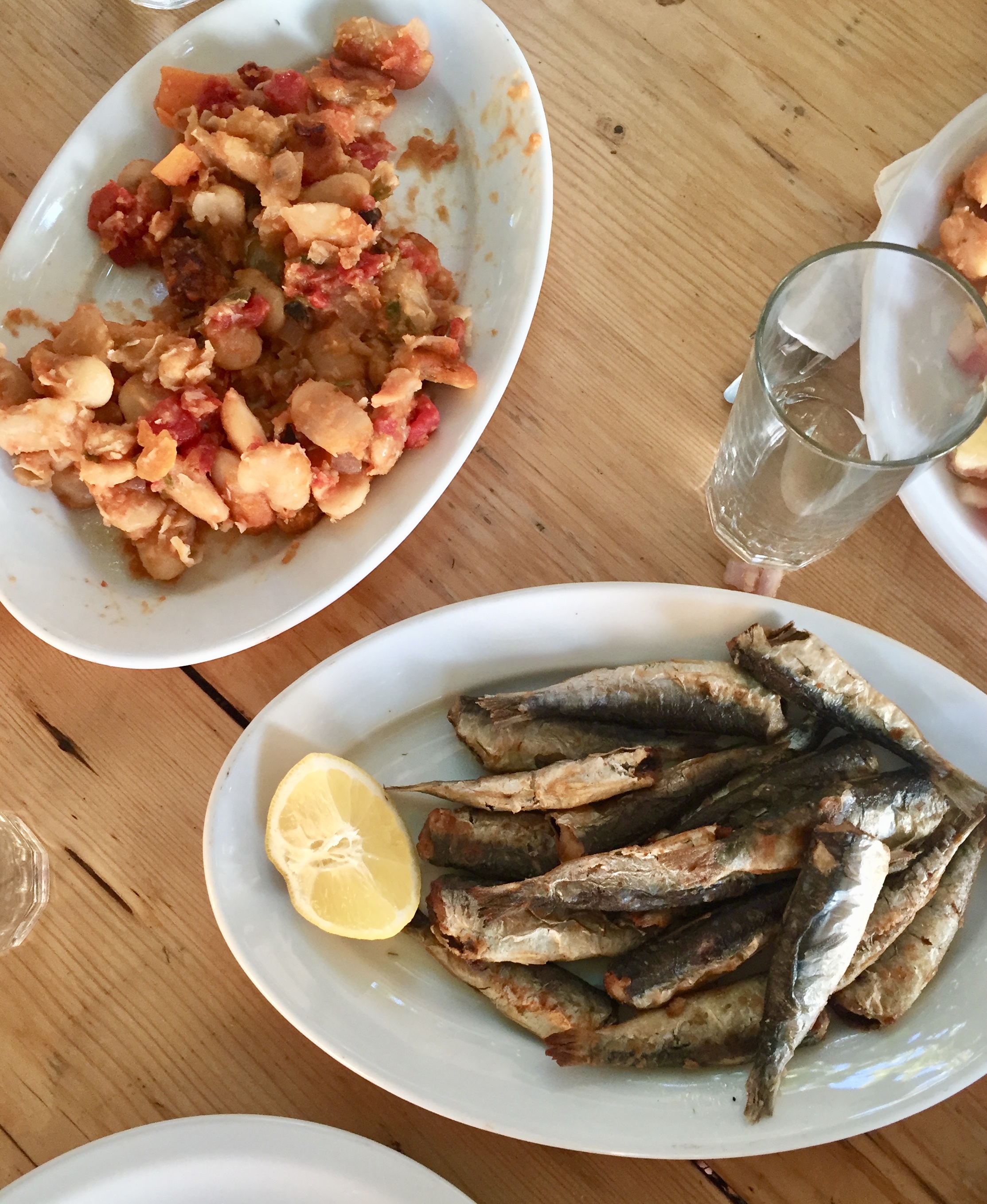- seafood most days, including whole grilled sardines (OMG THESE WERE TO-DIE-FOR. Eat the whole thing for protein from the flesh, healthy oils from the skin, and calcium from the bones), octopus (my other Mediterranean favorite), fried calamari, and whole fried fish that the fisherman delivered that morning. If you really want to have fun at dinner, don’t forget to dissect and eat your brain and eyeballs.