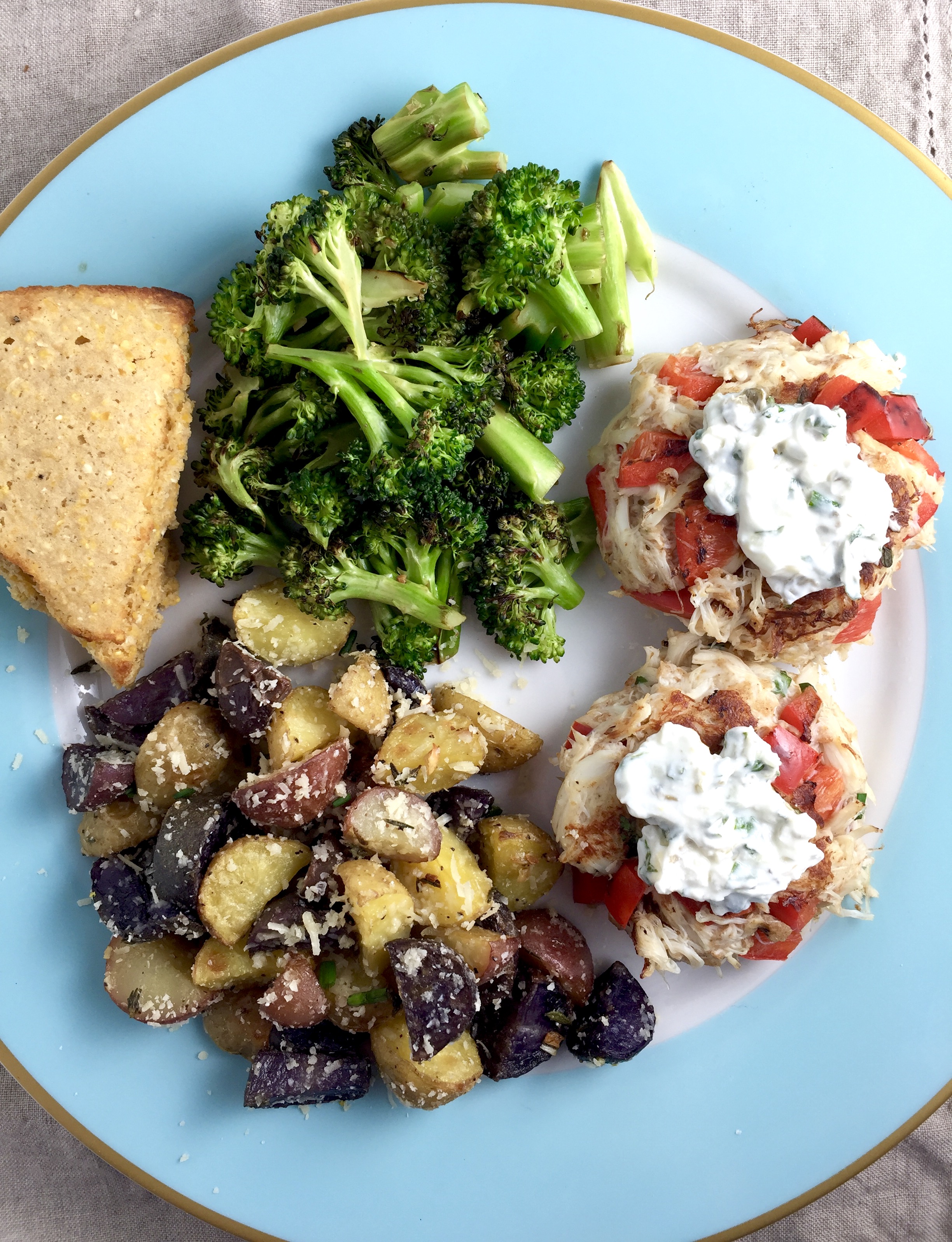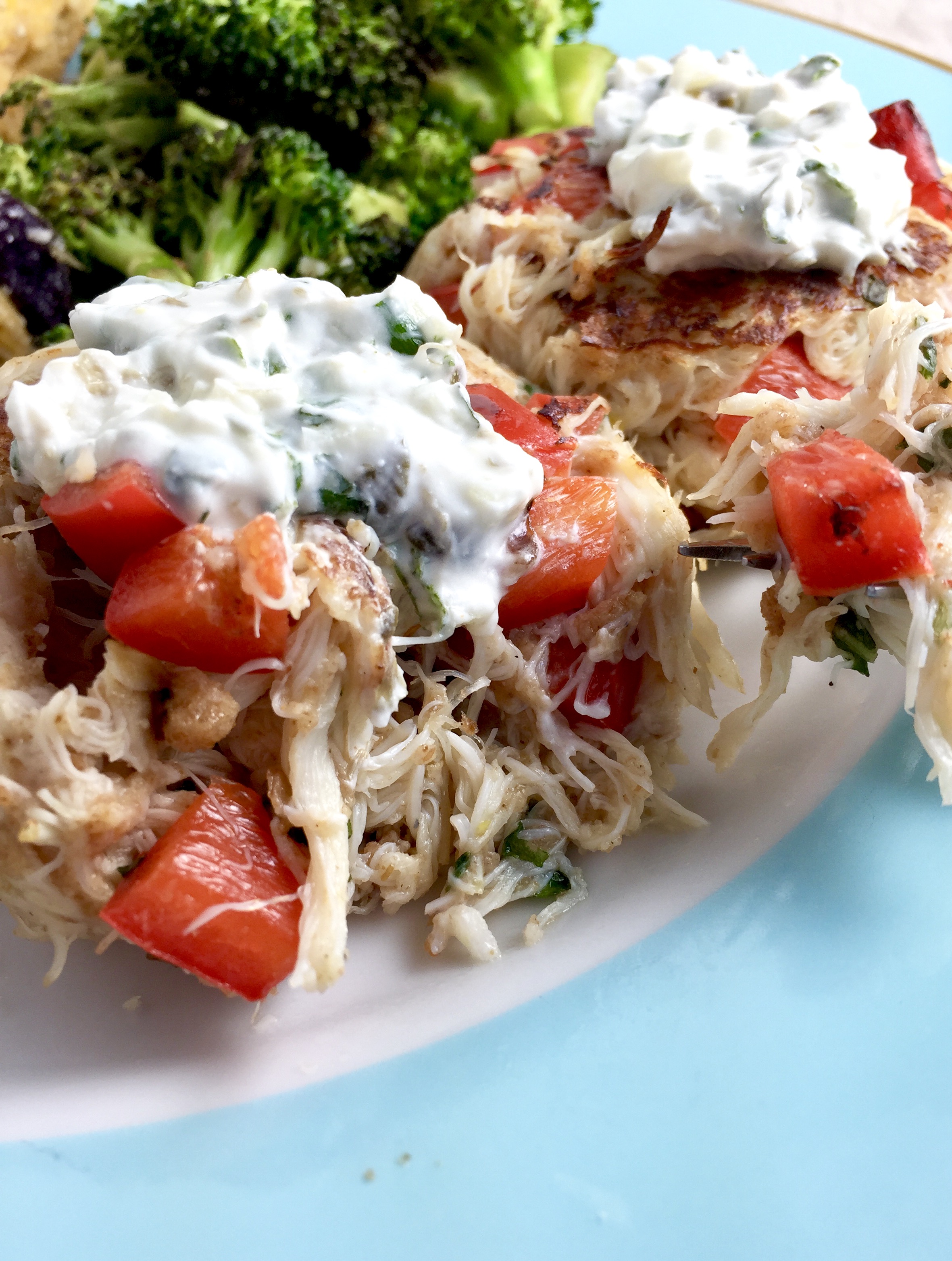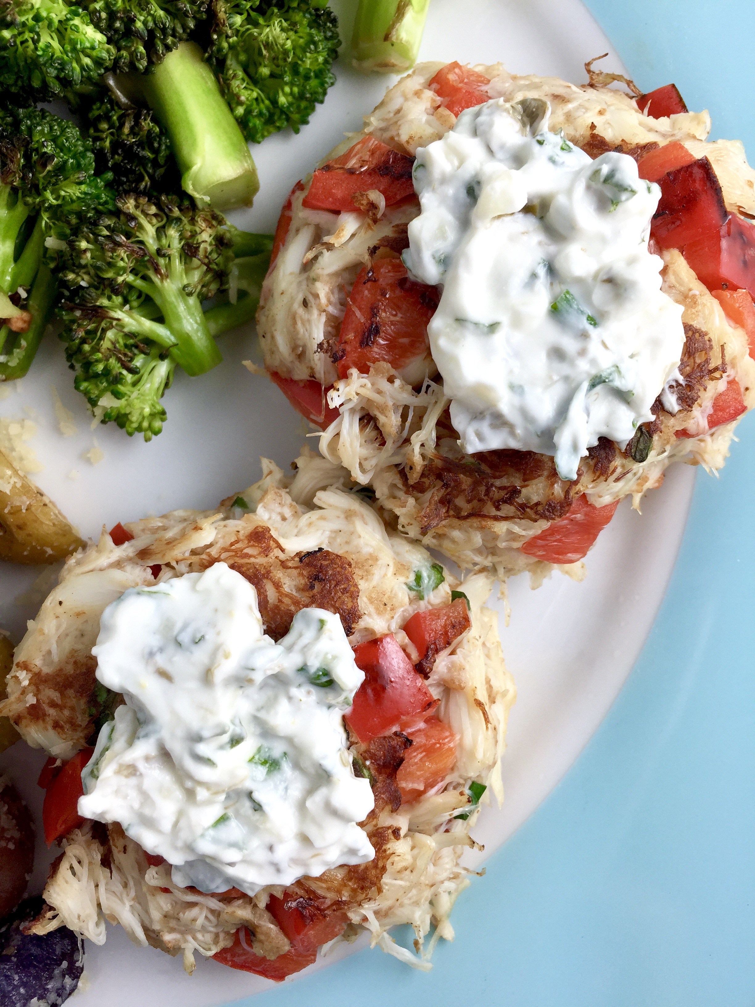And the flavor though…Old Bay, fresh herbs, chives, and a tangy lemon-garlic-caper-goat cheese-yogurt sauce (which is so thick and creamy and yummy and wonderful you just don’t even understand). Also, to be sure, good quality crab lends no “fishy” taste whatsoever, but is beautifully delicate and mild, a perfect canvas for fresh ingredients bursting with flavor.