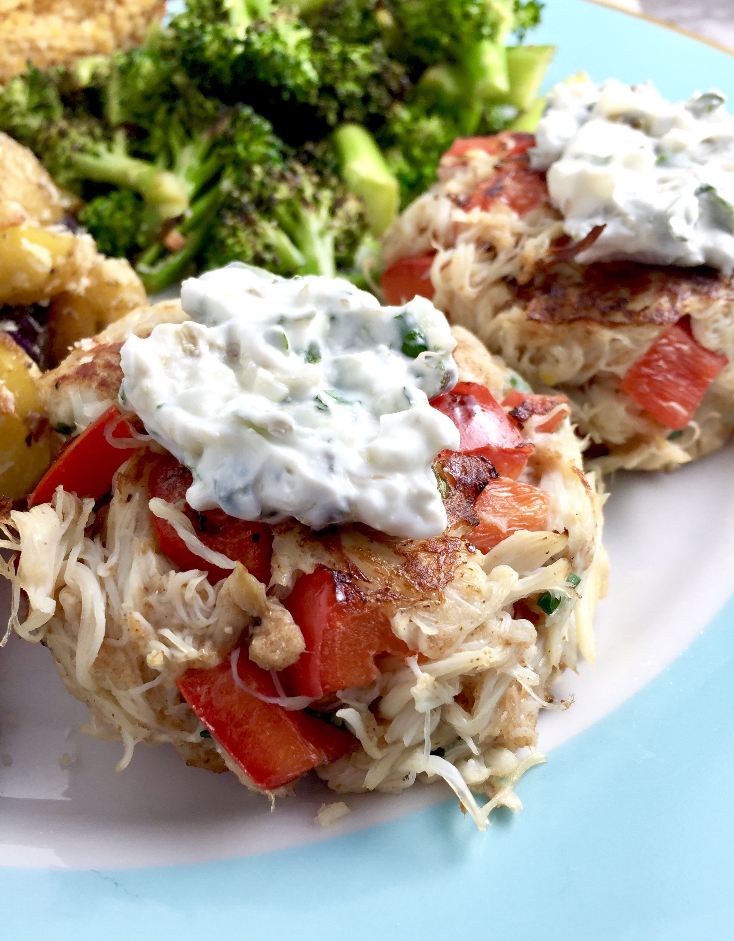 Jumbo-lump crab + creamy Greek yogurt + just enough whole grain breadcrumbs makes a heavenly succulent texture, with a little crisp from bell pepper and a pan-seared exterior.