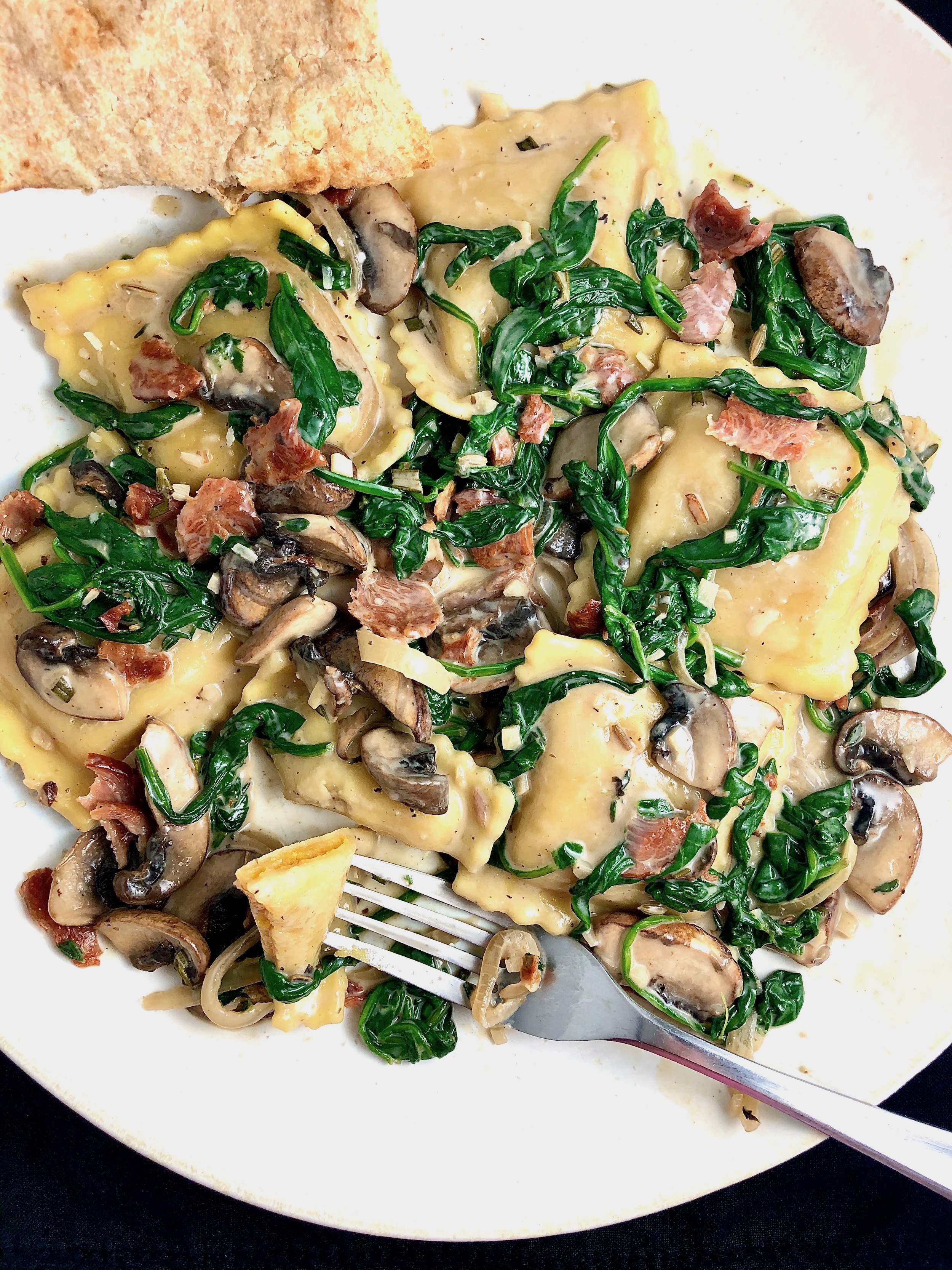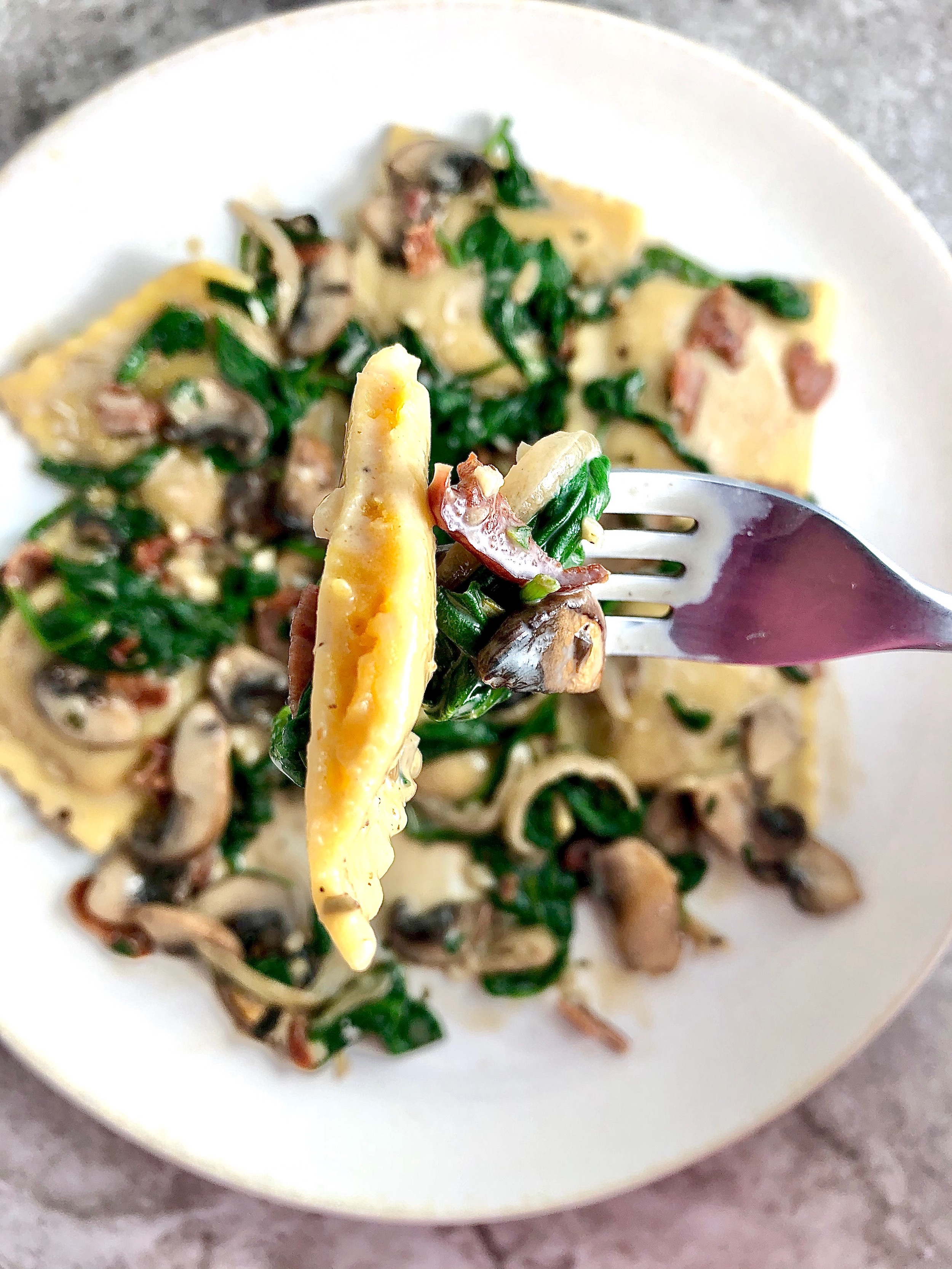Savory mushrooms, spinach, and onion coated in a light creamy sauce with lots of garlic, herbs, parmesan, and bacon, all tossed with sweet pillowy butternut ravioli. Super fast, easy, and healthy with gourmet taste and loads of flavor.