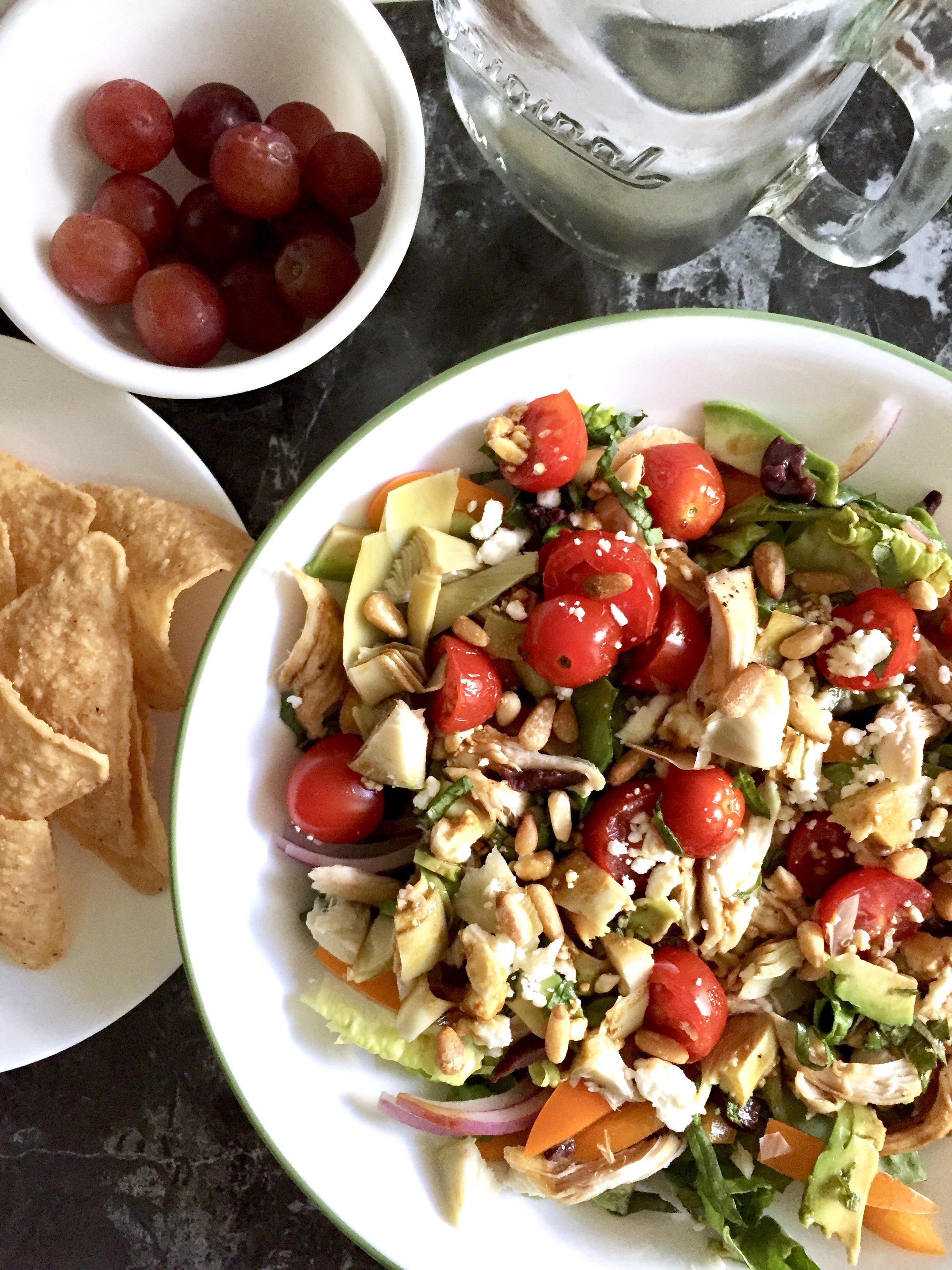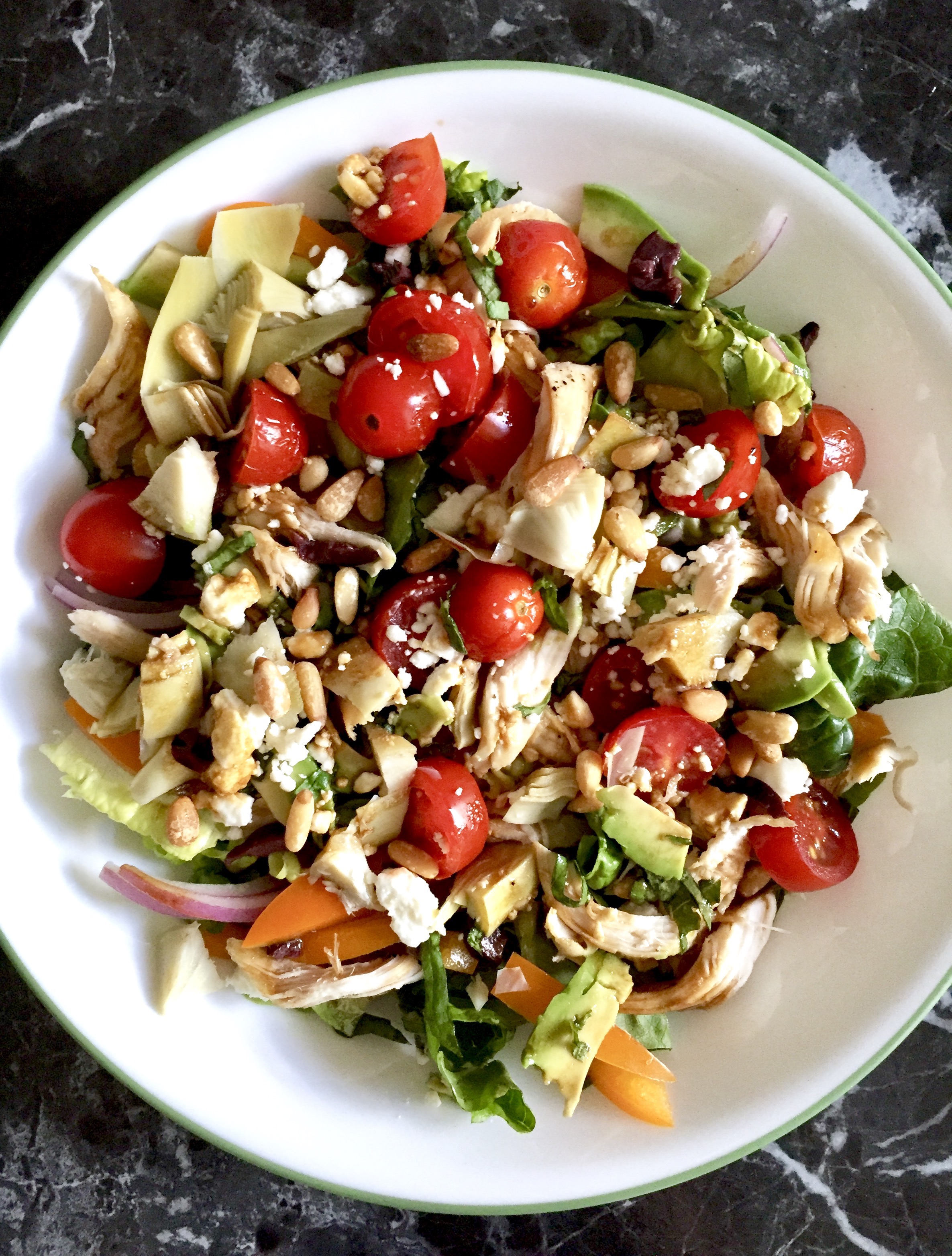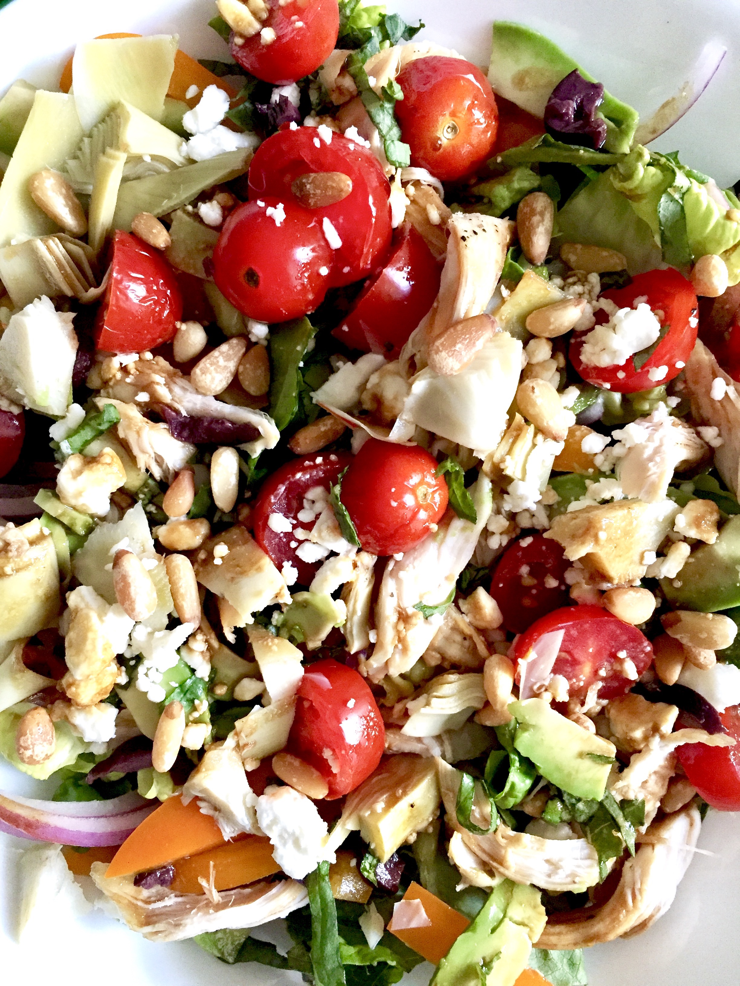 Colorful, wholesome, and refreshing, but also hearty and satisfying: Crisp Romaine and bell pepper, tender pulled chicken, juicy tomatoes, tangy artichokes and olives, creamy avocado and feta, toasty pine nuts, and a glossy balsamic dijon vinaigrette.