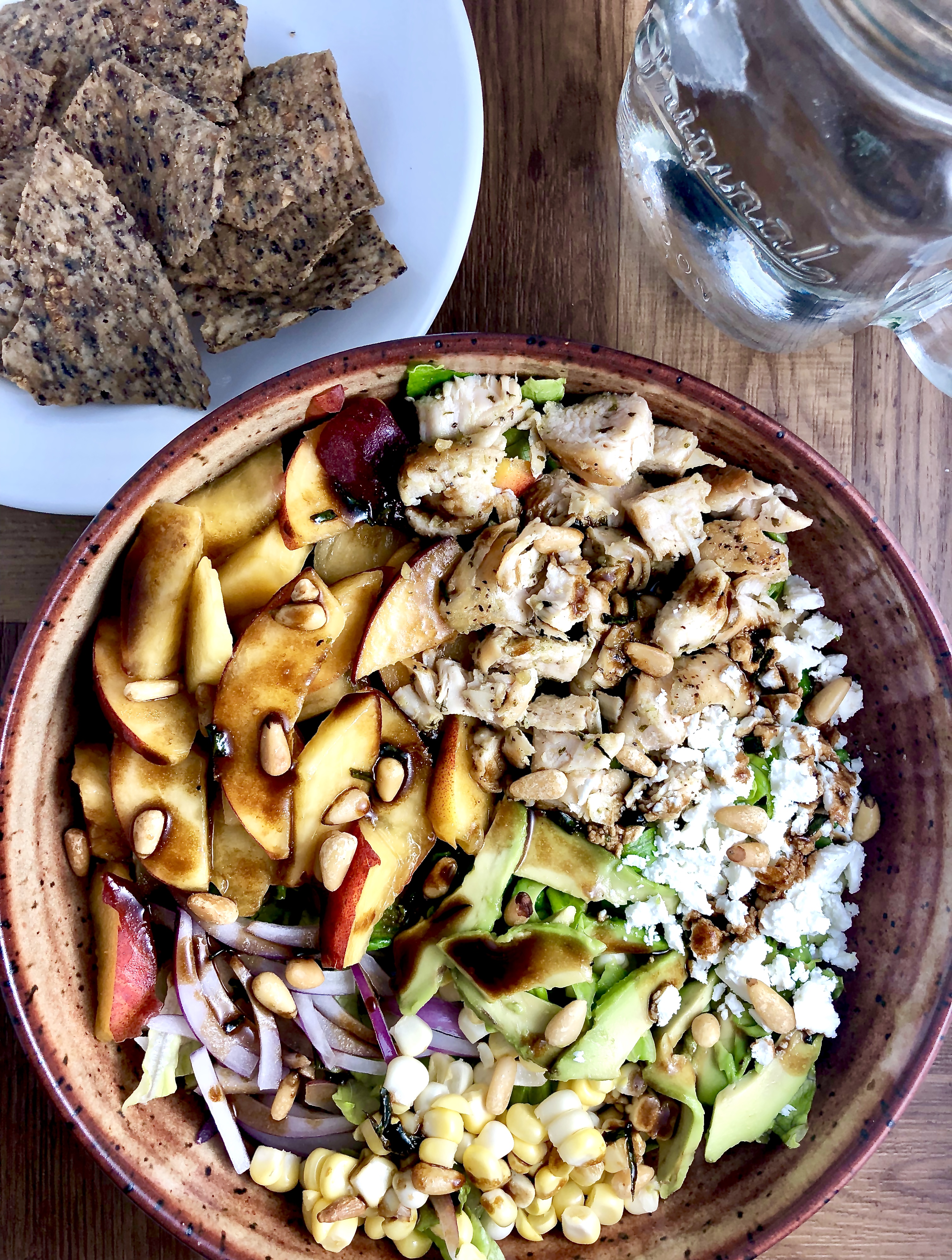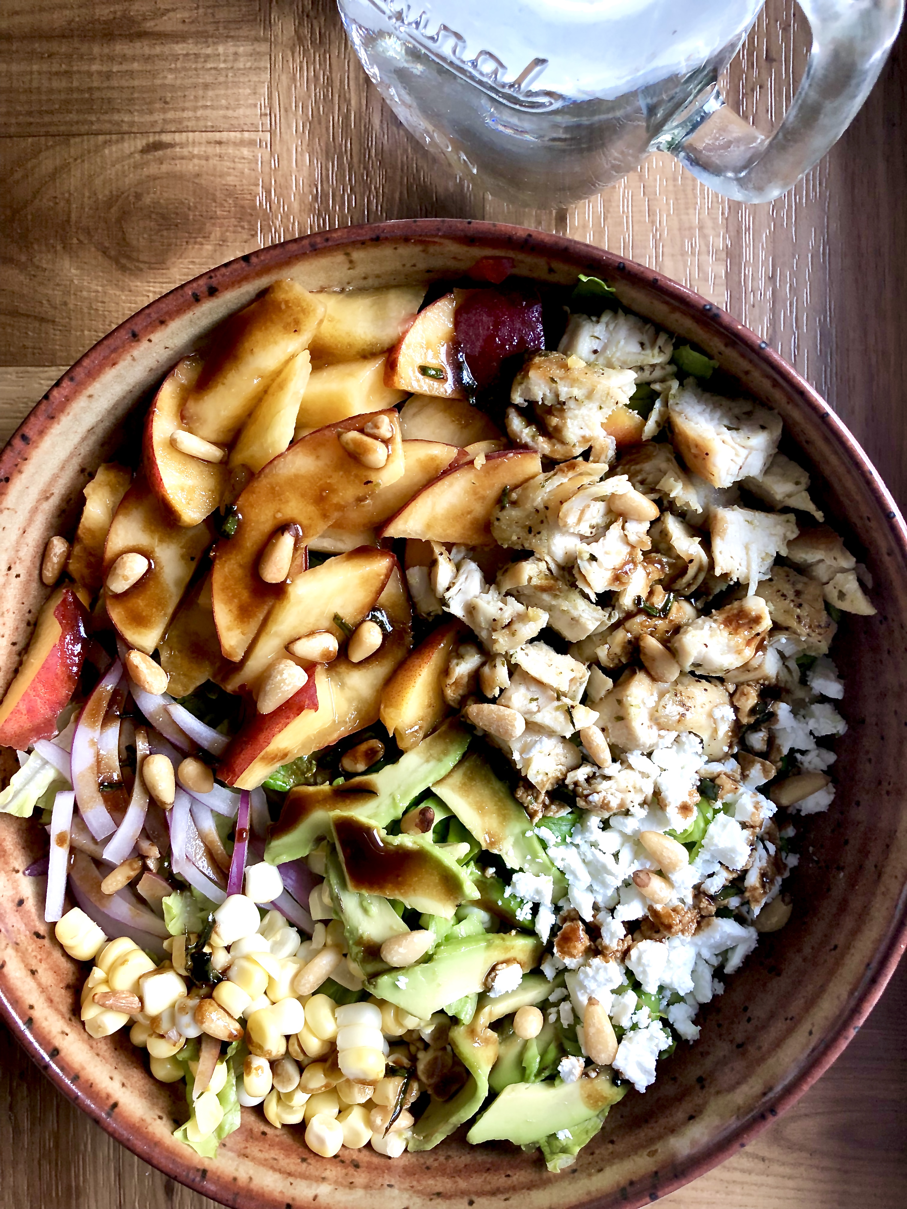 Juicy summer peaches and corn, pesto grilled chicken, creamy avocado and tangy goat cheese, red onion, toasty pine nuts, and an easy honey balsamic dressing tossed with crisp Romaine. Aka a CRAVE-WORTHY bowl of summertime.