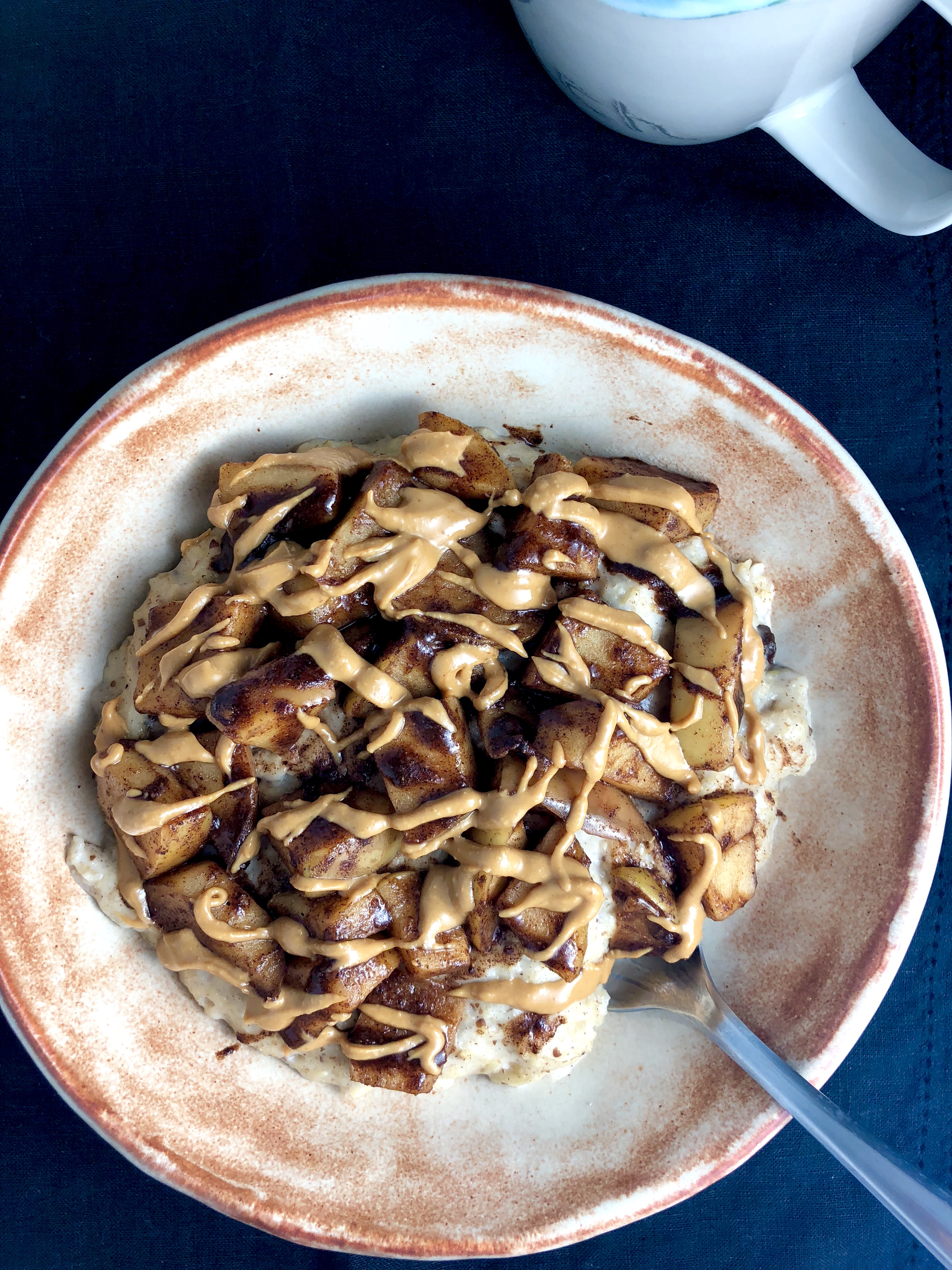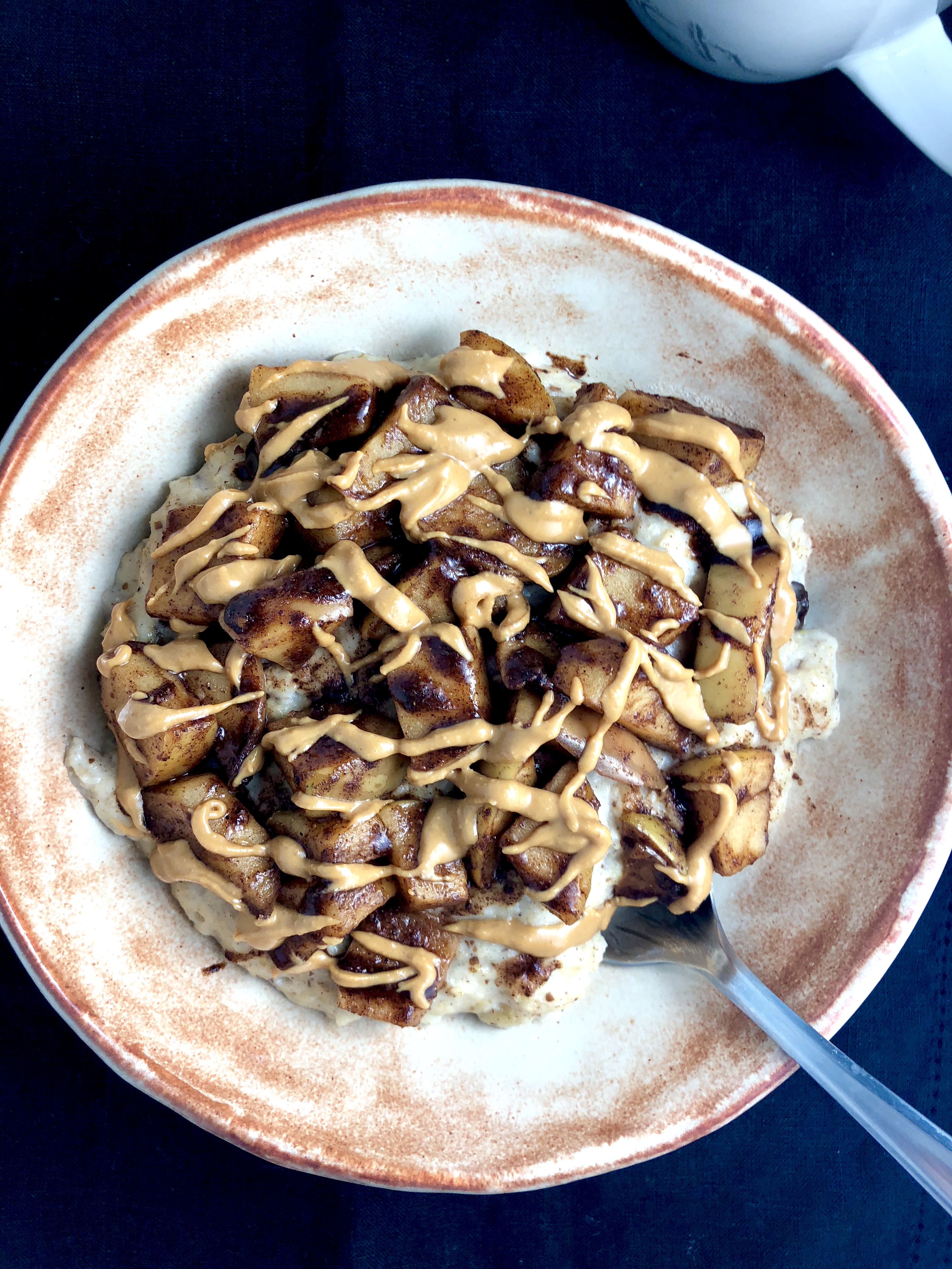 Rub a small skillet with a little coconut oil and heat over medium. When the pan is hot, stir in the chopped apple with a generous sprinkle ground cinnamon and a dash each of nutmeg, ginger, and allspice. Cook, stirring occasionally, for a couple minutes, until the apples are slightly browned (crisp, juicy, and tender!) Transfer apples to a separate bowl, THEN toss them with the maple syrup. (Drool at the sticky glaze that forms from the maple syrup and yummy spices!) Finally, top your prepared oatmeal with the maple apples and peanut butter. Enjoy!