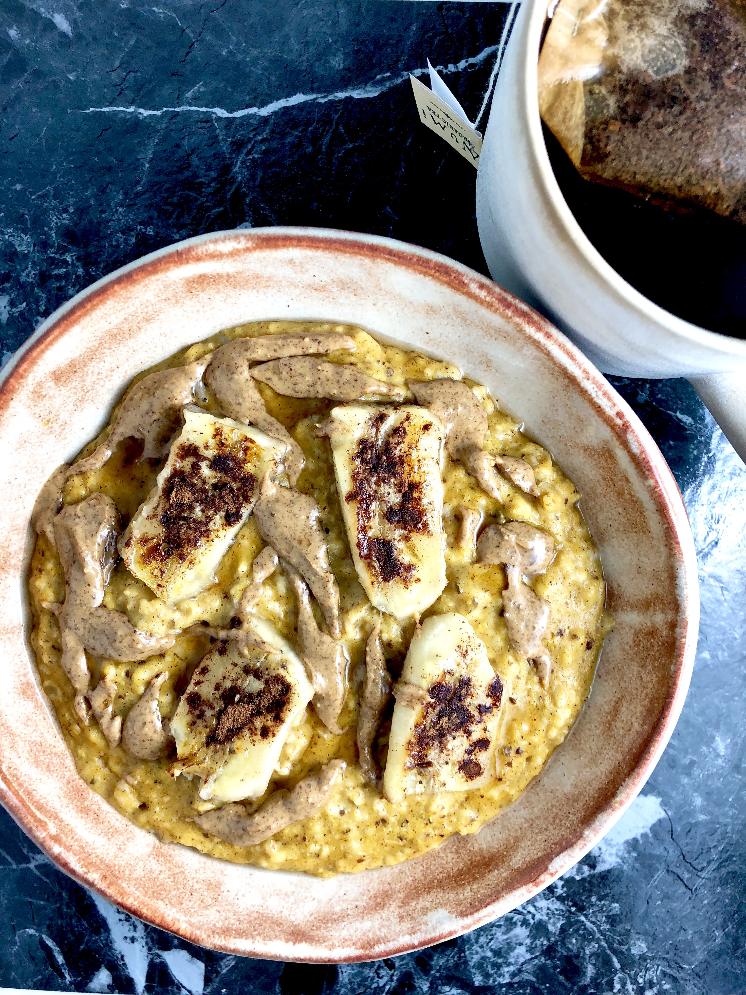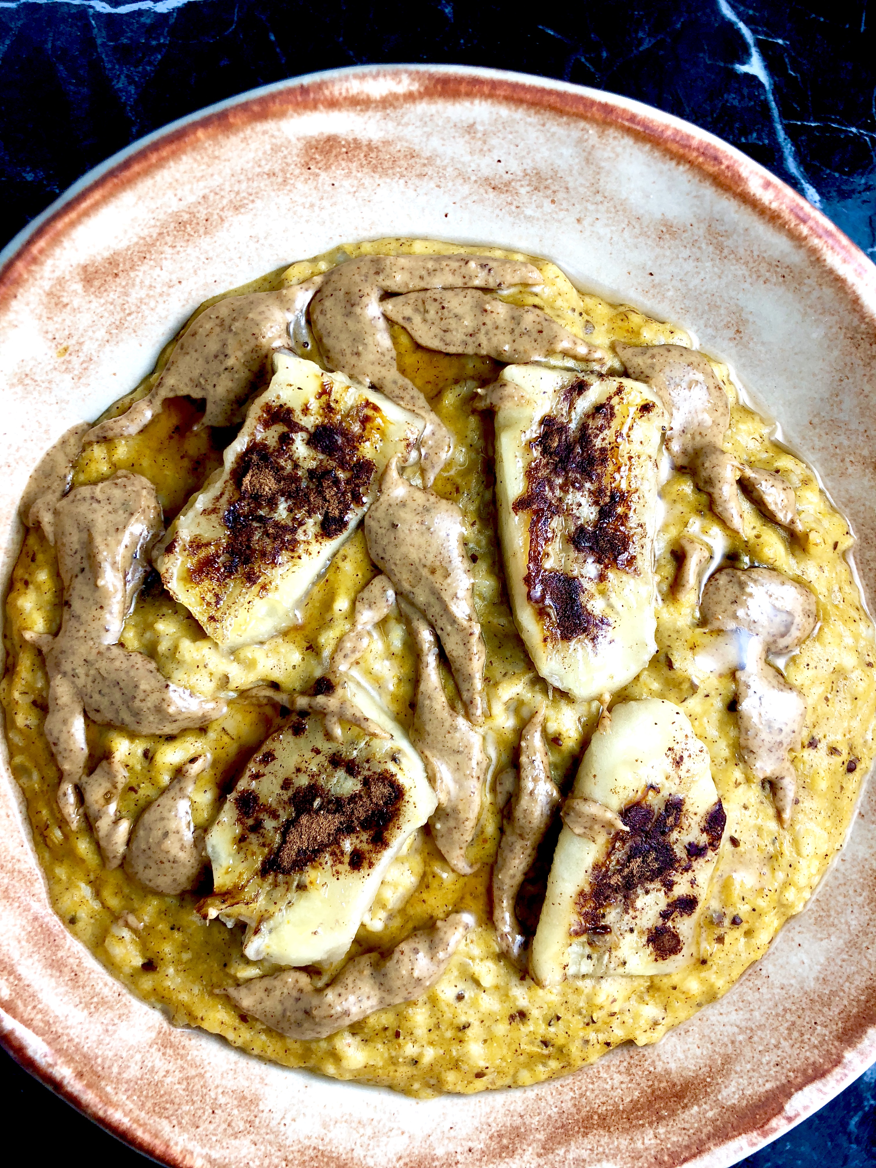 That’s right, there’s no better way. Hearty oatmeal is mixed with pumpkin, sweet fall spices, vanilla, and a touch of maple syrup, then topped off with caramelized banana and a huge dollop of drippy maple almond butter (Justin’s brand).