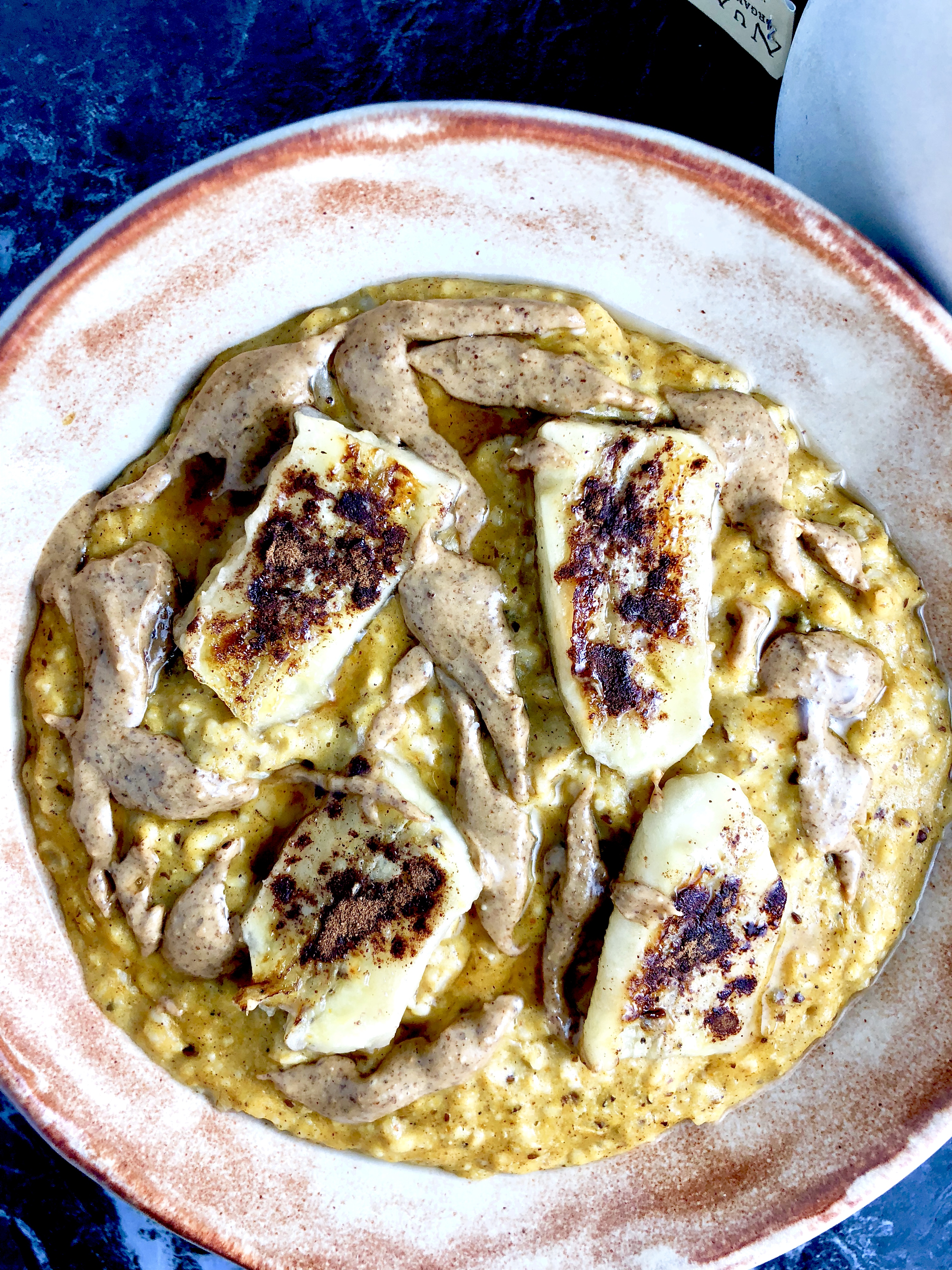 For the seared banana, all you have to do is slice a ripe banana, sprinkle it with some pumpkin pie spice, and give it about a minute in a hot skillet with a tiny bit of coconut oil. Caramelized heaven in no time!