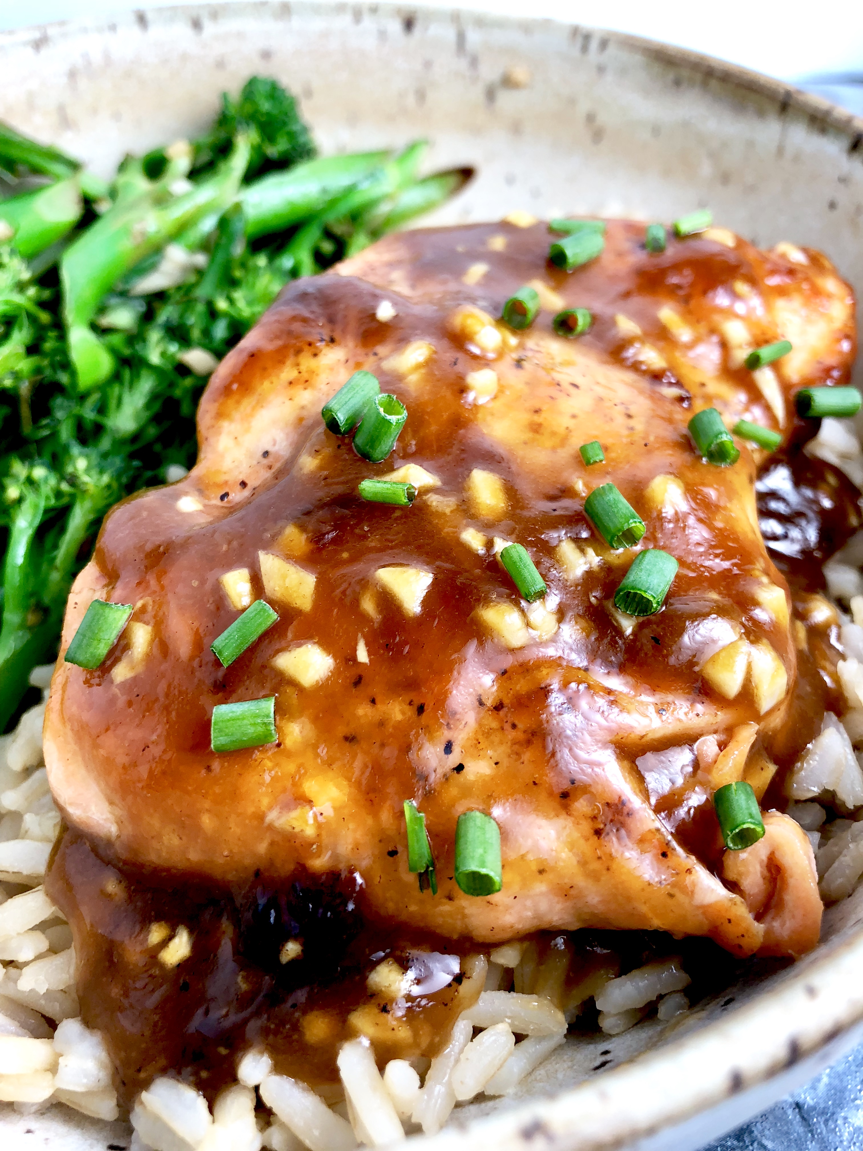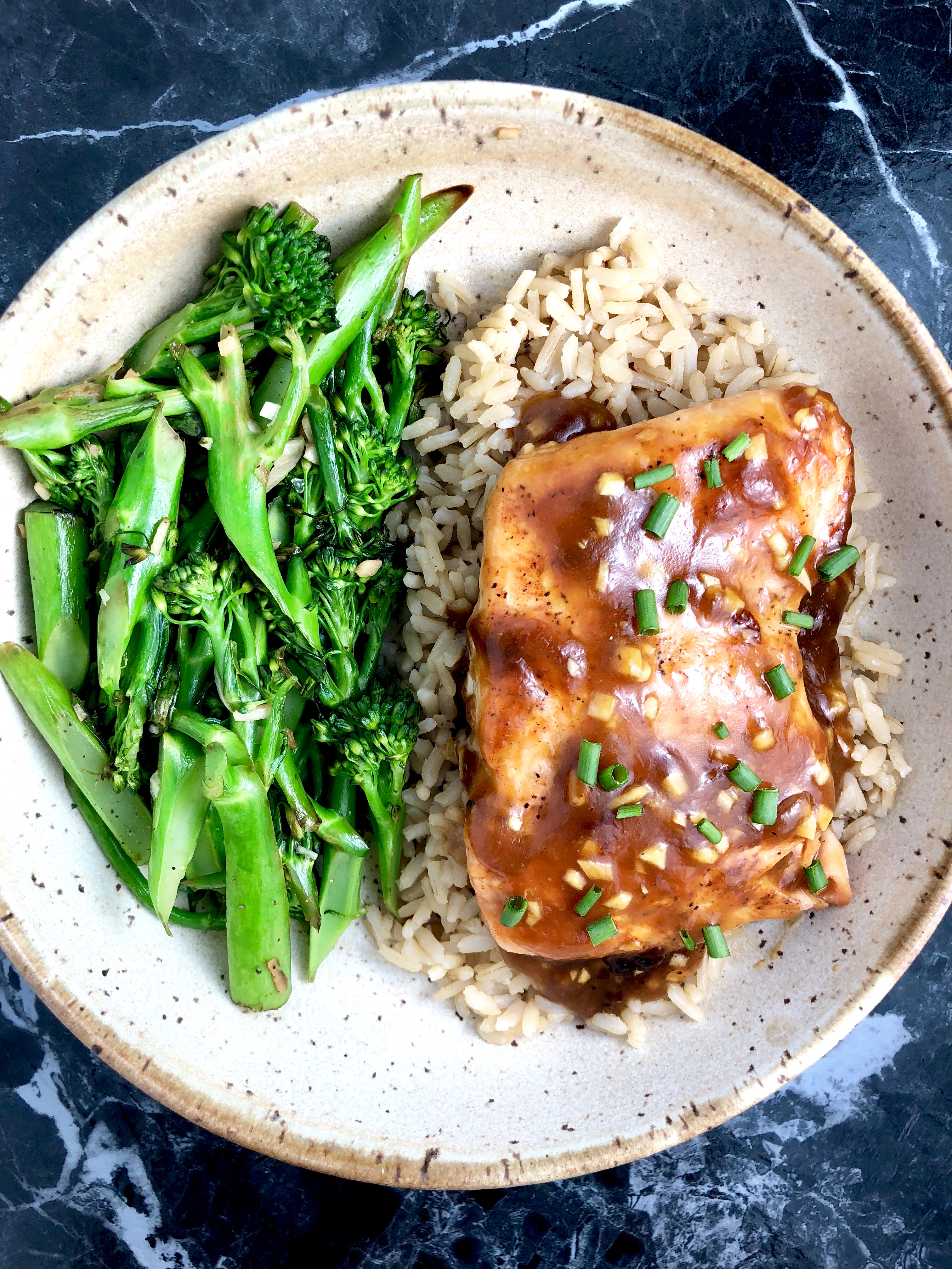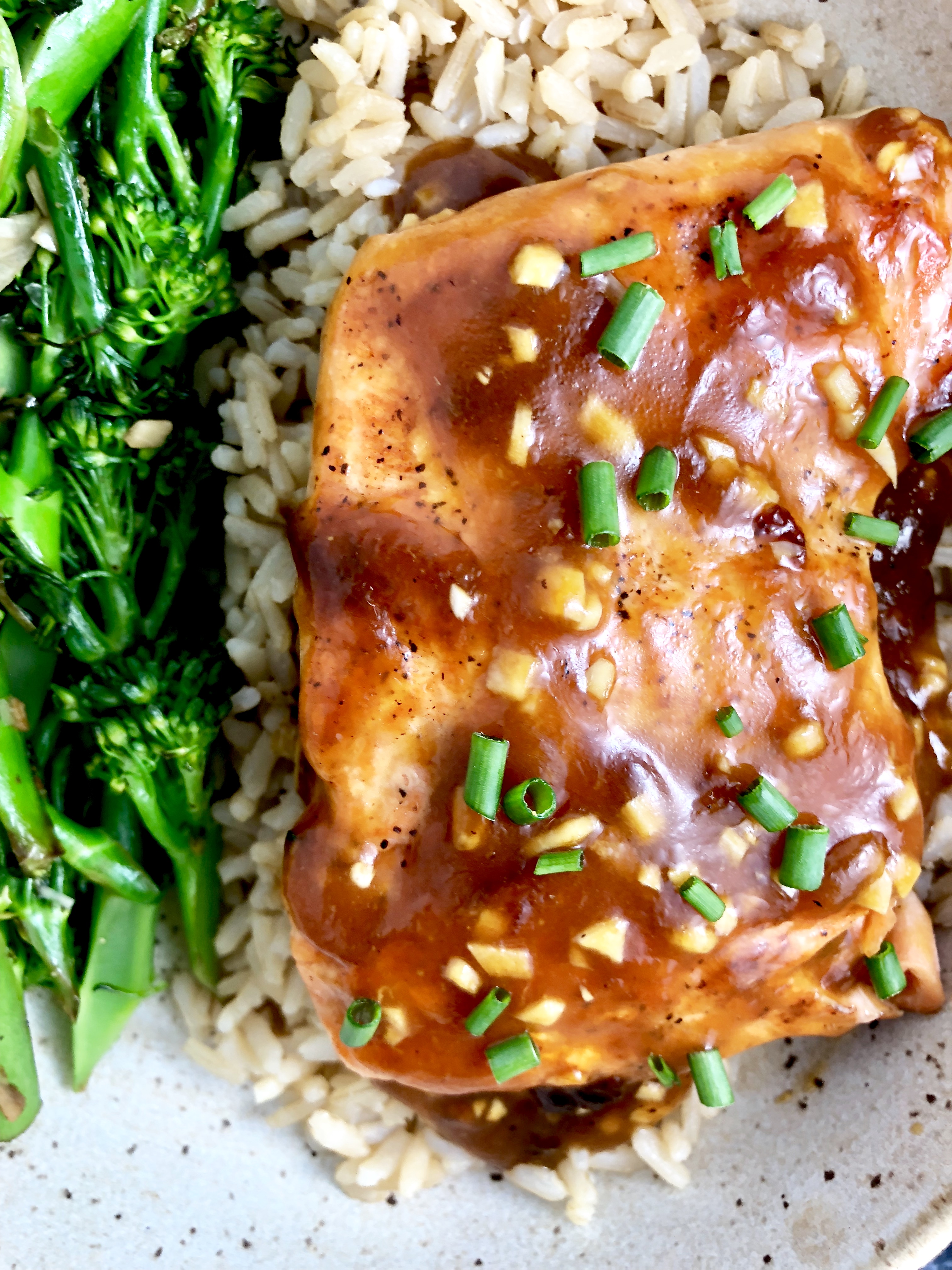 Tender and flaky seared salmon smothered in a sweet, sticky, garlicky orange soy glaze. Served with wholesome brown rice and sautéed lemon garlic veggies for the ultimate quick and easy weeknight dinner. Plus, eating out of a big bowl is always more fun.