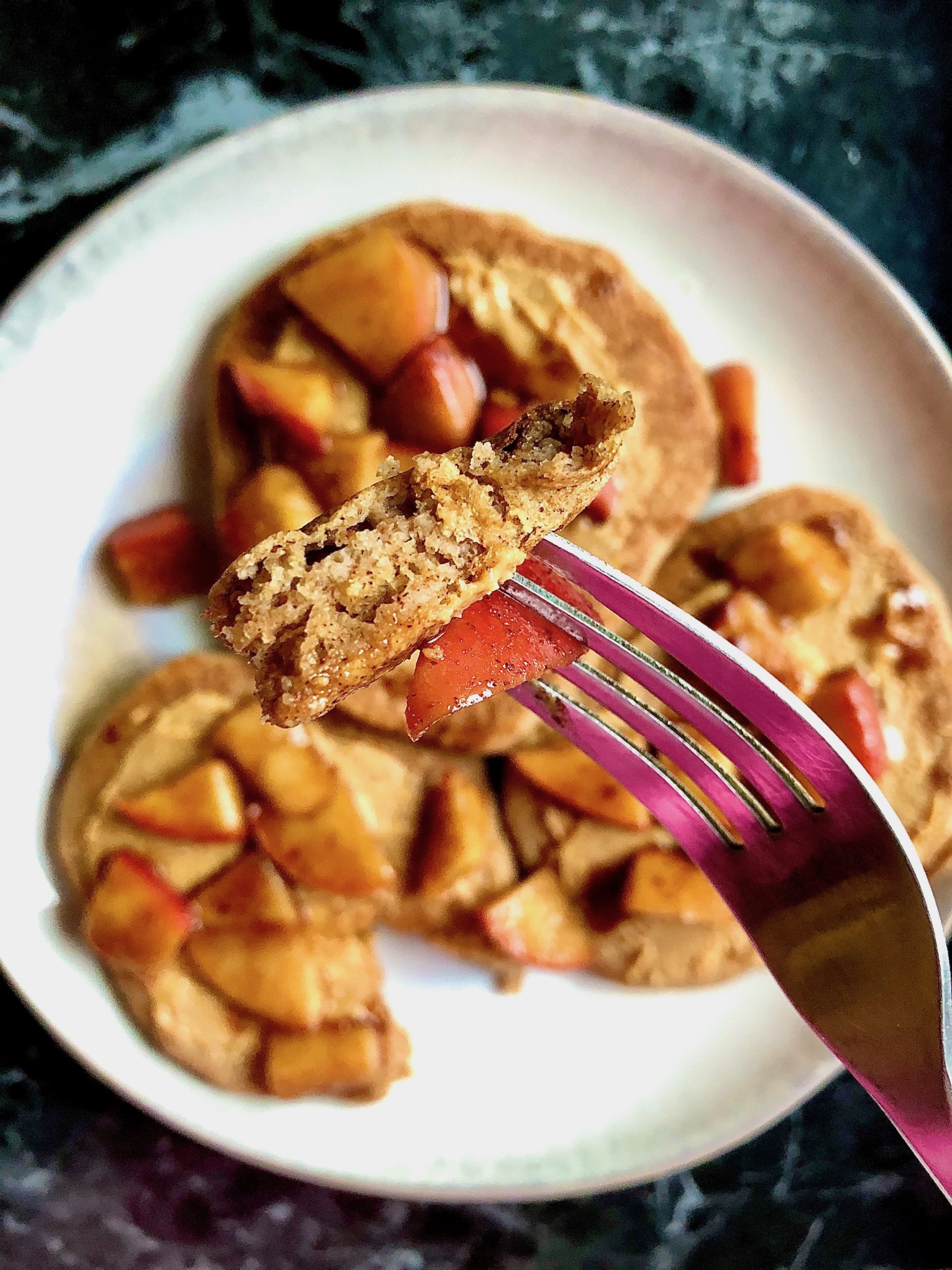 Finally, the sautéed maple apple topping is shockingly quick and simple to make, and it magically delivers an apple pie-like indulgence to your meal. Plus, you can do it all in the same skillet! Just sauté chopped apple with a sprinkle of cinnamon while you’re prepping the pancake batter, then transfer the hot apples to a small bowl and mix with pure maple syrup and vanilla until glossy and saucy. A slather of melty peanut butter brings everything home in terms of flavor and satisfaction–omit at your own risk. 😉