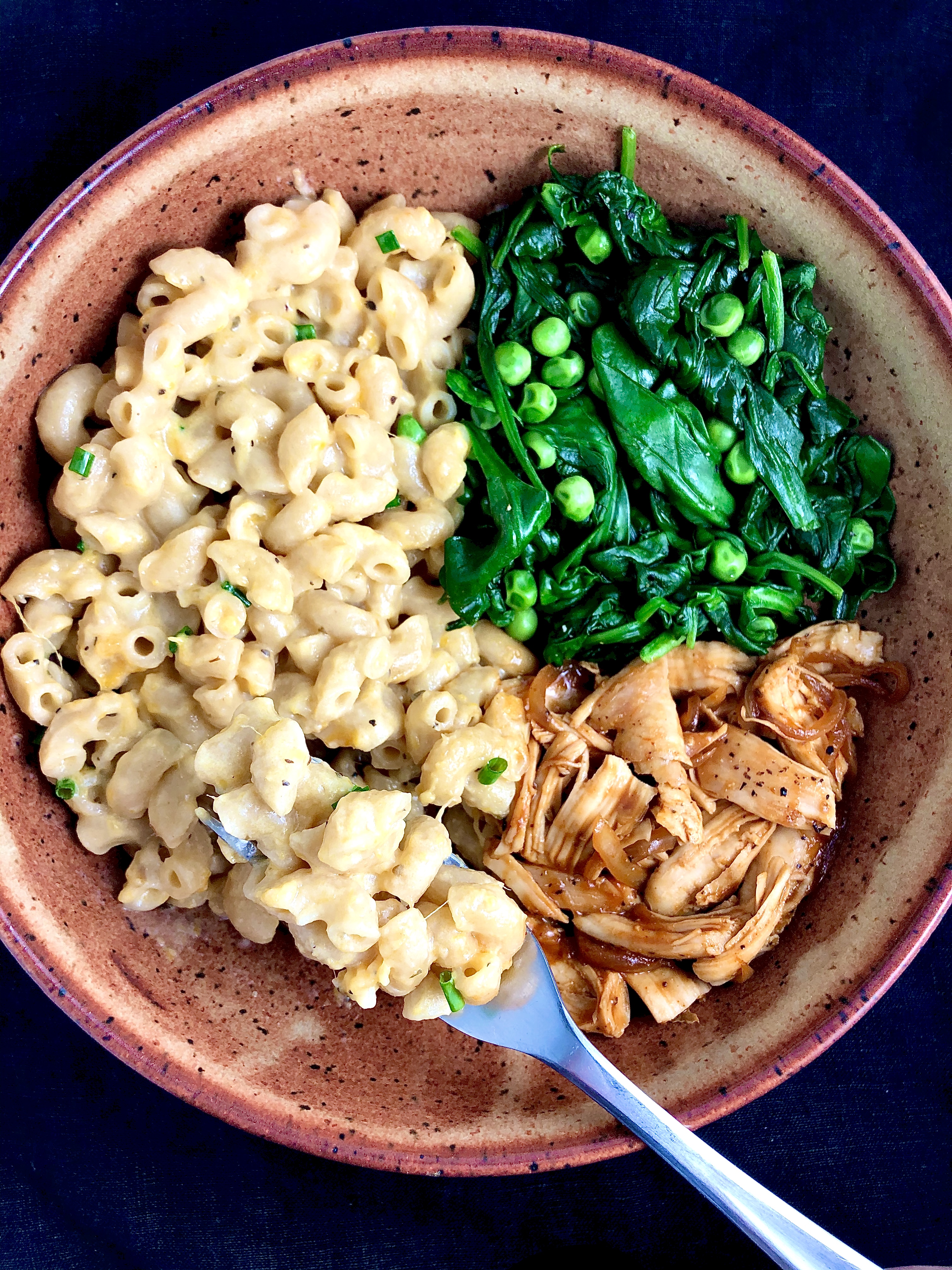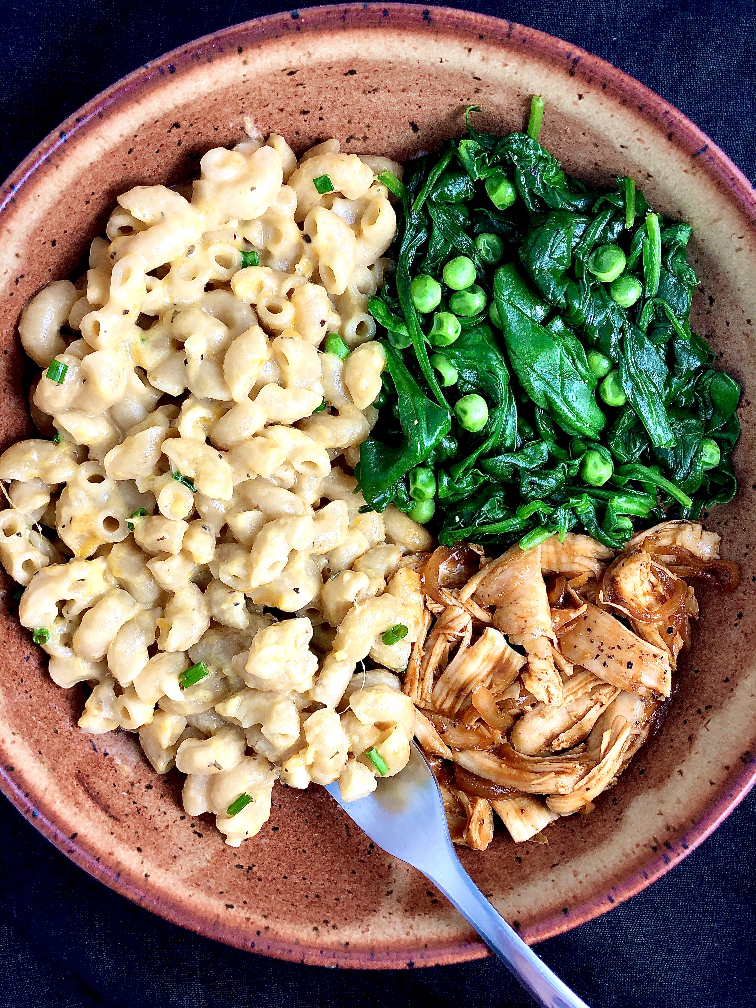 - lightly sautéed spinach and frozen sweet baby peas, with a touch of flaky sea salt and black pepper