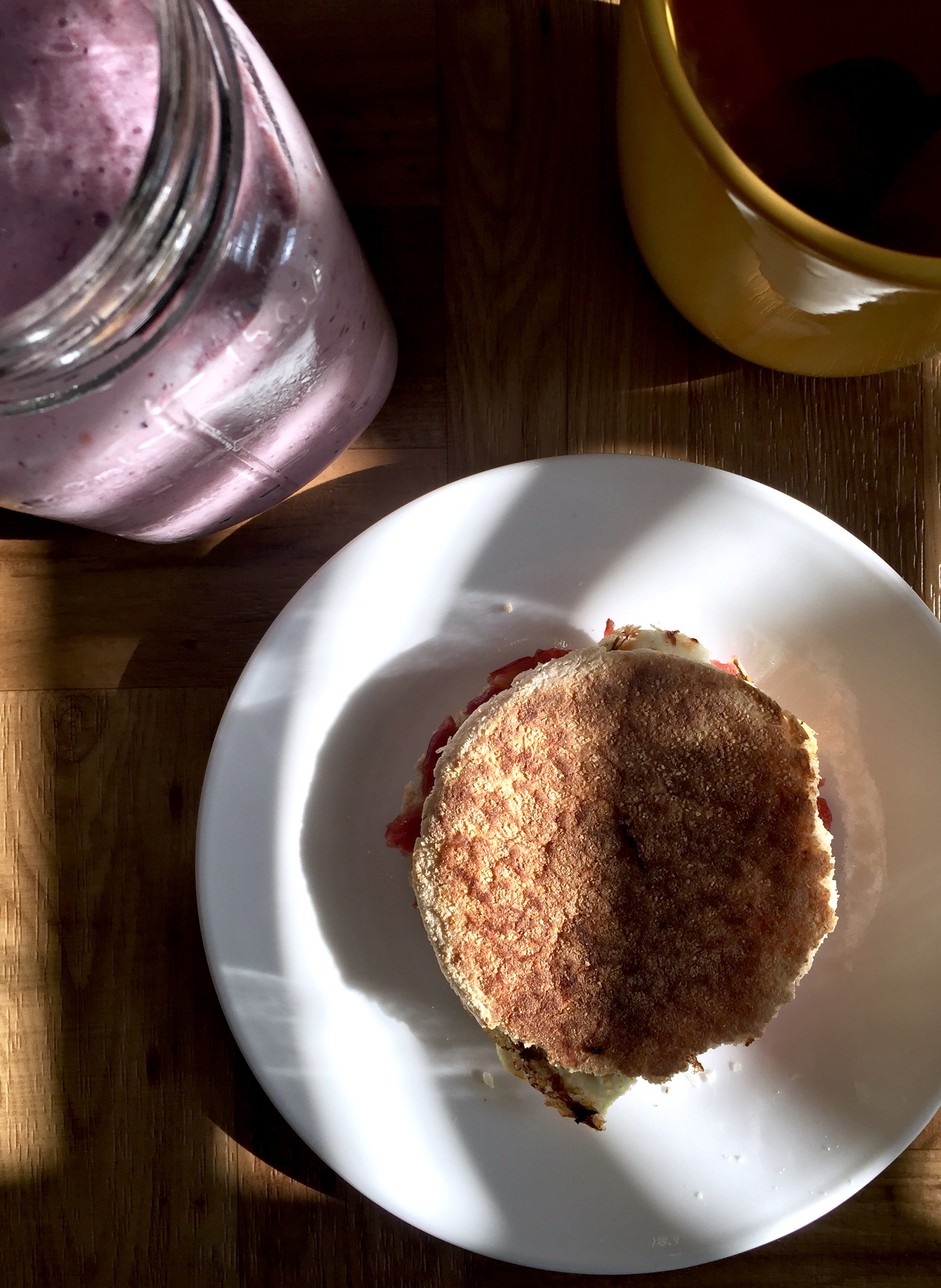 My favorite way to drink this smoothie is at breakfast, paired with something like the turkey bacon/fried soft egg/white cheddar/herbs de Provence panini on a {thinly sliced} whole grain English muffin, shown below. Together, this is definitely one of the most satisfying and delicious breakfasts I ever make. Filling, wholesome and balanced, easy to throw together, refreshing and comforting all at once, and oh my flippin’ gosh so YUMMY.