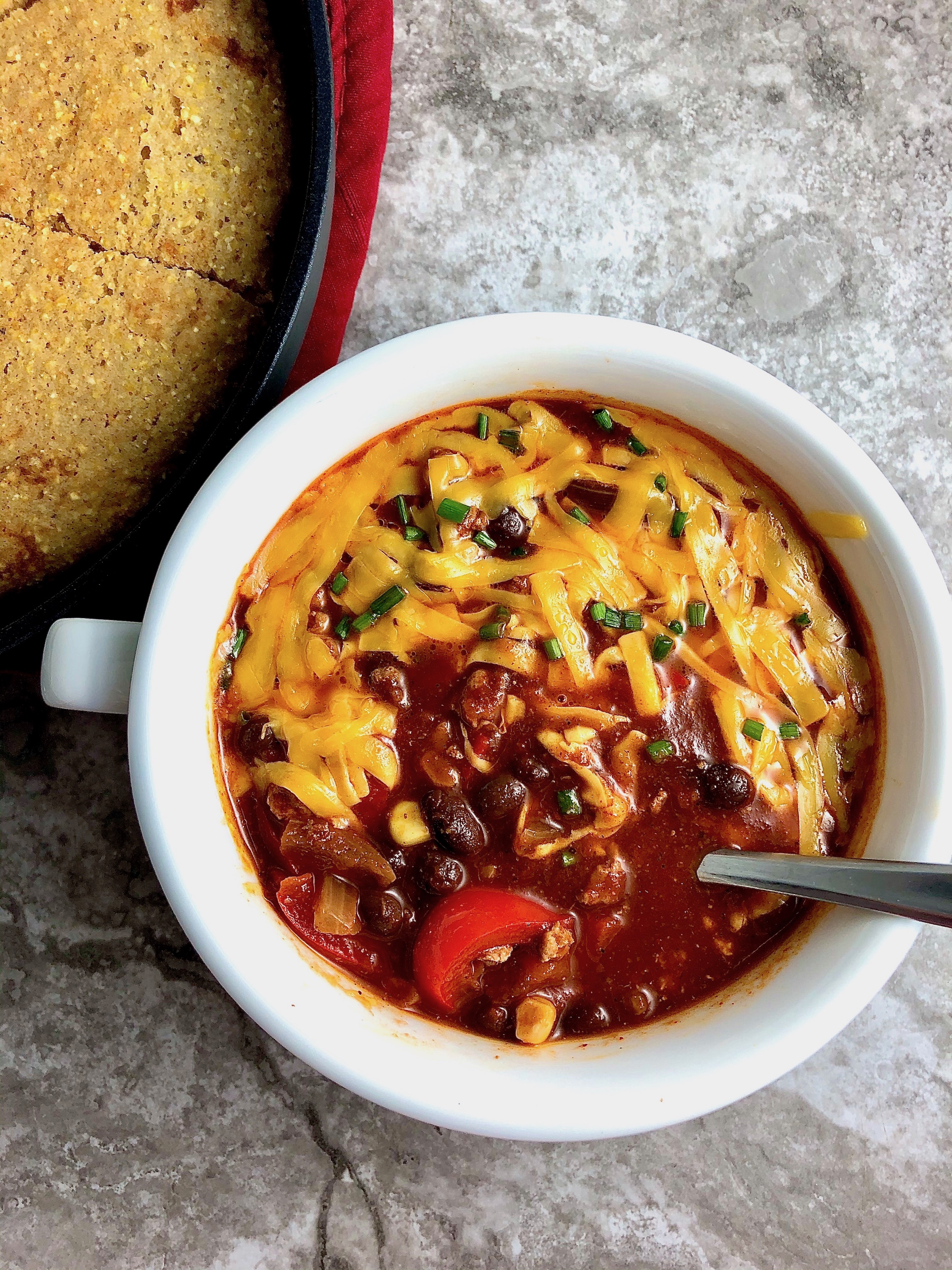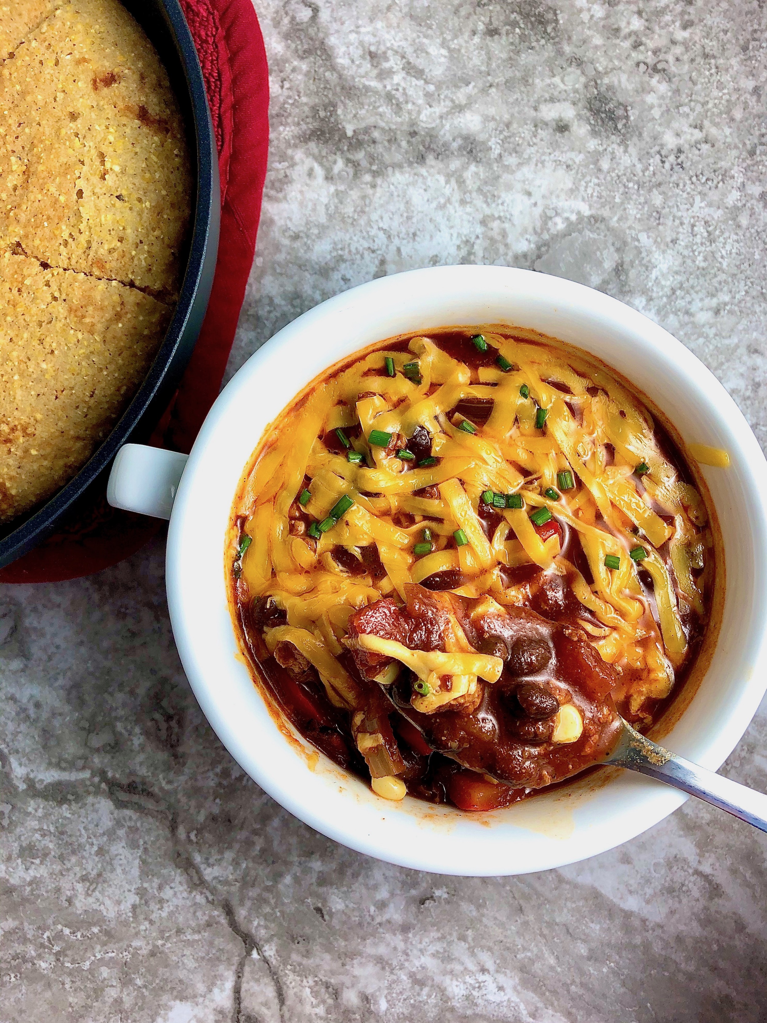 While the chili is cooking, whip up a batch of this super quick, buttery yet light, whole grain buttermilk skillet cornbread—literally one bowl and 12 minutes in the oven. It also freezes beautifully and only needs 10 minutes from frozen to toast to perfection. It’s essentially the common dinner roll’s secret superhero cousin…made from scratch.