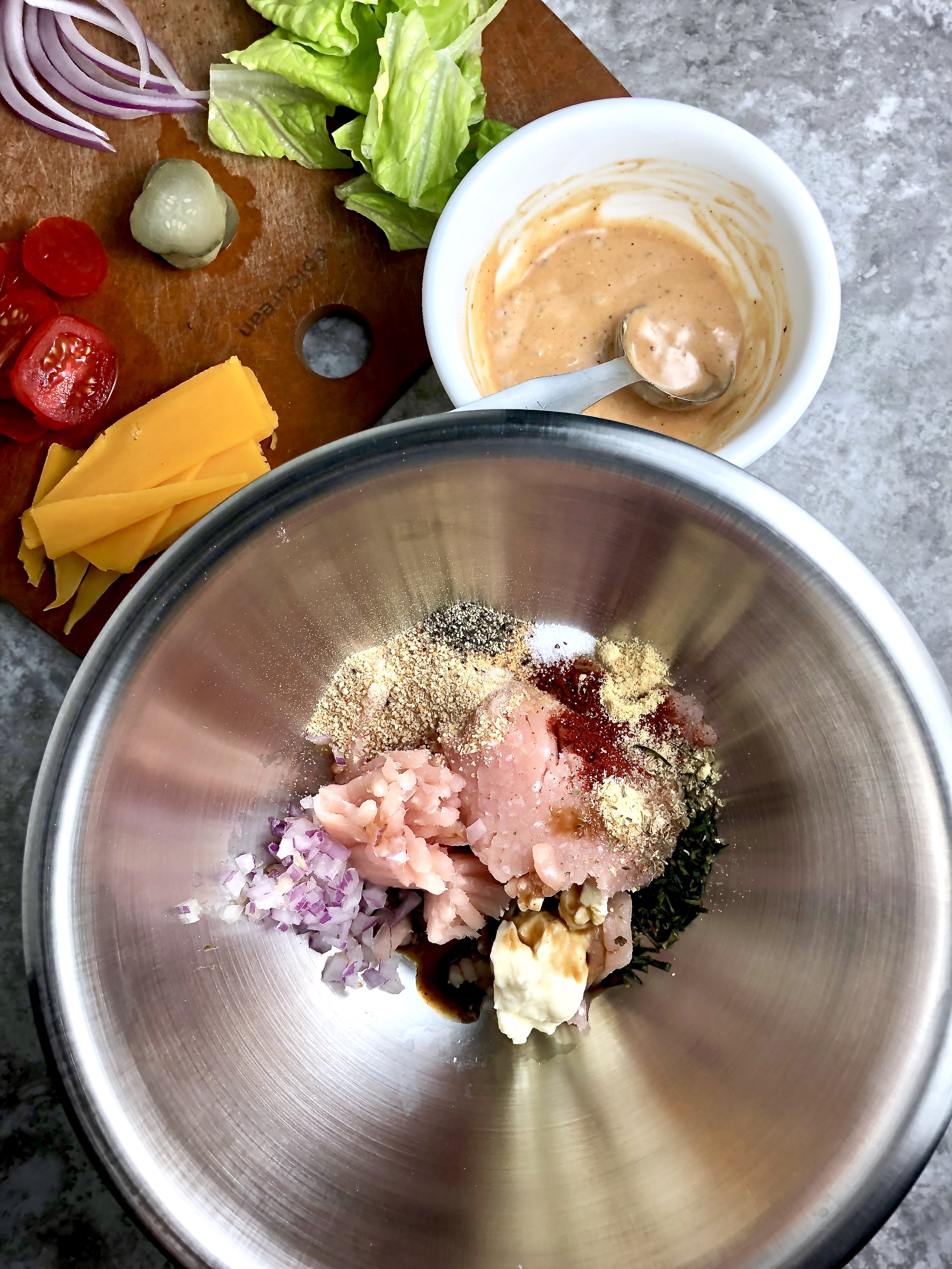 - Mix the seasoning ingredients in a mixing bowl. Add the ground turkey, light mayo, Worcestershire sauce, finely diced onion, and breadcrumbs. Mix with hands until evenly incorporated, but don't over-mix. Shape into 2 patties.
