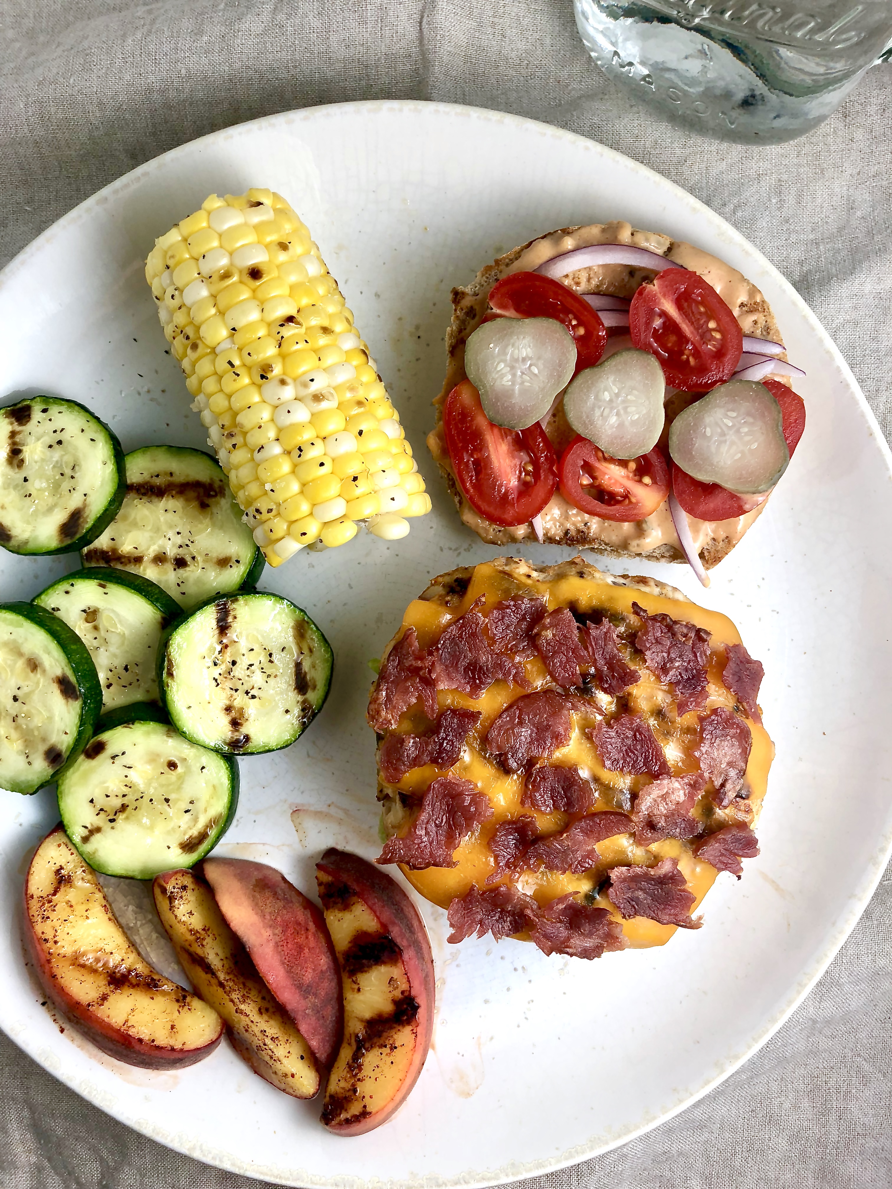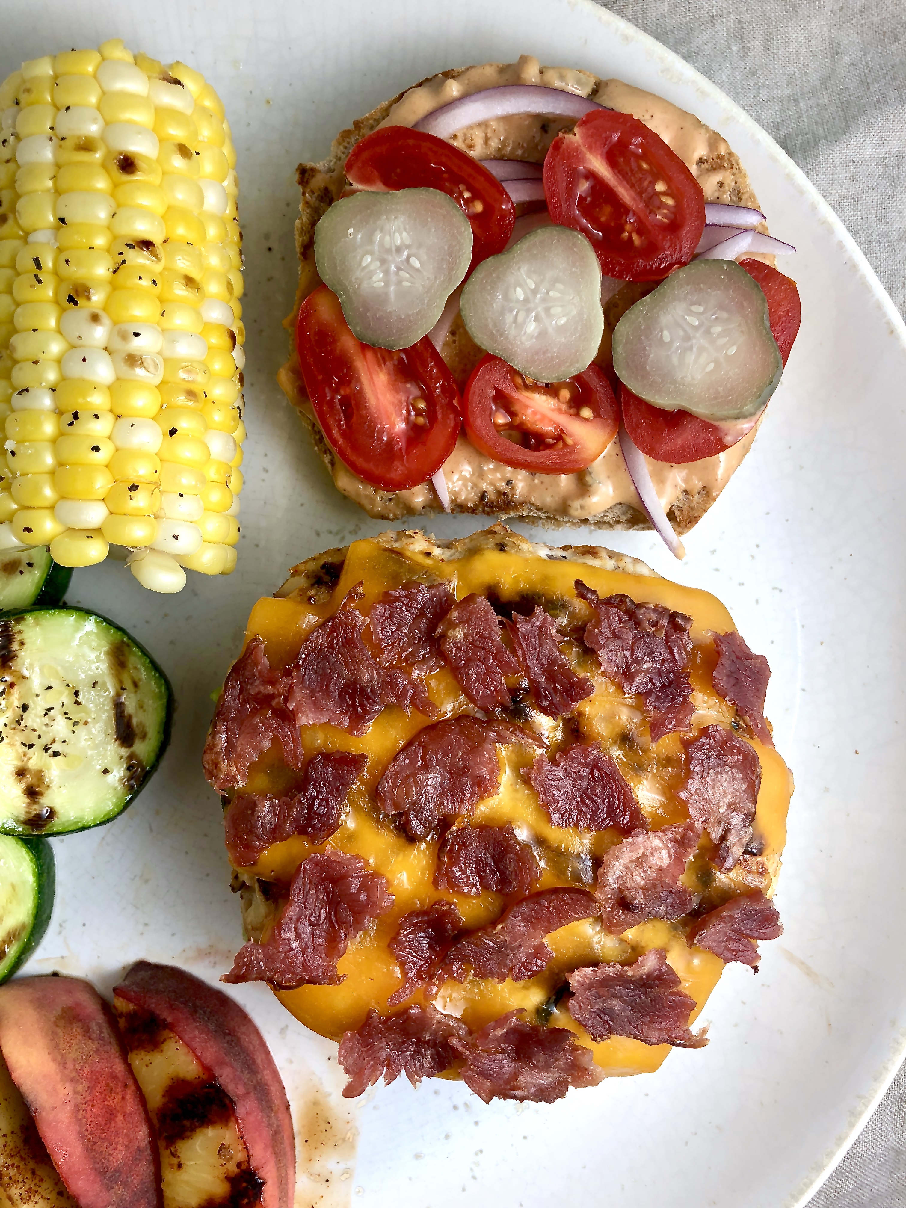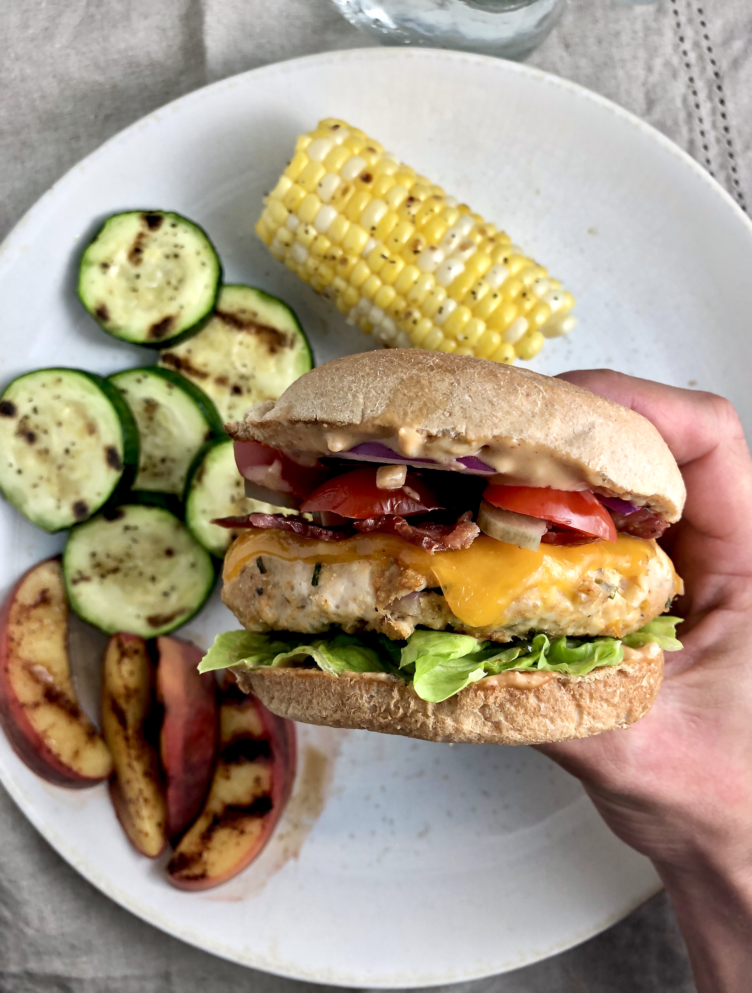 And to round out the meal, I also grilled up some summer favorites! Zucchini and sweet corn on the cob (lightly brushed with garlic-infused olive oil, finished with coarse sea salt and black pepper), and juicy ripe peach (sprinkled with chili powder before grilling, just a couple minutes per side).