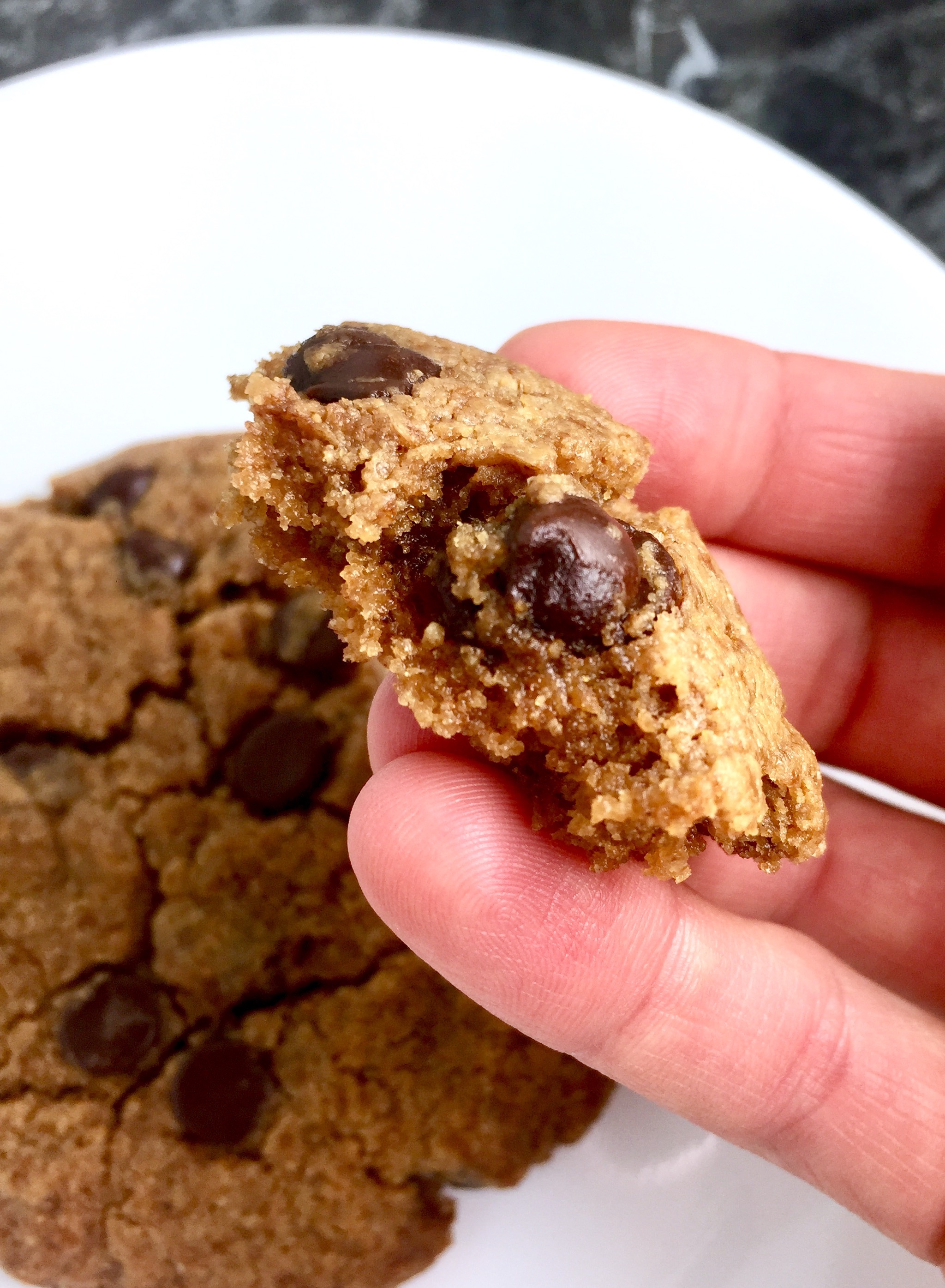 Nutrition information is calculated based on 1 medium-large cookie (1/10 recipe), using 1/4 cup Lakanto monk fruit sweetener and Lily’s dark chocolate baking chips.