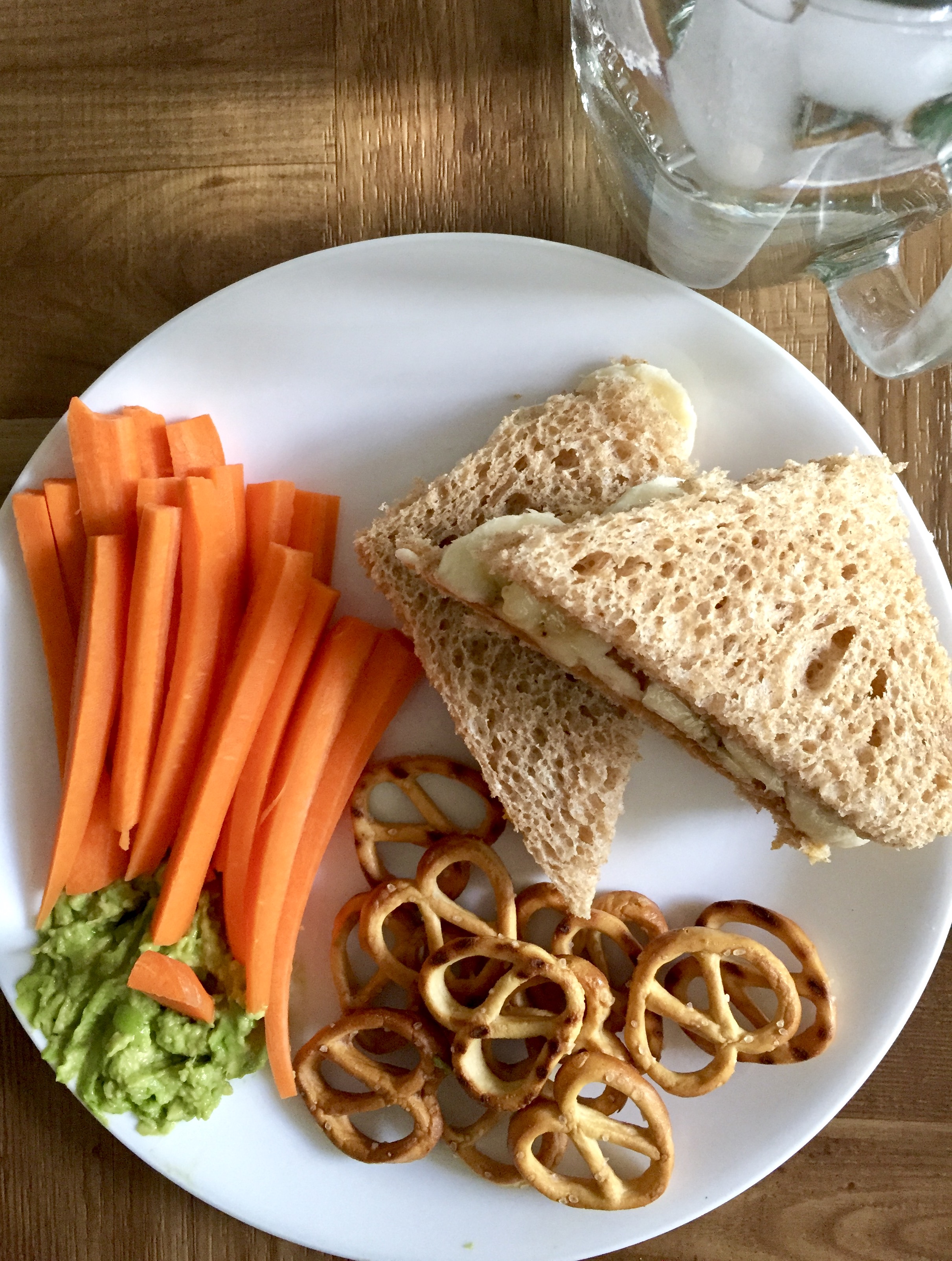 - 1 Tbsp peanut butter + 1/3 sliced banana + 1/4 tsp honey on soft whole wheat bread (such as Rudi’s Honey Sweet Whole Wheat)