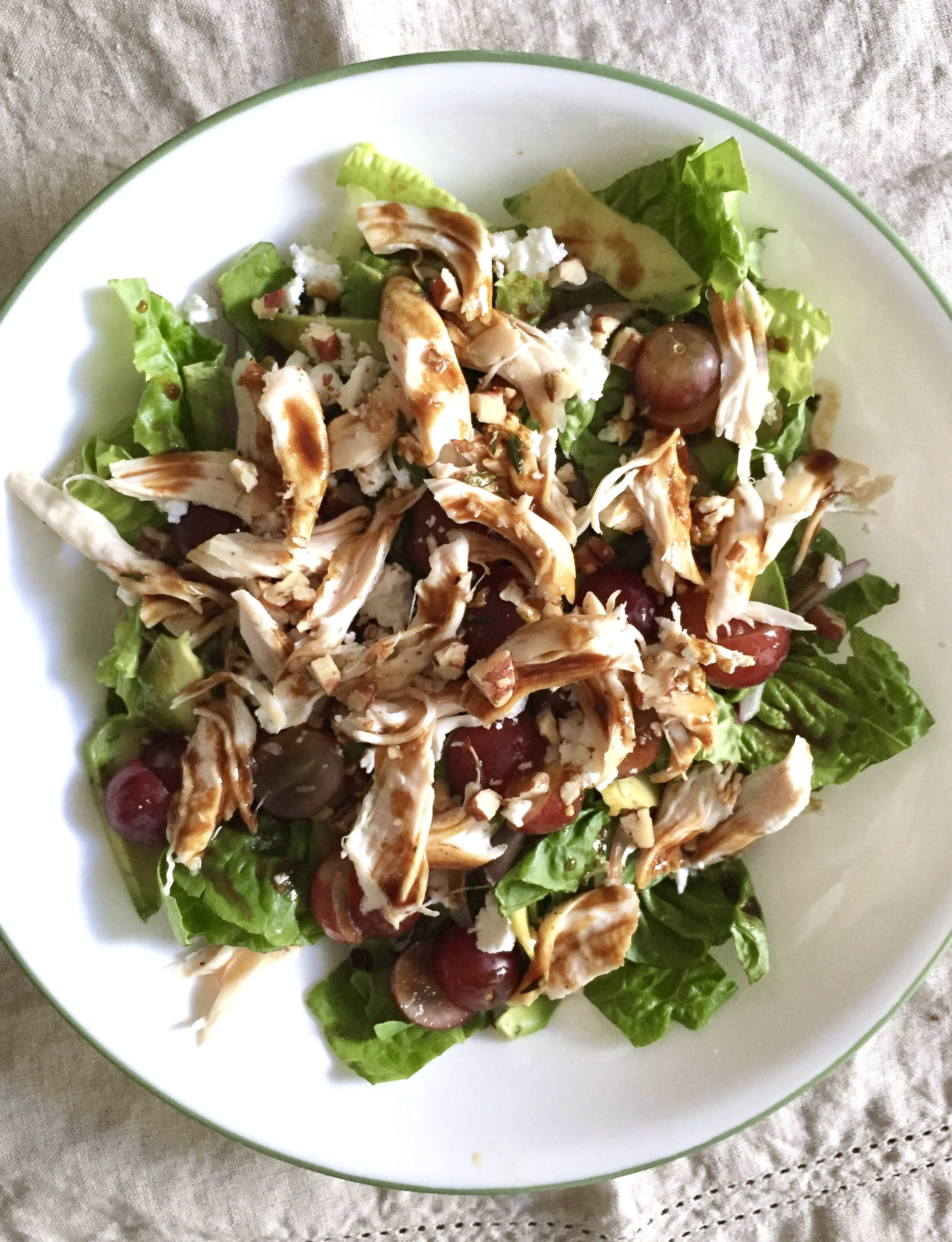 Salad: chopped Romaine, chicken breast (2-3 oz cooked on the stovetop with a little salt and pepper), red grapes (halved), crumbled goat cheese, sliced avocado, sliced red onion, and toasted pine nuts or chopped walnuts