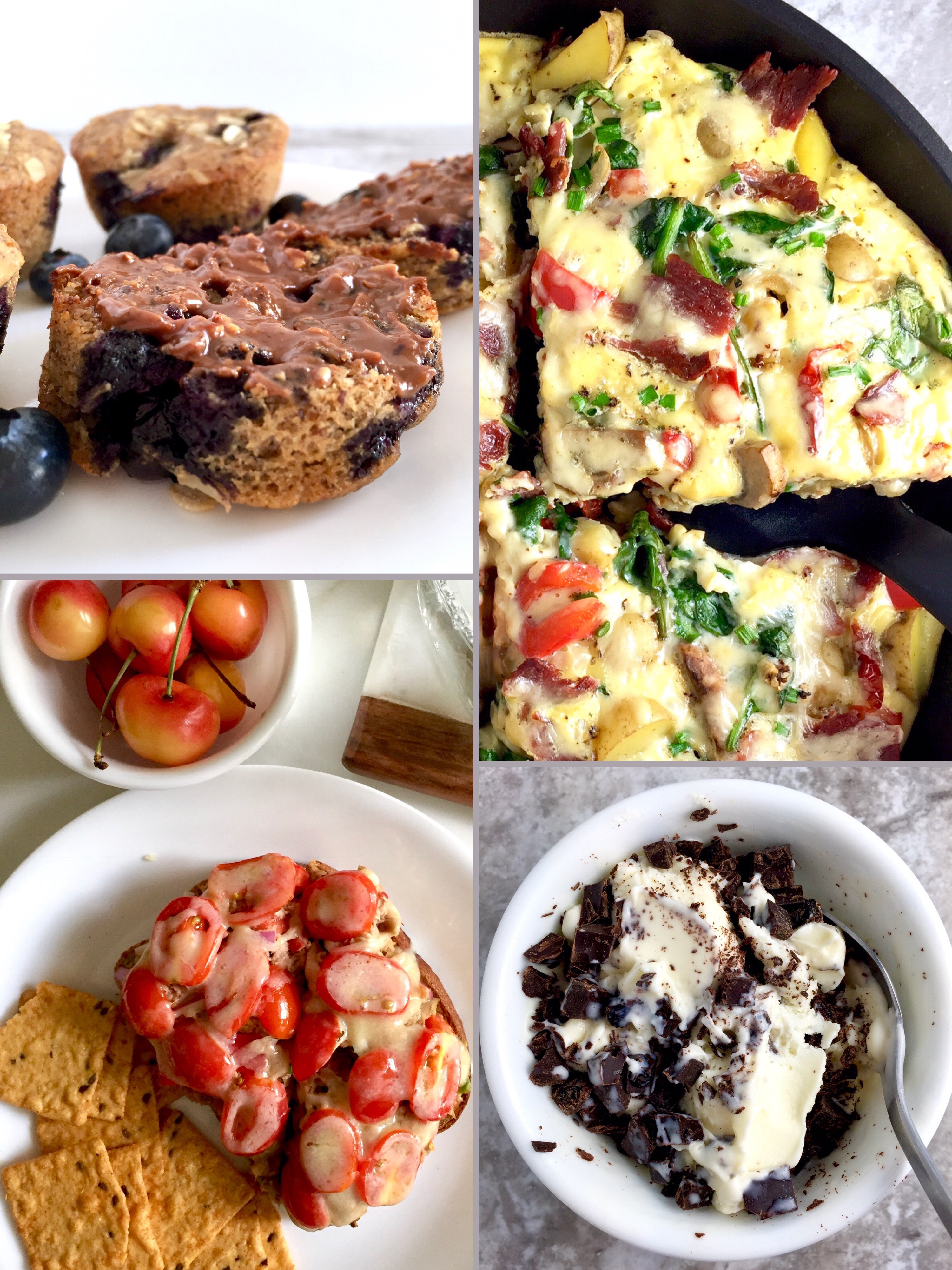 A glance at my Tuesday for easy, wholesome meal and snack ideas to help you conquer any weekday! Blueberry oat flax muffins, tuna melt, bacon sun-dried tomato veggie frittata, vanilla frozen custard, and more.