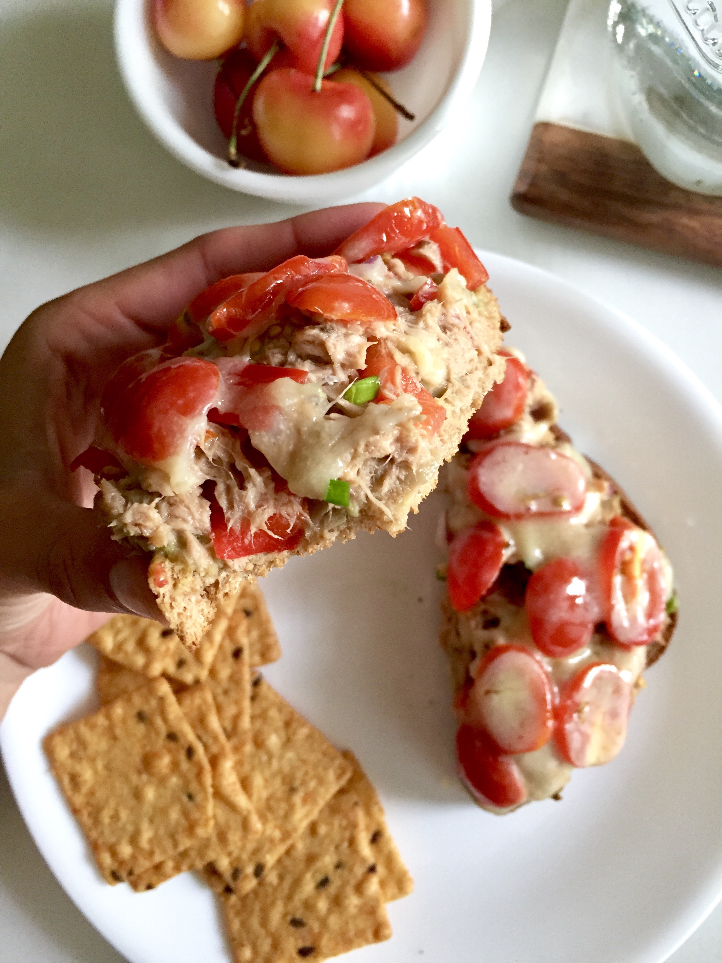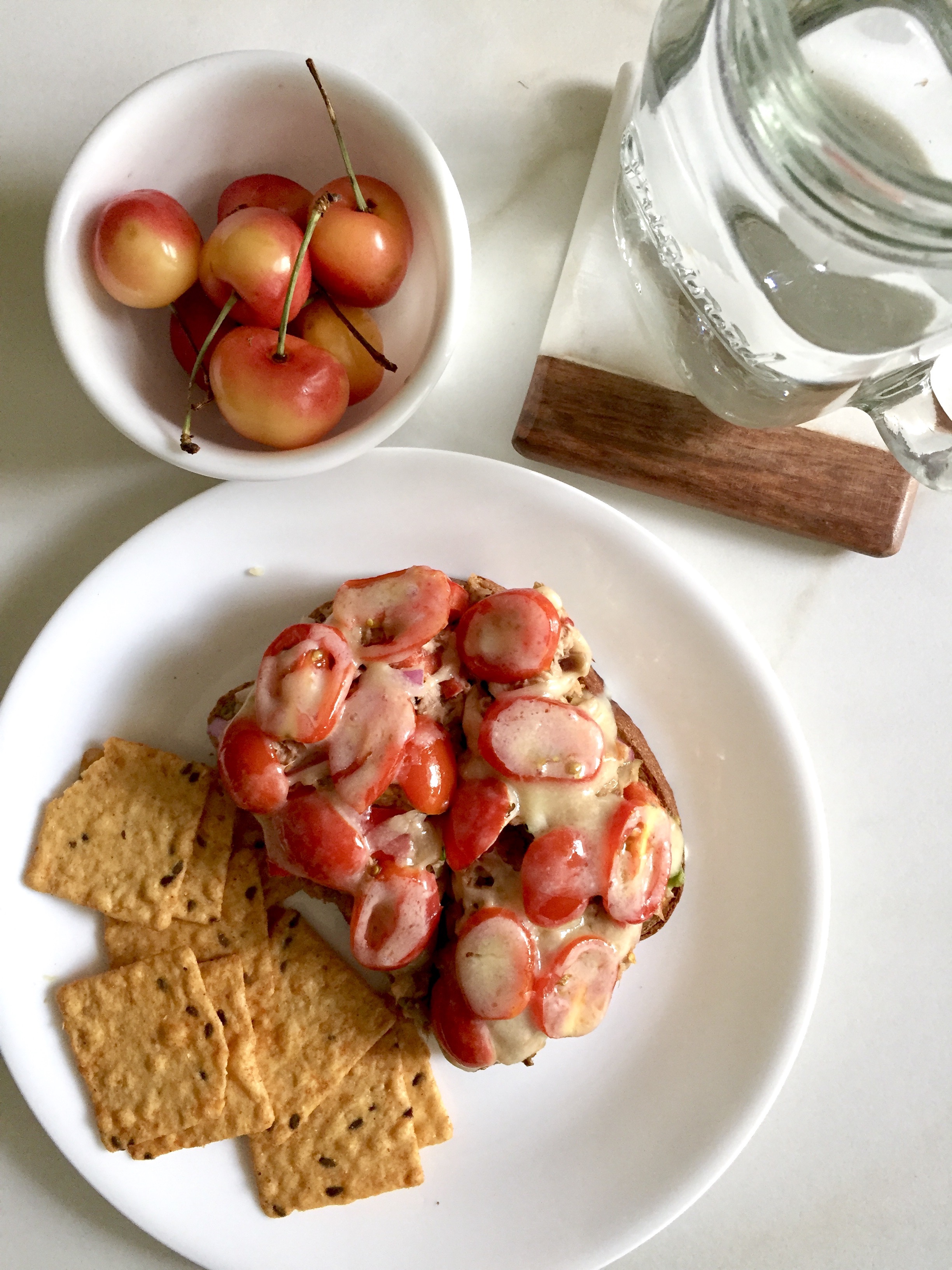 After I got home, I somehow managed to squeeze in a 20-minute power nap then jumped out of bed to get on this tuna melt. Almost identical to this tuna melt, but with white cheddar instead of smoked gouda, and thinly sliced grape tomatoes instead of sun-dried.