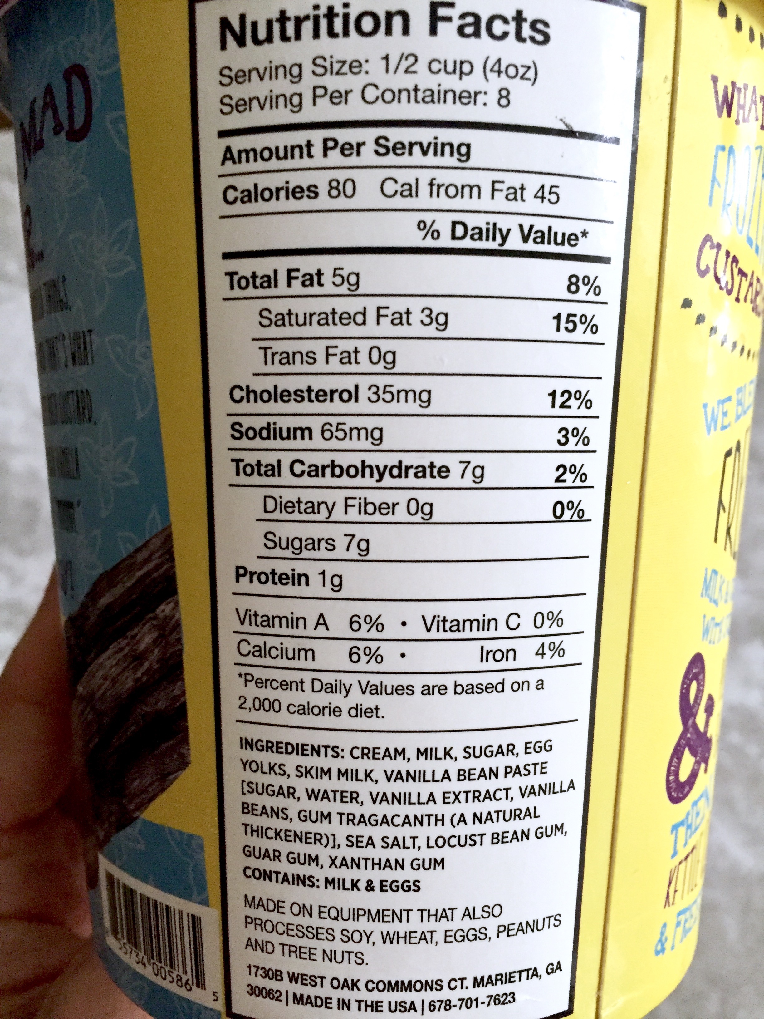 A necessity in my house. At Earth Fare I was excited to find my new frozen dessert obsession, Mad Jack frozen custard. As far as I know, it is sold exclusively at Earth Fare, but hopefully it will catch fire and get around to other stores. Because it makes me REALLY HAPPY. It’s like ice cream or gelato, but made with egg yolks and less sugary. In fact, there’s less sugar in a serving of this custard than in a glass of milk! But the ultra-rich, creamy texture goes above and beyond what the sugar would do.
